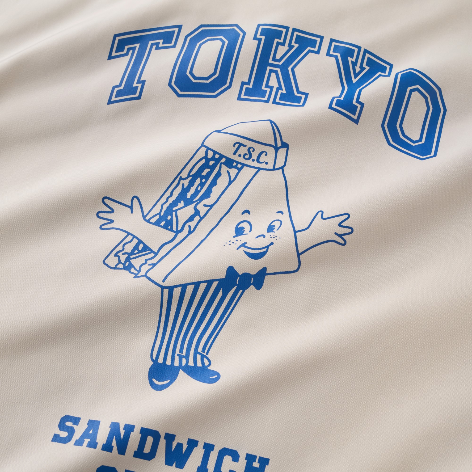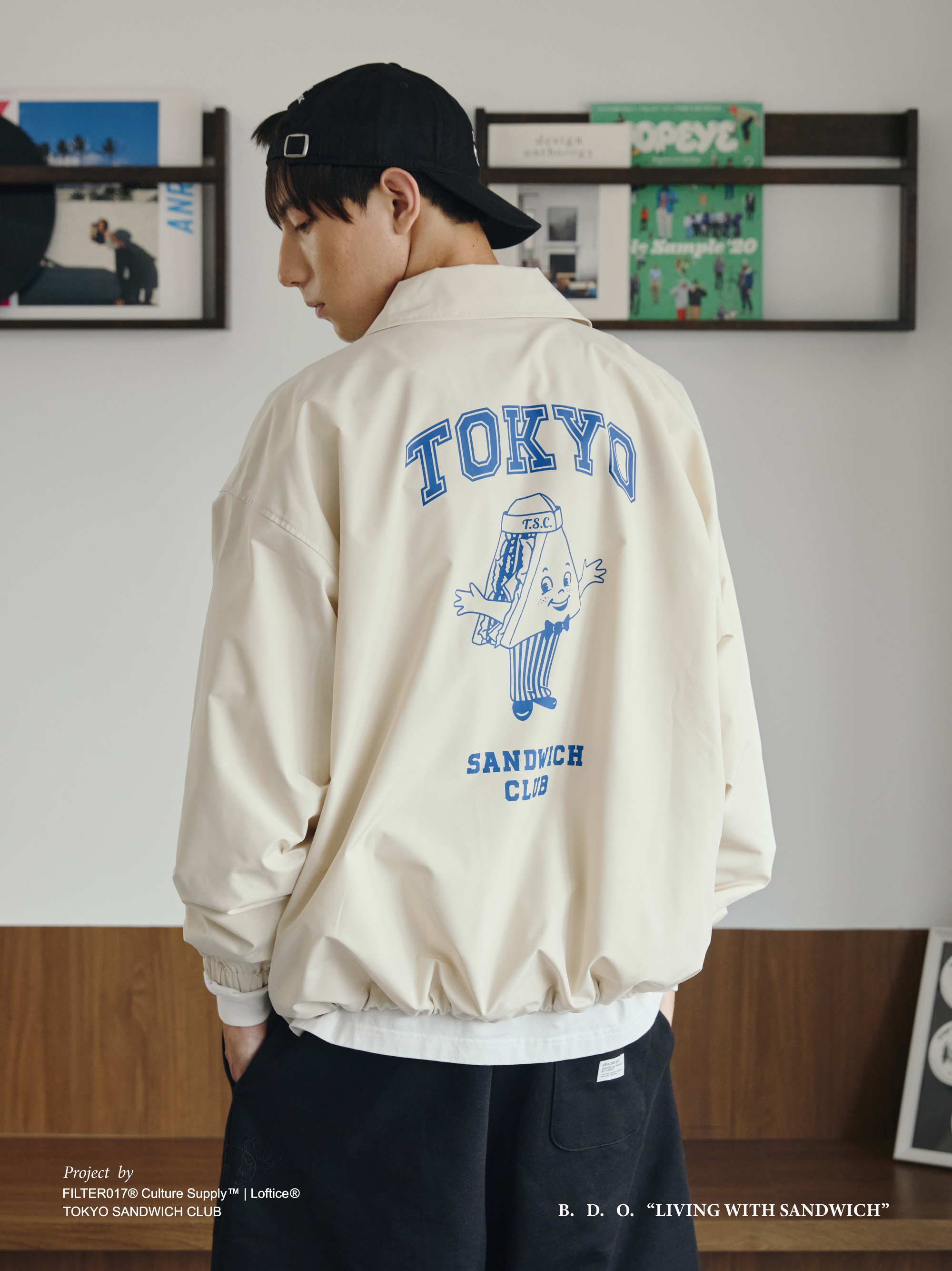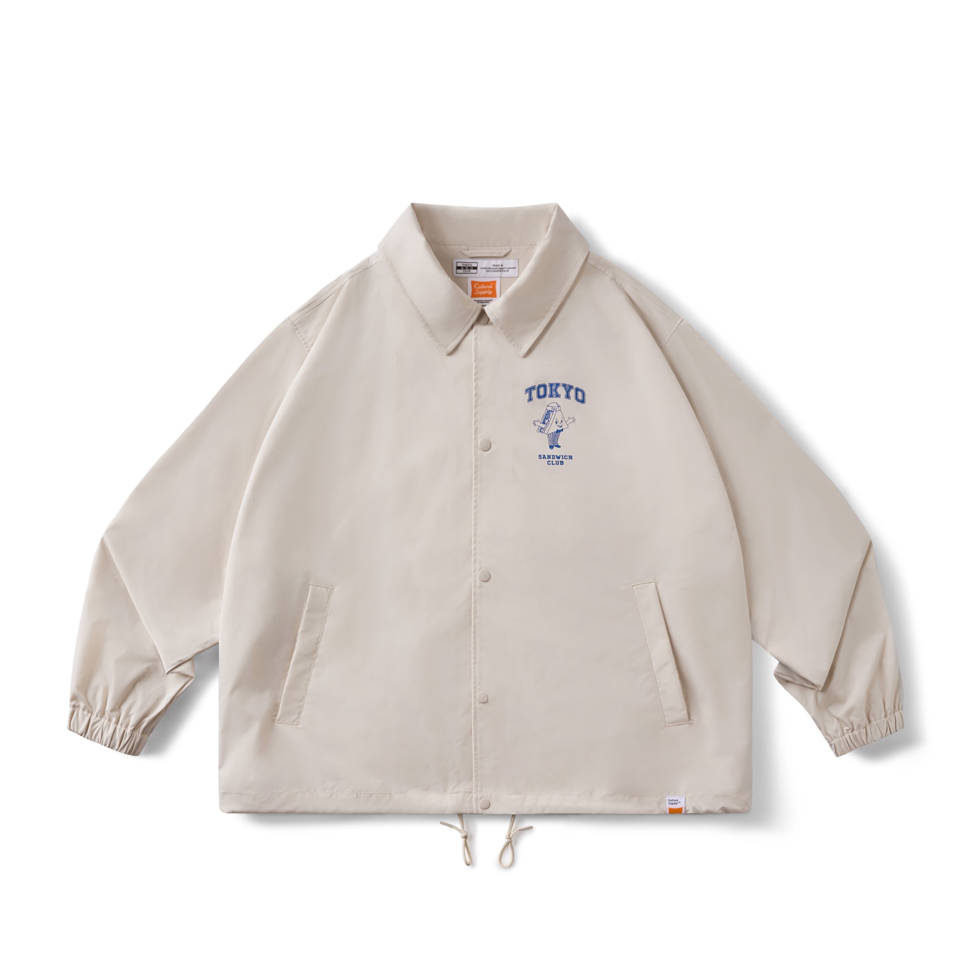 以Tokyo Sandwich Club 品牌經典三明治吉祥物圖像作為主視覺,版型採用美式運動教練外套樣式為考究基礎,將剪裁身形修改調整為時下流行的短襬落肩寬鬆輪廓,嚴選具有些許光澤感、輕量扎實的防潑水聚酯纖維面料,適合四季防風與層次搭配著用,為日常休閒帶來舒適隨性的穿搭體驗。