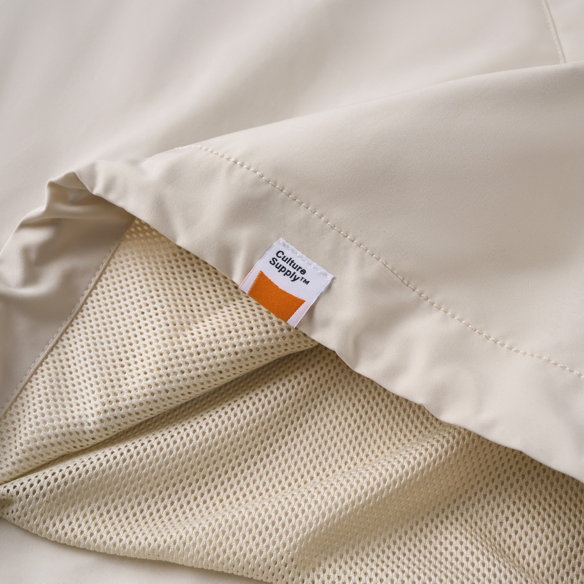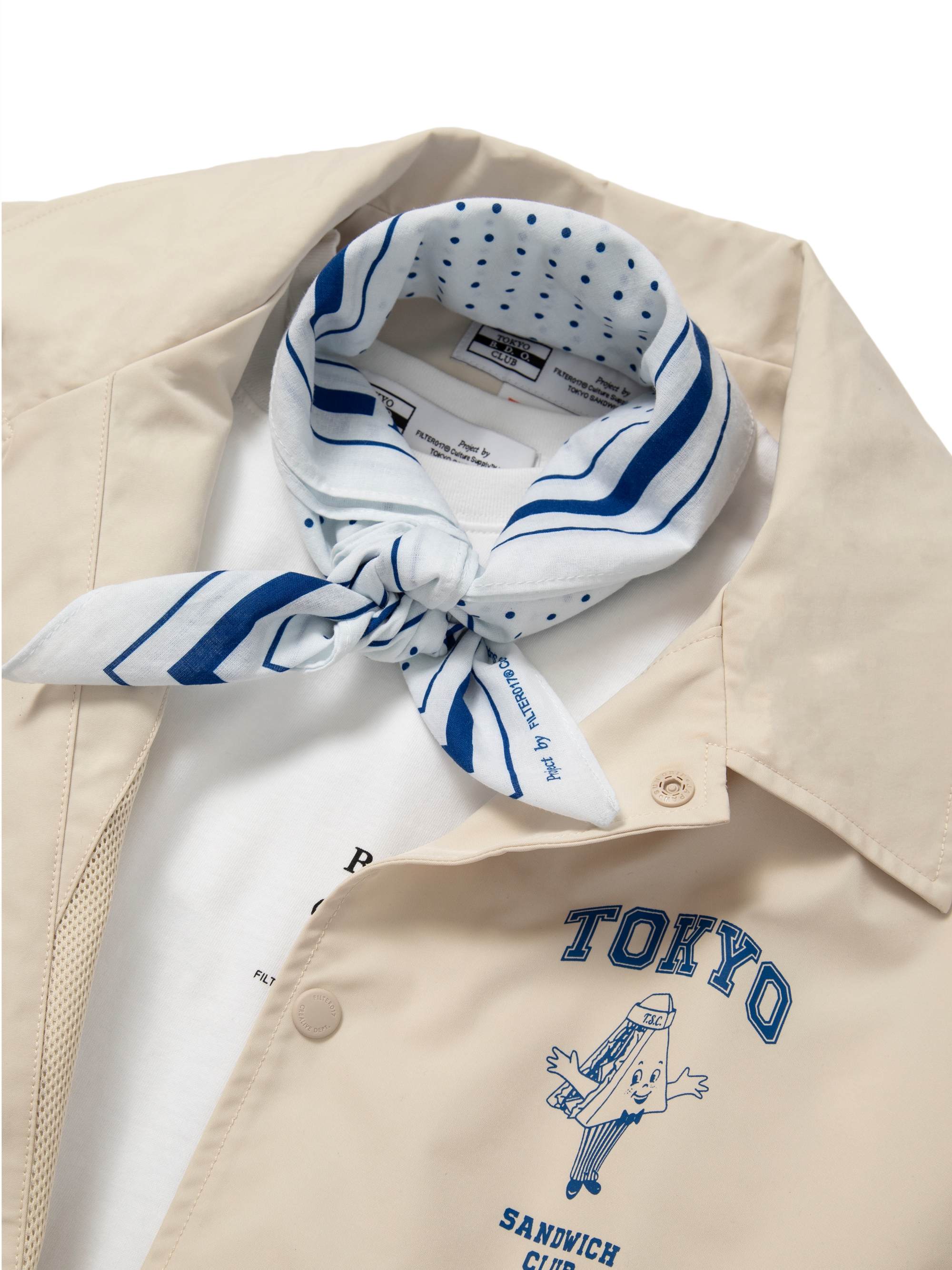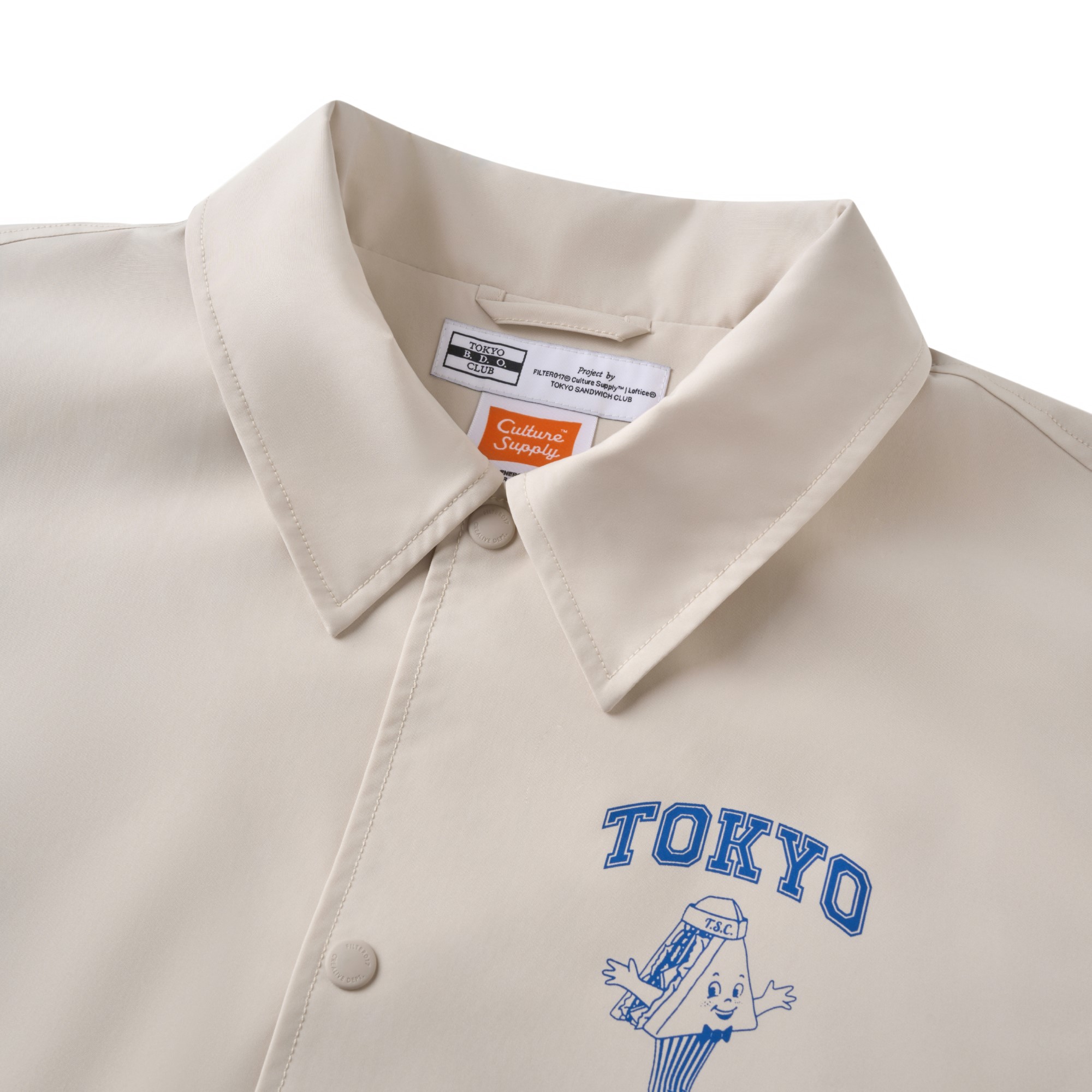 以Tokyo Sandwich Club 品牌經典三明治吉祥物圖像作為主視覺,版型採用美式運動教練外套樣式為考究基礎,將剪裁身形修改調整為時下流行的短襬落肩寬鬆輪廓,嚴選具有些許光澤感、輕量扎實的防潑水聚酯纖維面料,適合四季防風與層次搭配著用,為日常休閒帶來舒適隨性的穿搭體驗。