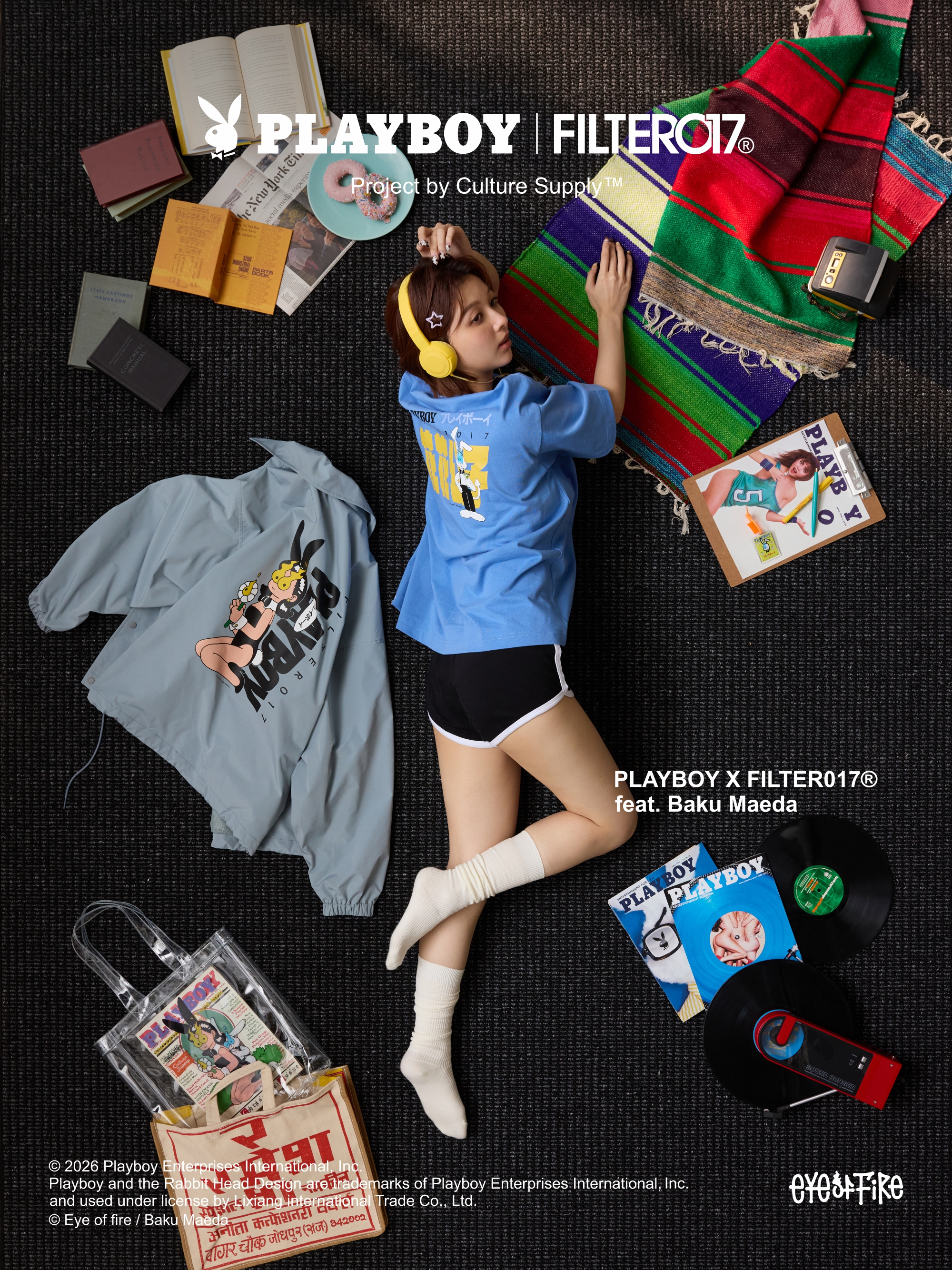 本次企劃專案由FILTER017® 主理人/藝術總監Enzo Lin 策劃主導,負責設計執行與創意統籌,並由品牌旗下文化藝術企劃單位Culture Supply™ 製作發行。核心聚焦以PLAYBOY 著名的經典成人藝術刊物作為重要文化起點切入,透過FILTER017® 擅長的元素混合與當代編輯設計語彙重新轉譯。插畫藝術家 前田麦 以其筆下標誌性的「EYE OF FIRE(火焰之眼)」詮釋PLAYBOY 最具代表性的兔頭Logo,以及紳士兔與兔女郎角色,將復古經典的雜誌封面意象於當代重新建構。