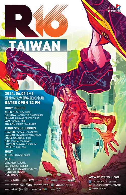 關於R16,賽事中文全名為R-16世界Bboy錦標賽暨現代青年文化節,R代表Respect尊重,16則代表參與盛會的16個國家,剛開始的R16只是一個世界級的Bboy比賽,賽事從2007舉辦至今,已經從一個頗具規模的街舞年度盛會到尋求可以讓這個活動整合城市年輕文化及城市藝術為核心發展主軸。被設計成為世界平台的R-16,其宗旨就是要讓全世界不一樣的文化皆包含在內並且連接成無邊界的環境及賦予成長的動力及分享深具創意的知識。不僅如此,R-16更提供一個平台可以讓大家得到啟發與訓練自我無限制的選擇,進一步增加生活樂趣及透徹自我的意識。