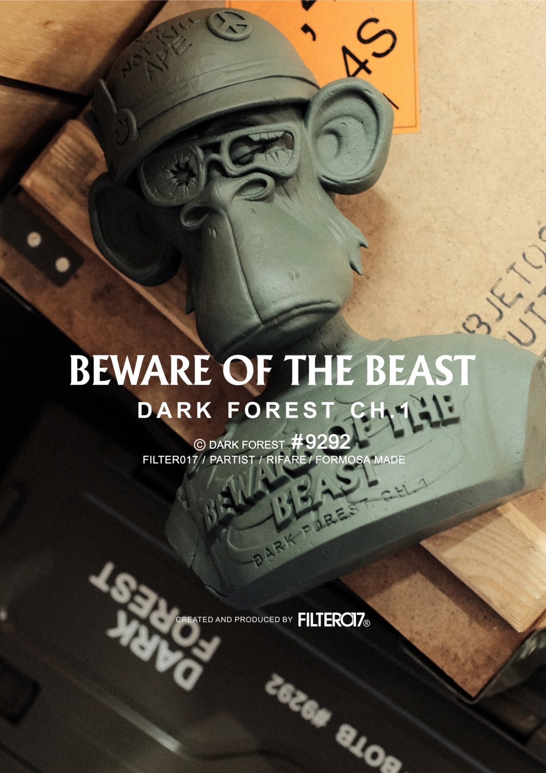 作品其中巧妙致敬 Rise of The Planet of The Apes 、Full Metal Jacket 等經典電影元素,藉由潮流、次文化流行符號與黑色幽默的手法包裝,詮釋反映當下這個煙硝四起的動盪世代與緊繃的世界局勢,同時也反諷與調侃對於 Web3 與 NFT 潮流大起大落的現象,希望進一步彼此激勵與進而反思,無論處於戰爭威脅的人民,亦或幣圈投資者,時刻惴惴不安猶如生活在伸手不見五指的黑暗森林中,隨時可能成為被狩獵的對象,必須時刻提醒自己「BEWARE OF THE BEAST」。