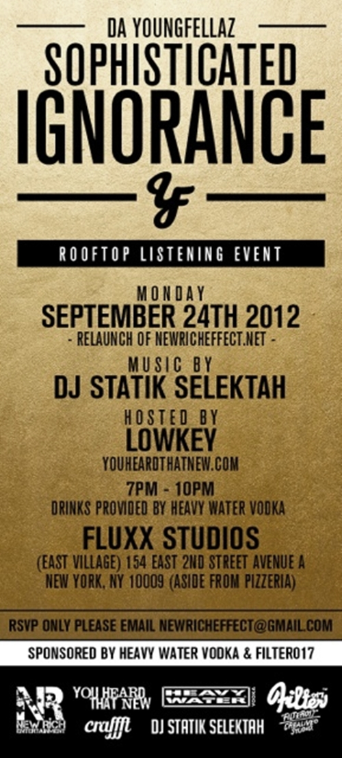 Filter017友好單位-位於紐約布魯克林的饒舌團體「Da Youngfellaz」,於9/25在Fluxx Studio頂樓舉辦了全新MIXTAPE-《Sophisticated Ignorance》試聽發表會,活動演出由DJ Statik Selektah及Da Youngfellaz搭檔演出,並由Heavy Water Vodka贊助飲品。