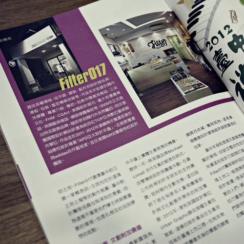 感謝台中市政府文化局,於2012 7月所發行的文化台中季刊中以專文詳盡報導介紹Filter017台中概念店!