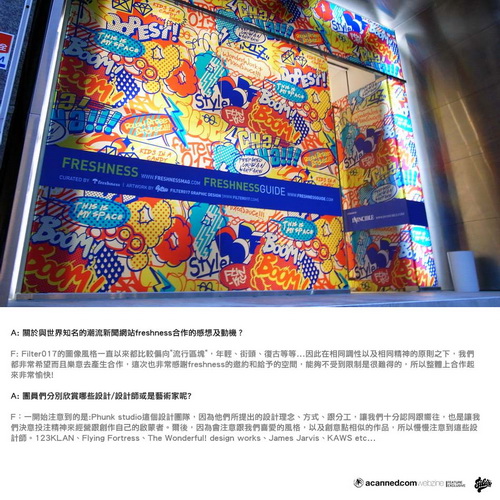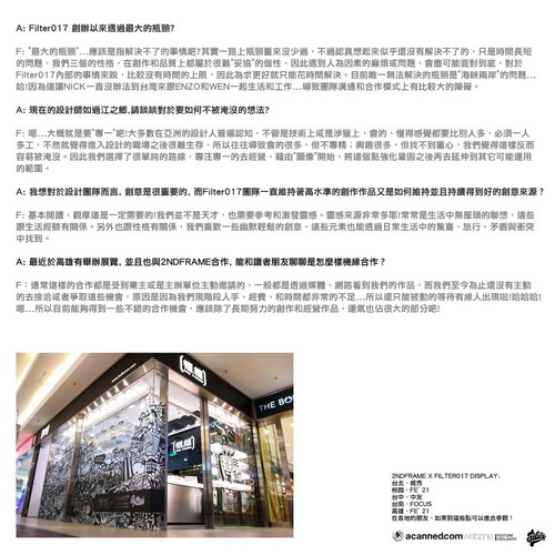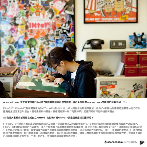 非常感謝華人流行文化網路媒體 acanned.com 的專訪邀請,Filter017團隊經過了長久以來的努力,始終希望能夠在路線上不只得到設計以及圖象創作同好的認同,更希望能夠結合流行這個區塊,得到流行文化這個區塊的肯定。