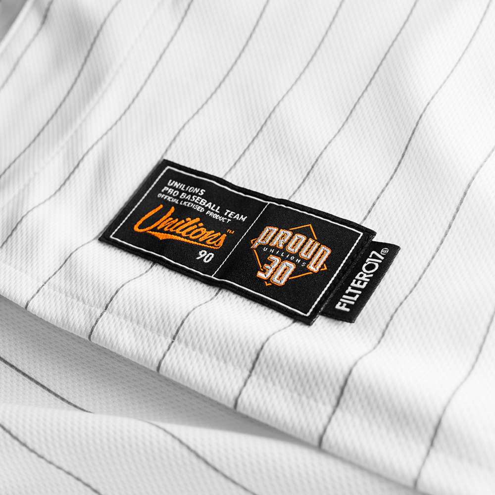 三十周年球衣本體配色以白底為主,融合統一獅經典條紋元素,