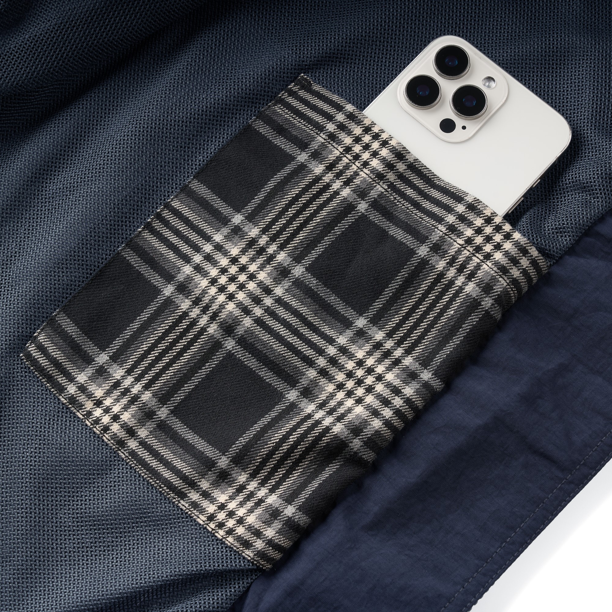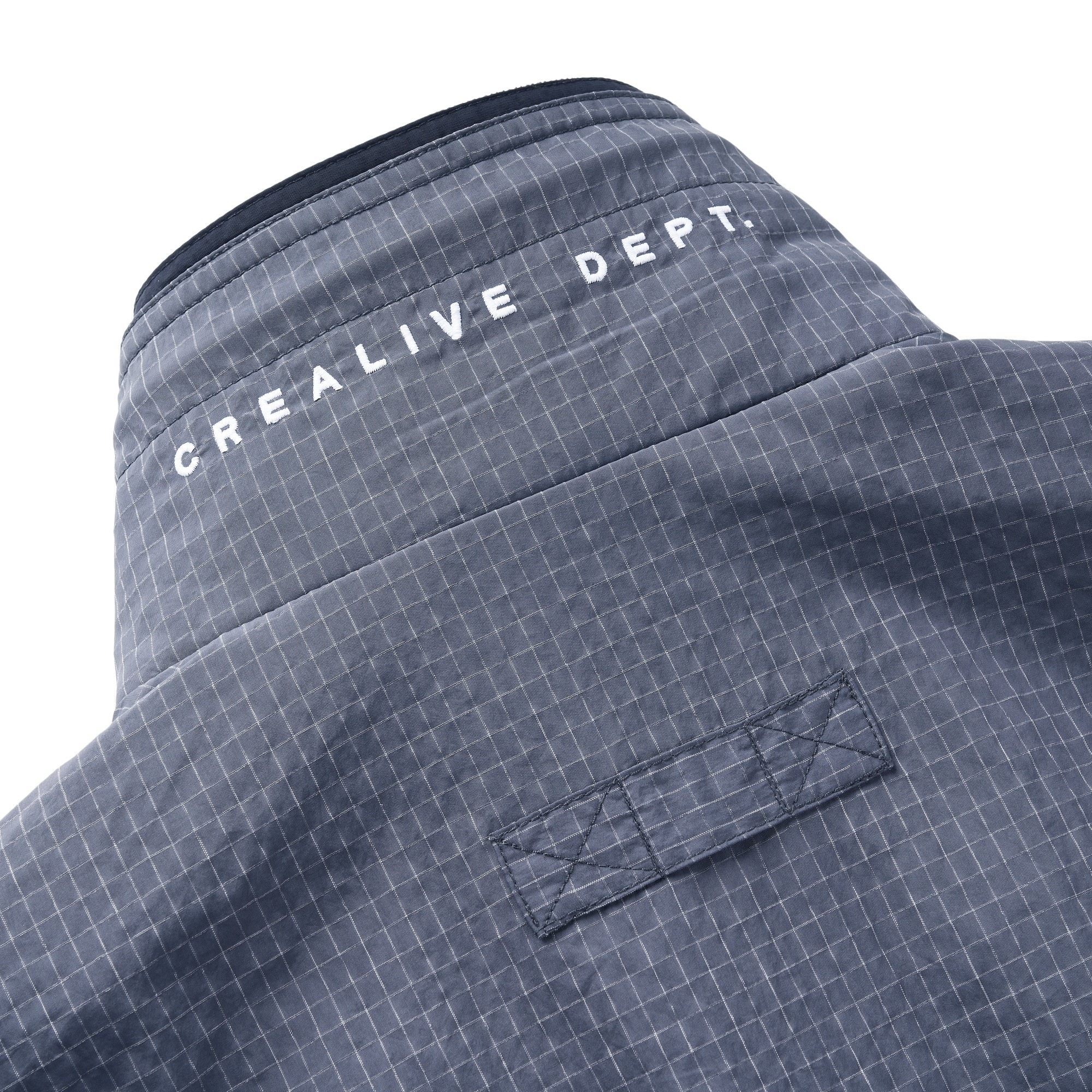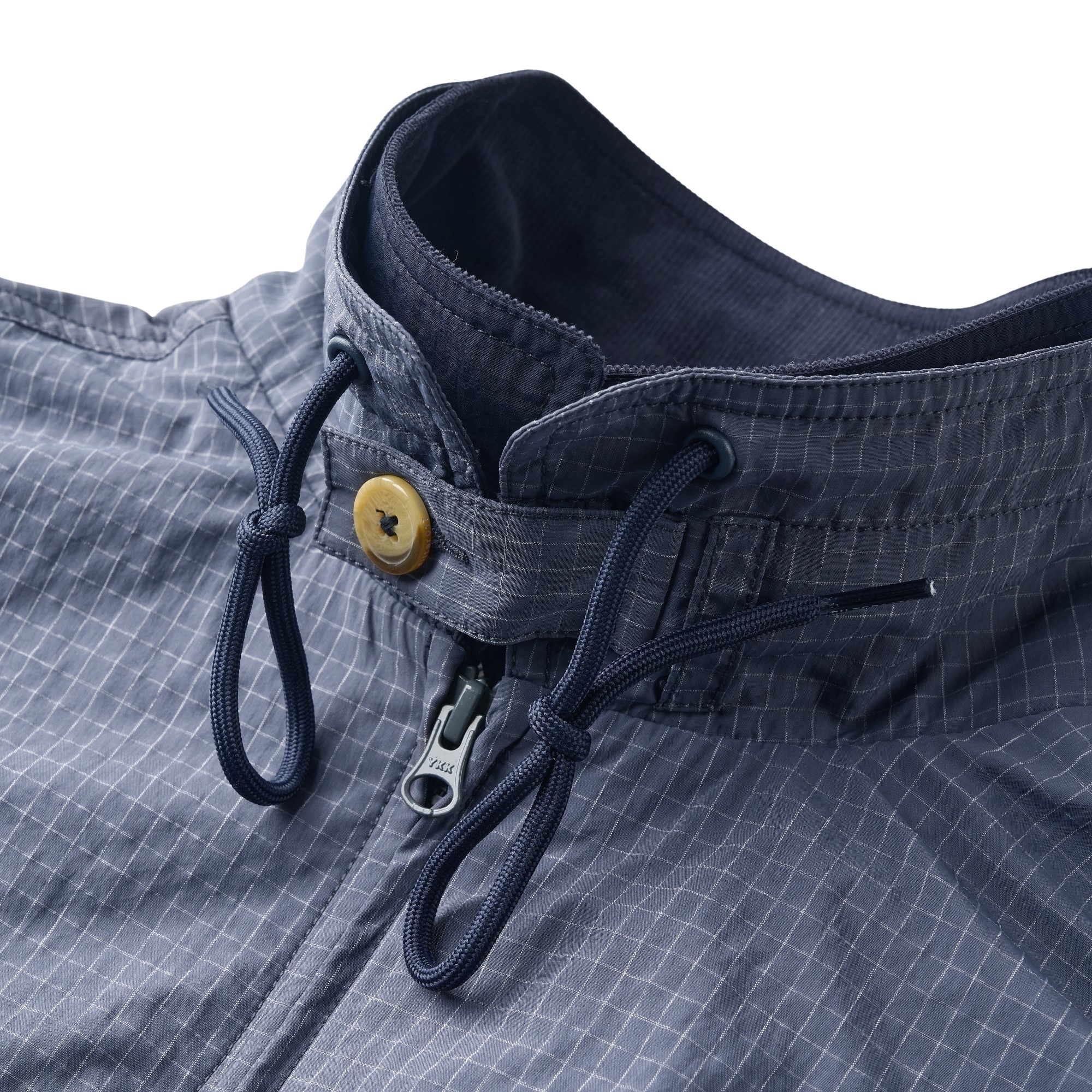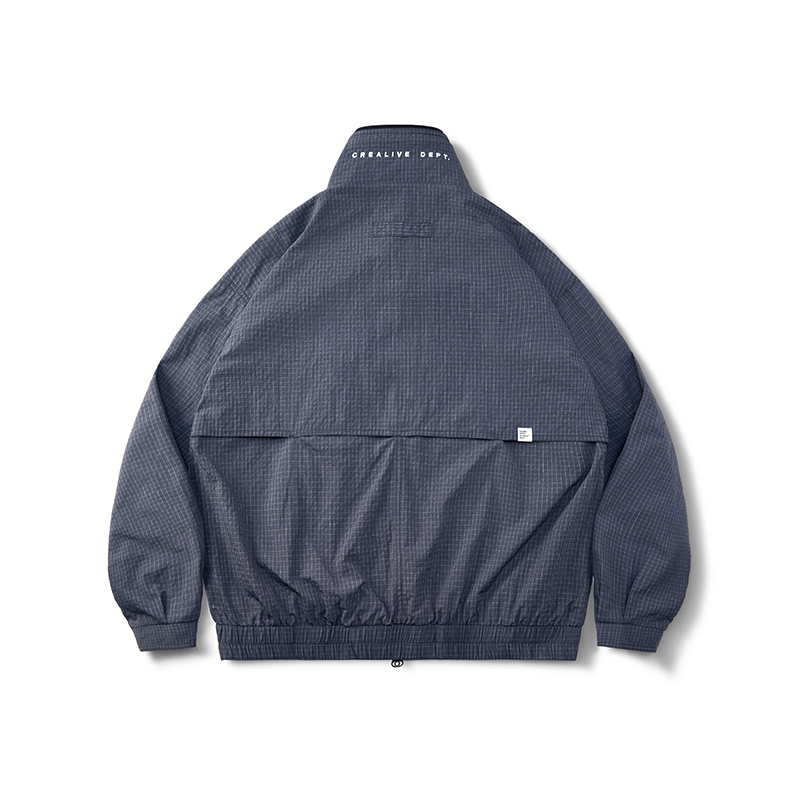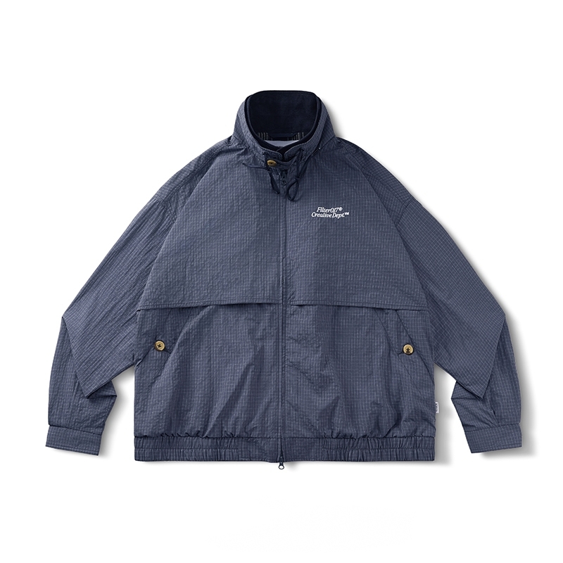 面料使用上則充分銜接流行性與區域氣候,因應亞洲地區多功適用機能,以輕量、防風、防潑水的平織格紋抗撕裂尼龍材質為主體,大面積細目透氣網布內裡及前後蓋片式透氣剪裁設計,穿著搭配與情境轉換實用度上更為靈活便利,滿足防風與搭配層次需求且四季皆宜。背後立領及胸前以精緻工藝刺繡,領口調節裝飾綁繩以品牌字樣包頭設計,更是展現滿載質感與誠意。