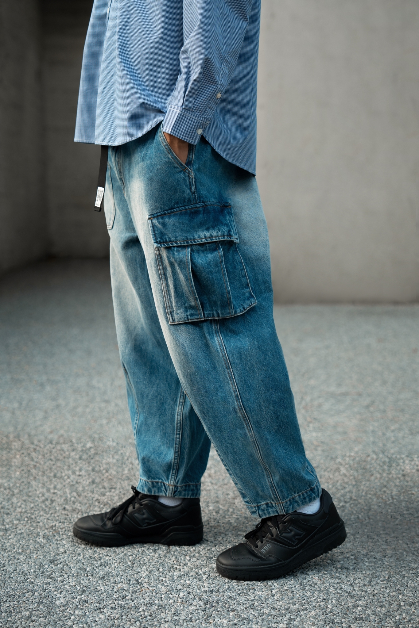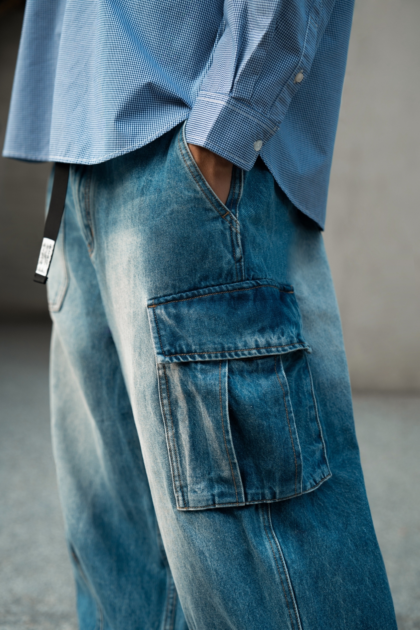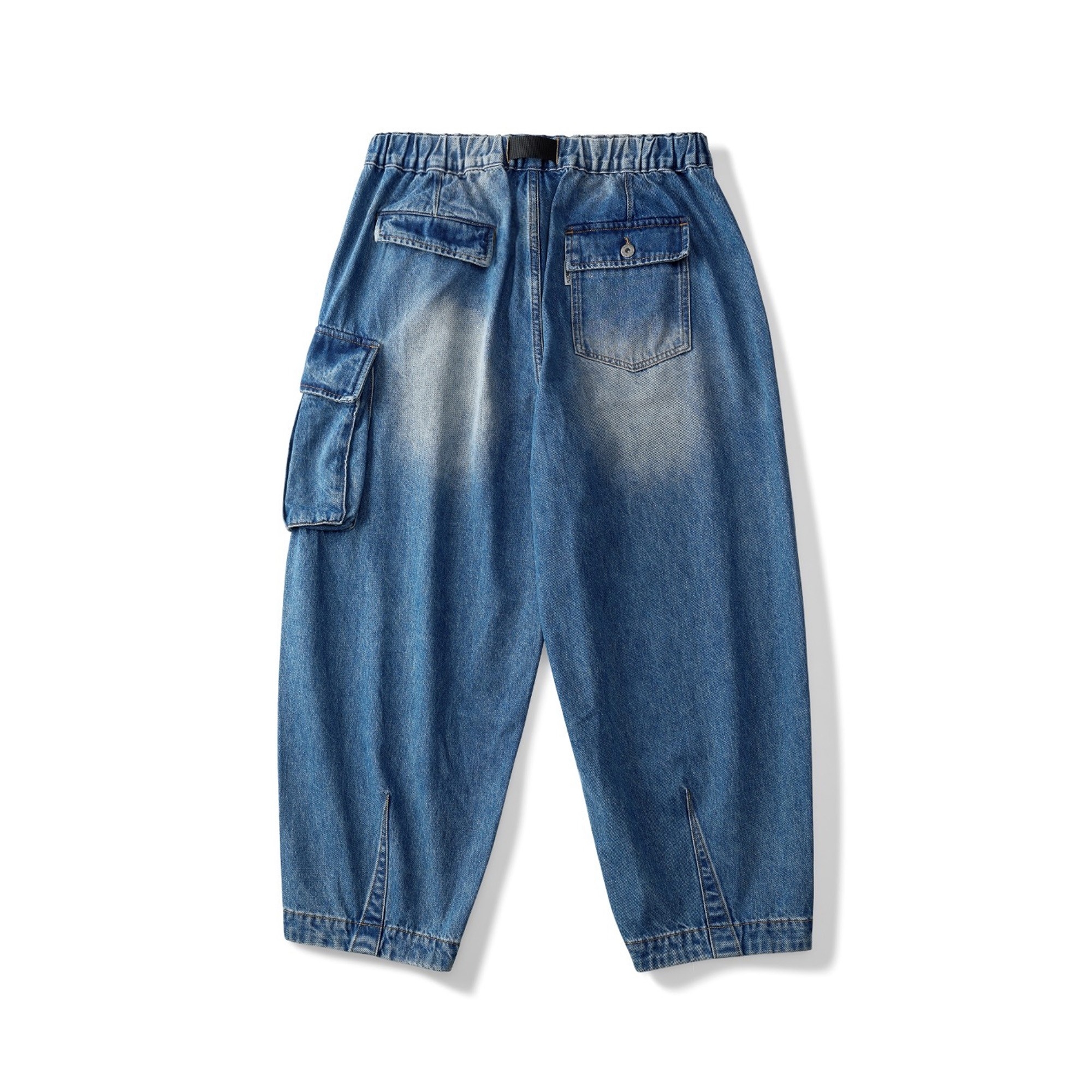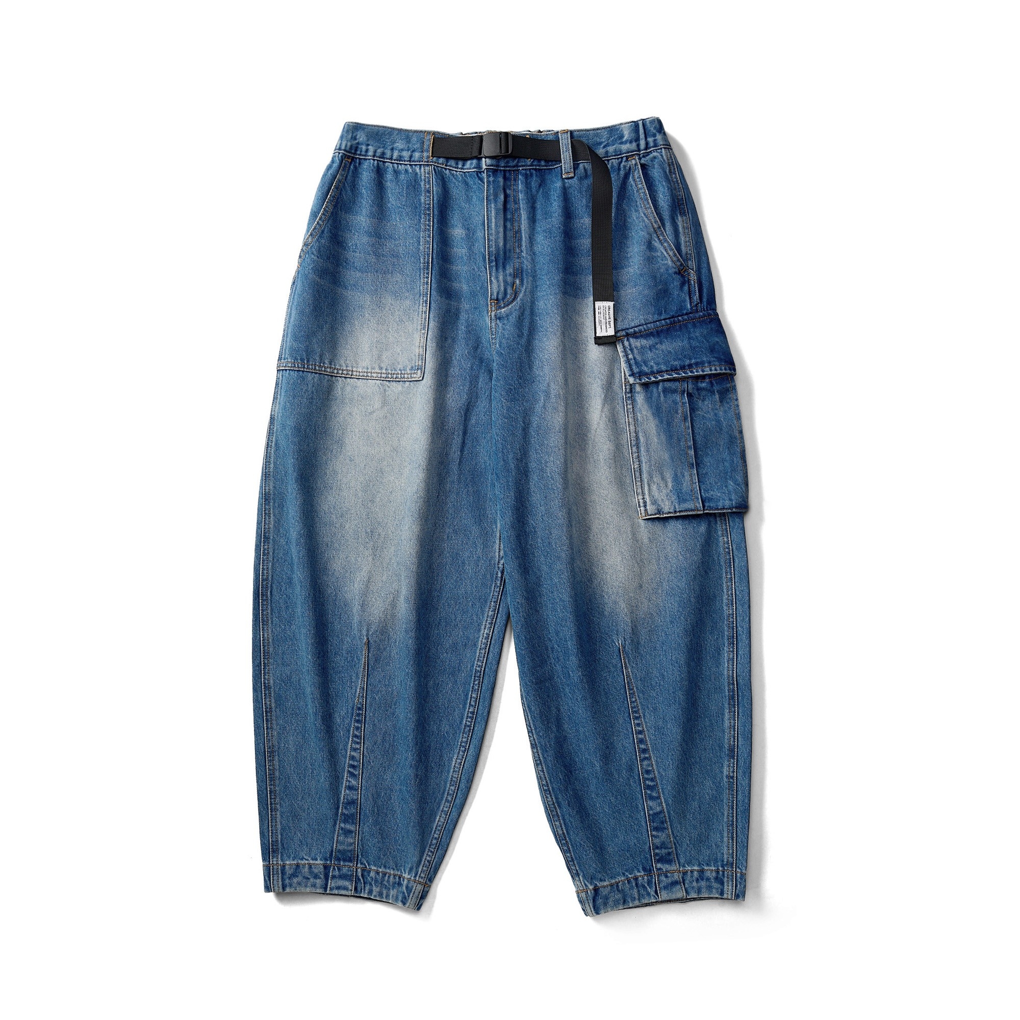 水洗丹寧不對稱拼接錐形軍褲