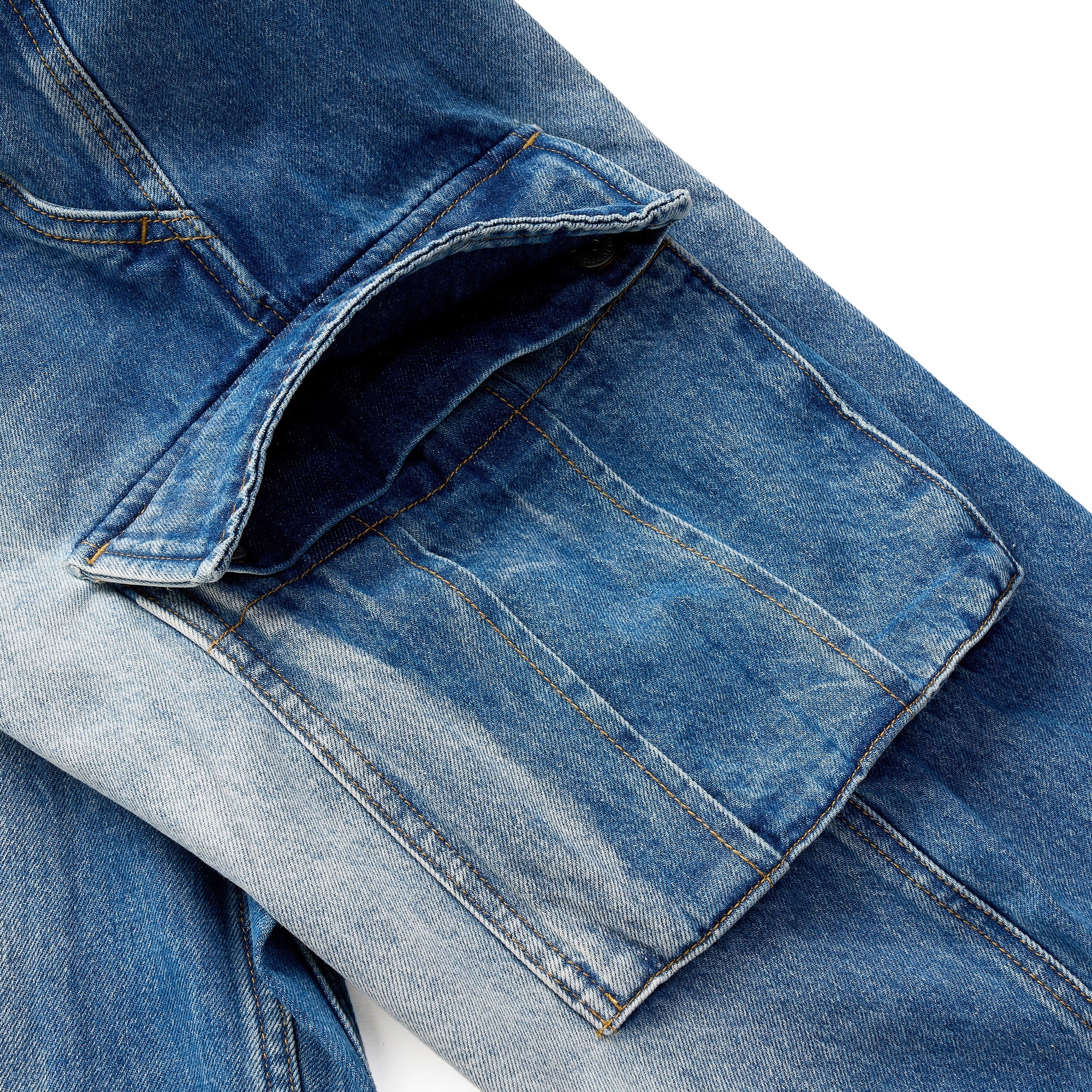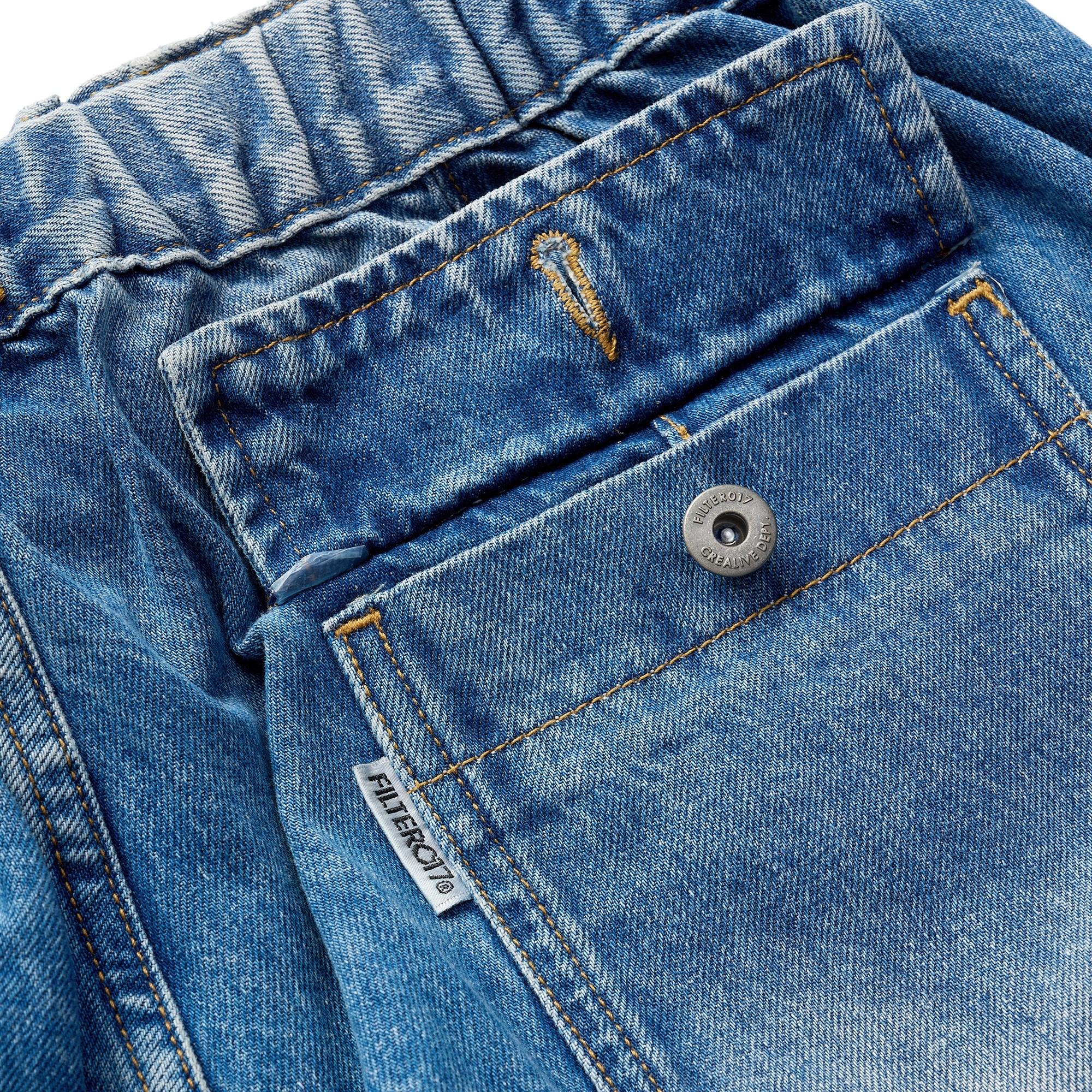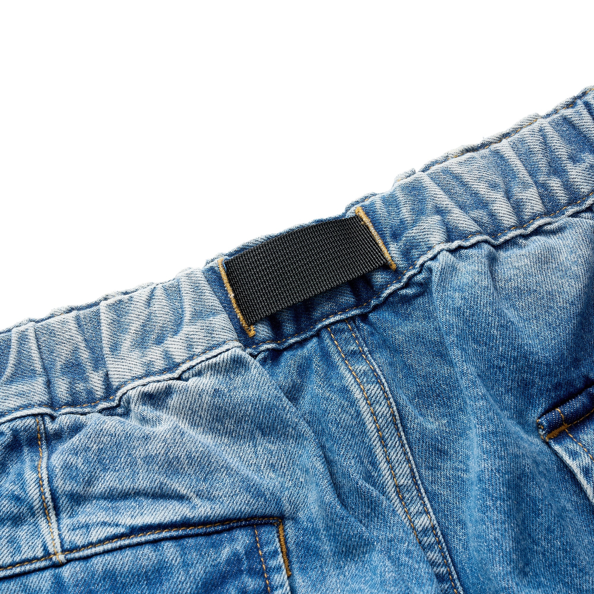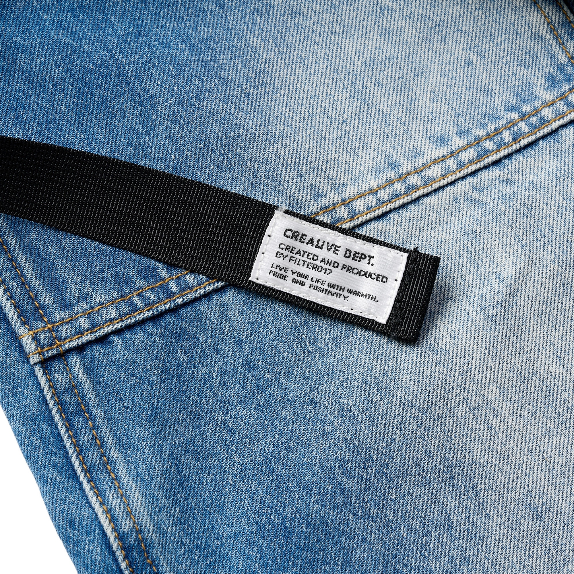 採用高磅數丹寧布料製成,透過酵石洗舊加工呈現自然的落色洗鍊層次,縫線細節部分強化處理增加耐用性,使用YKK®金屬拉鍊,隱蔽式卡扣腰帶可依不同體型進行調整,腰部脇邊內層兩掛環方便洗後晾掛。