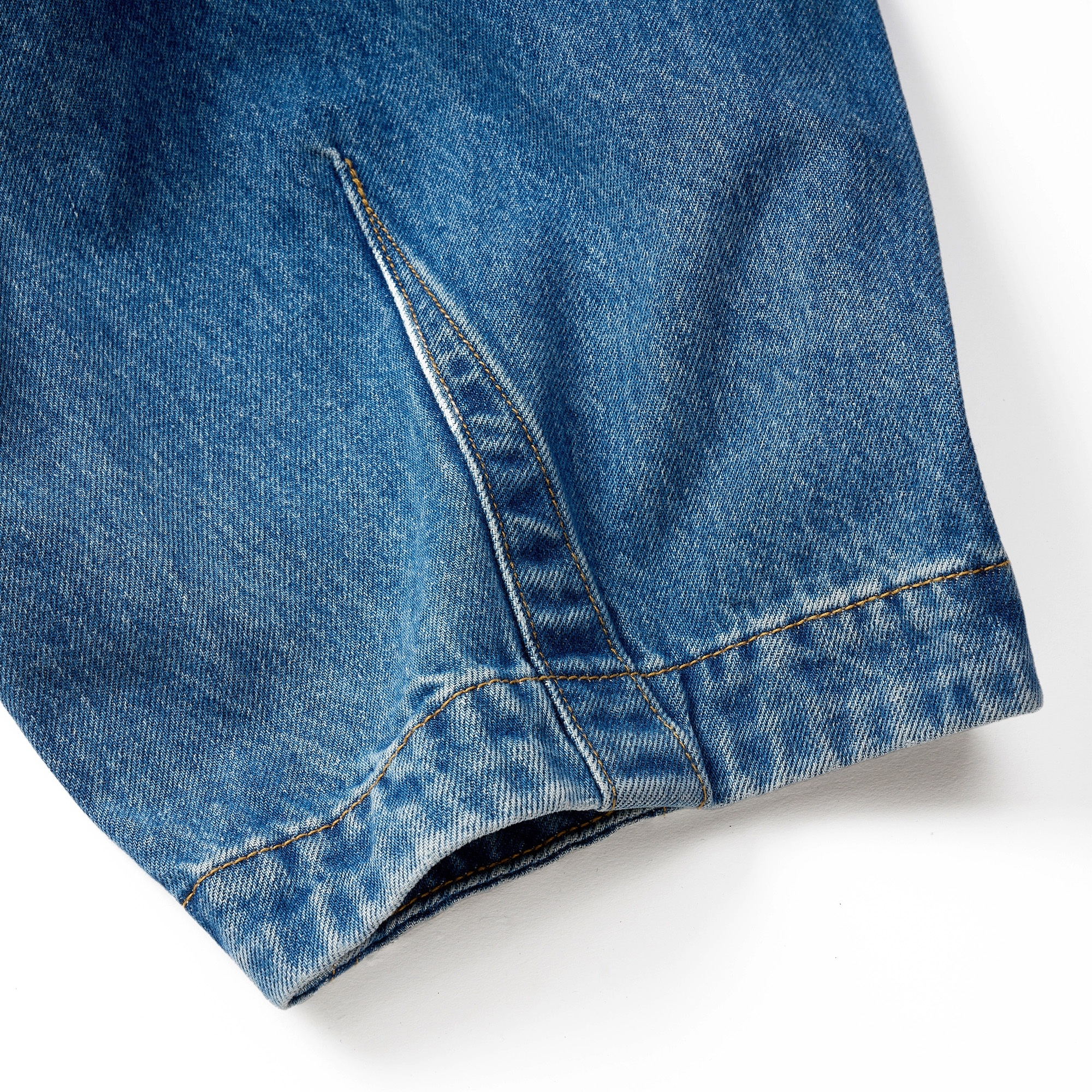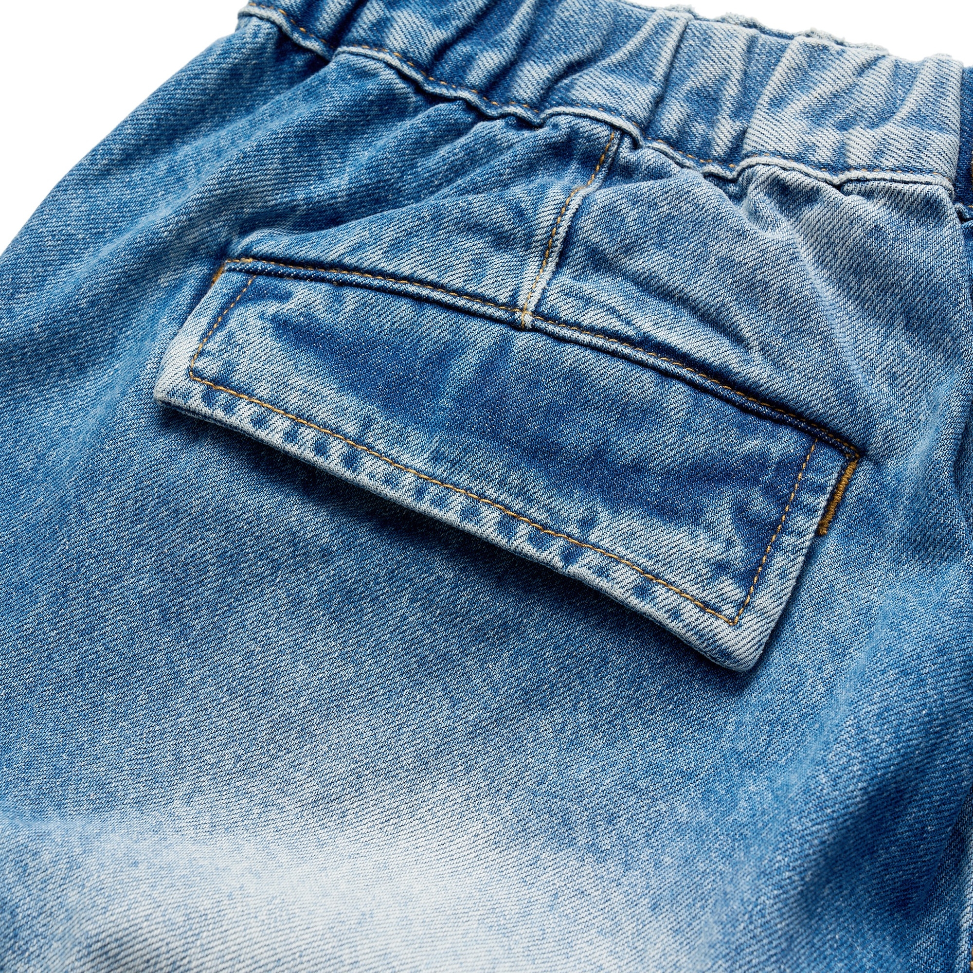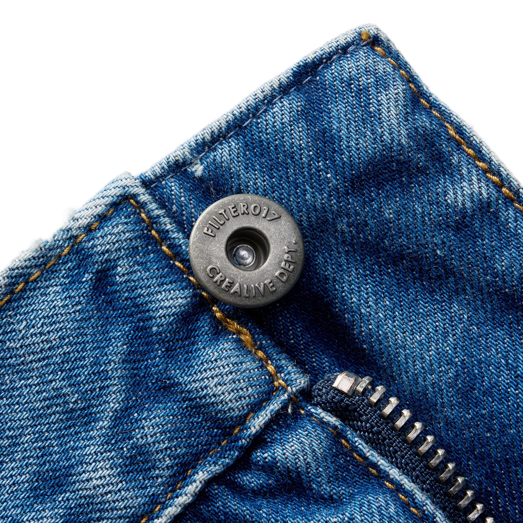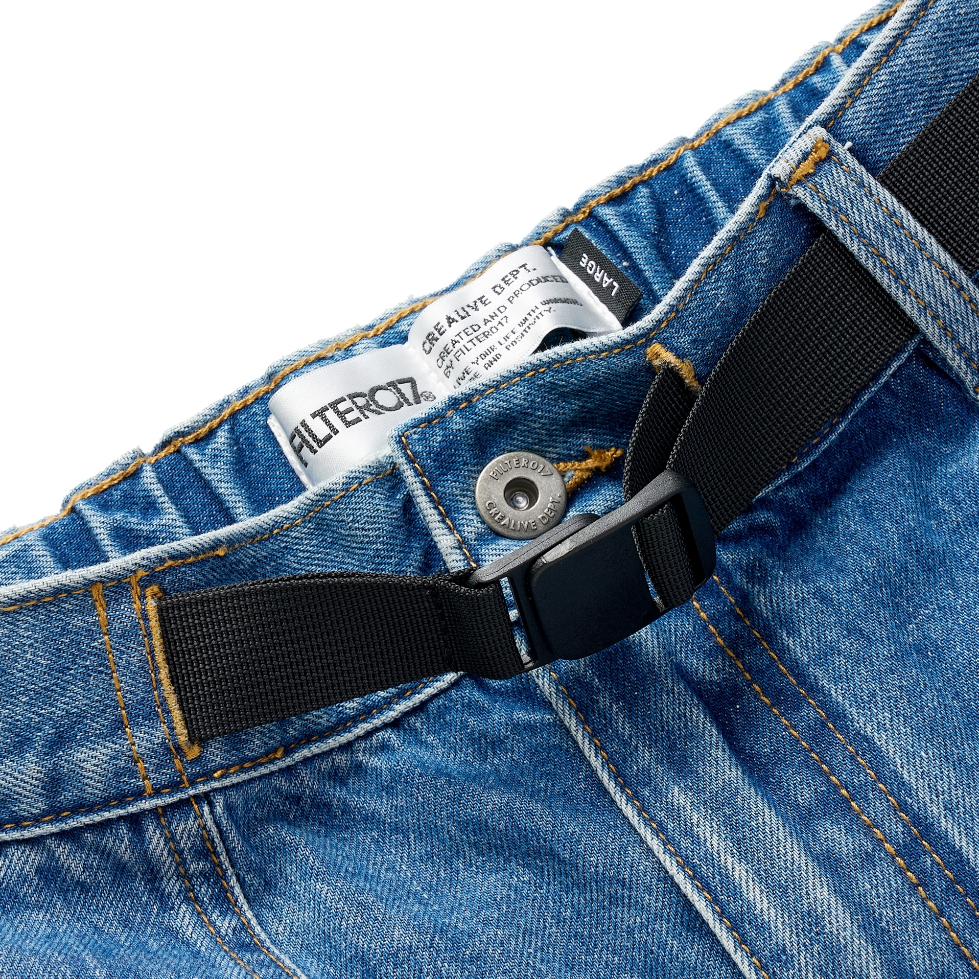 採用高磅數丹寧布料製成,透過酵石洗舊加工呈現自然的落色洗鍊層次,縫線細節部分強化處理增加耐用性,使用YKK®金屬拉鍊,隱蔽式卡扣腰帶可依不同體型進行調整,腰部脇邊內層兩掛環方便洗後晾掛。