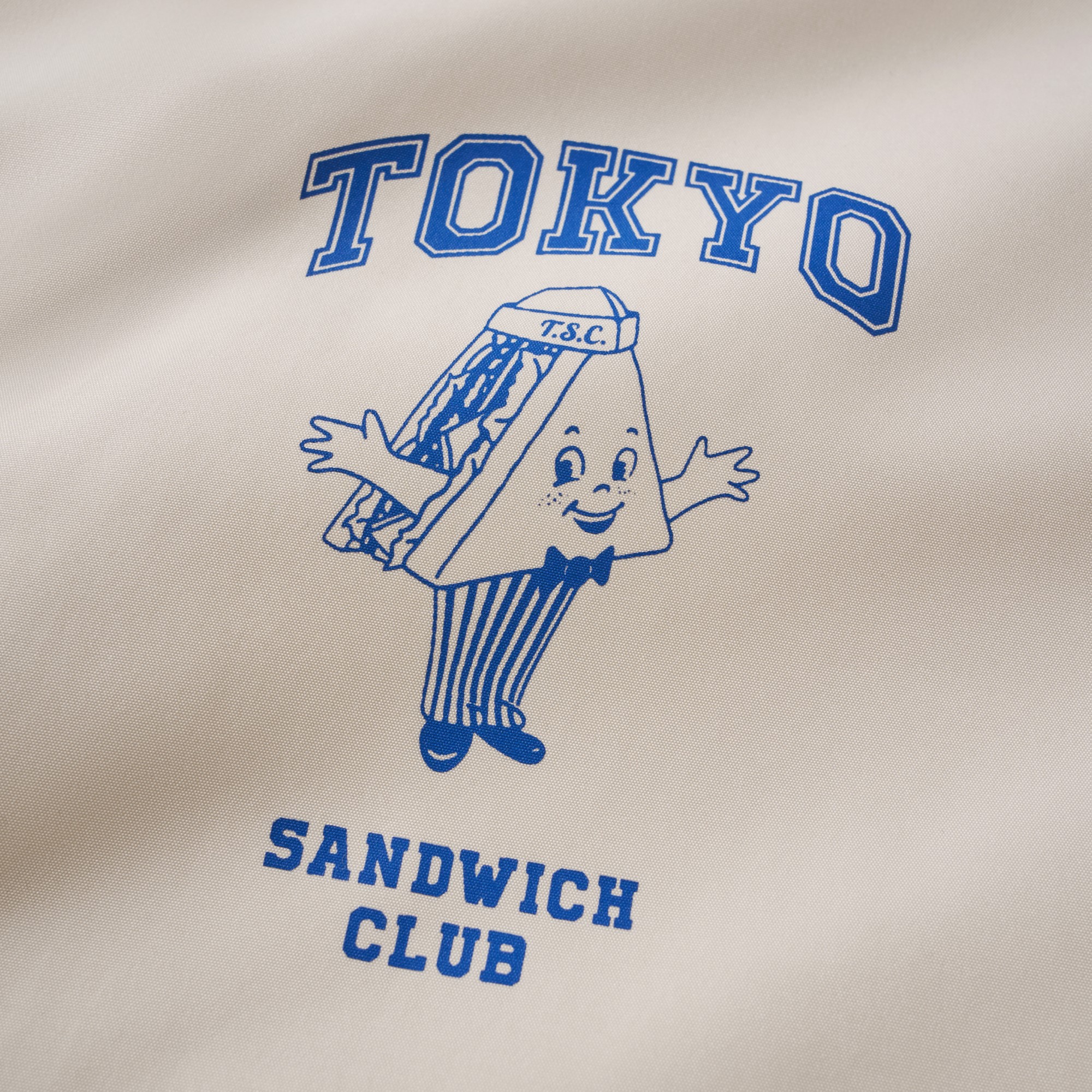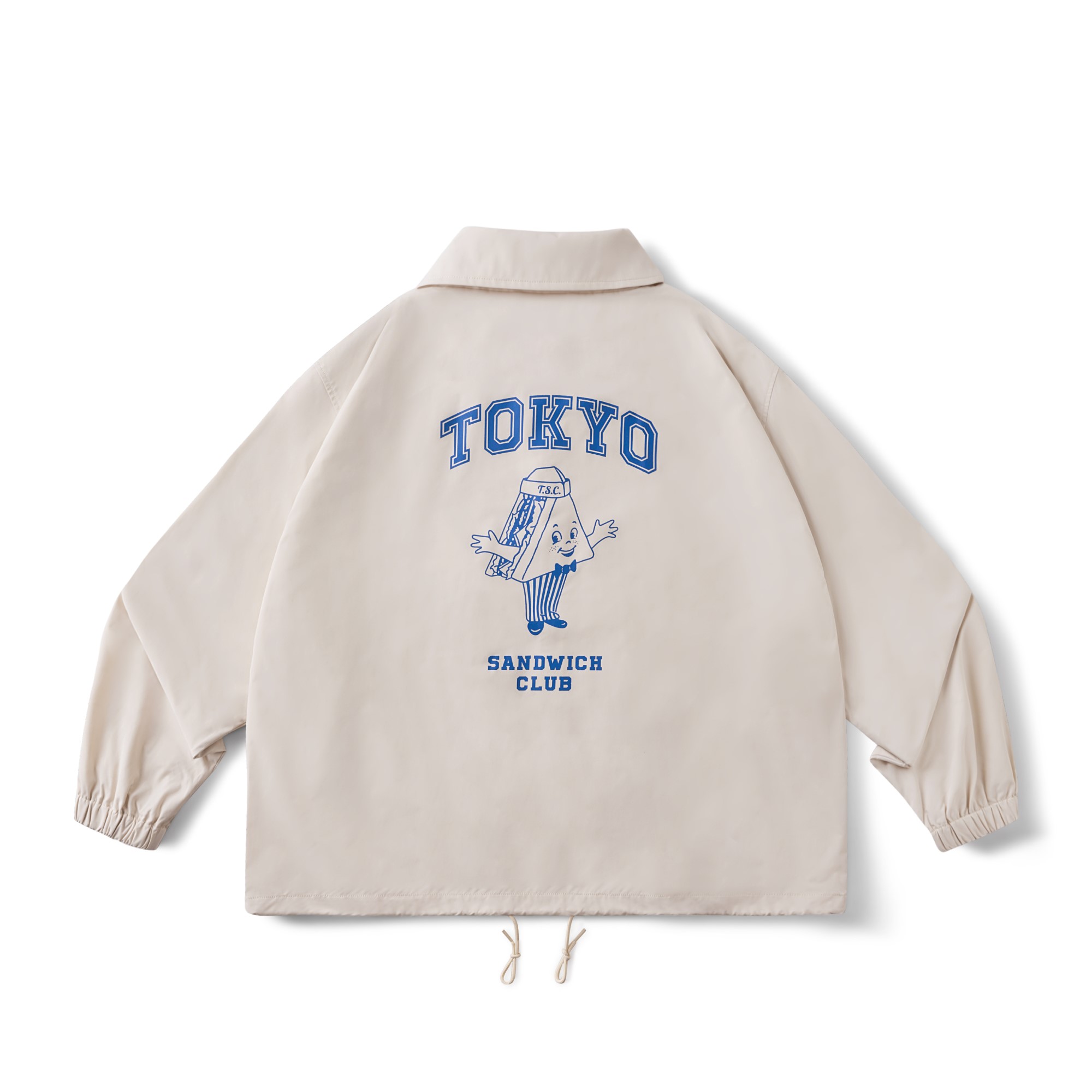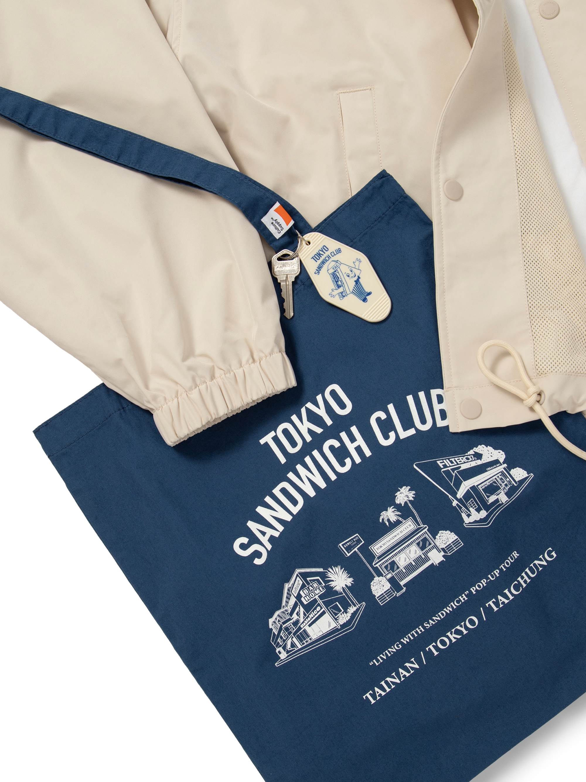 以Tokyo Sandwich Club 品牌經典三明治吉祥物圖像作為主視覺,版型採用美式運動教練外套樣式為考究基礎,將剪裁身形修改調整為時下流行的短襬落肩寬鬆輪廓,嚴選具有些許光澤感、輕量扎實的防潑水聚酯纖維面料,適合四季防風與層次搭配著用,為日常休閒帶來舒適隨性的穿搭體驗。
