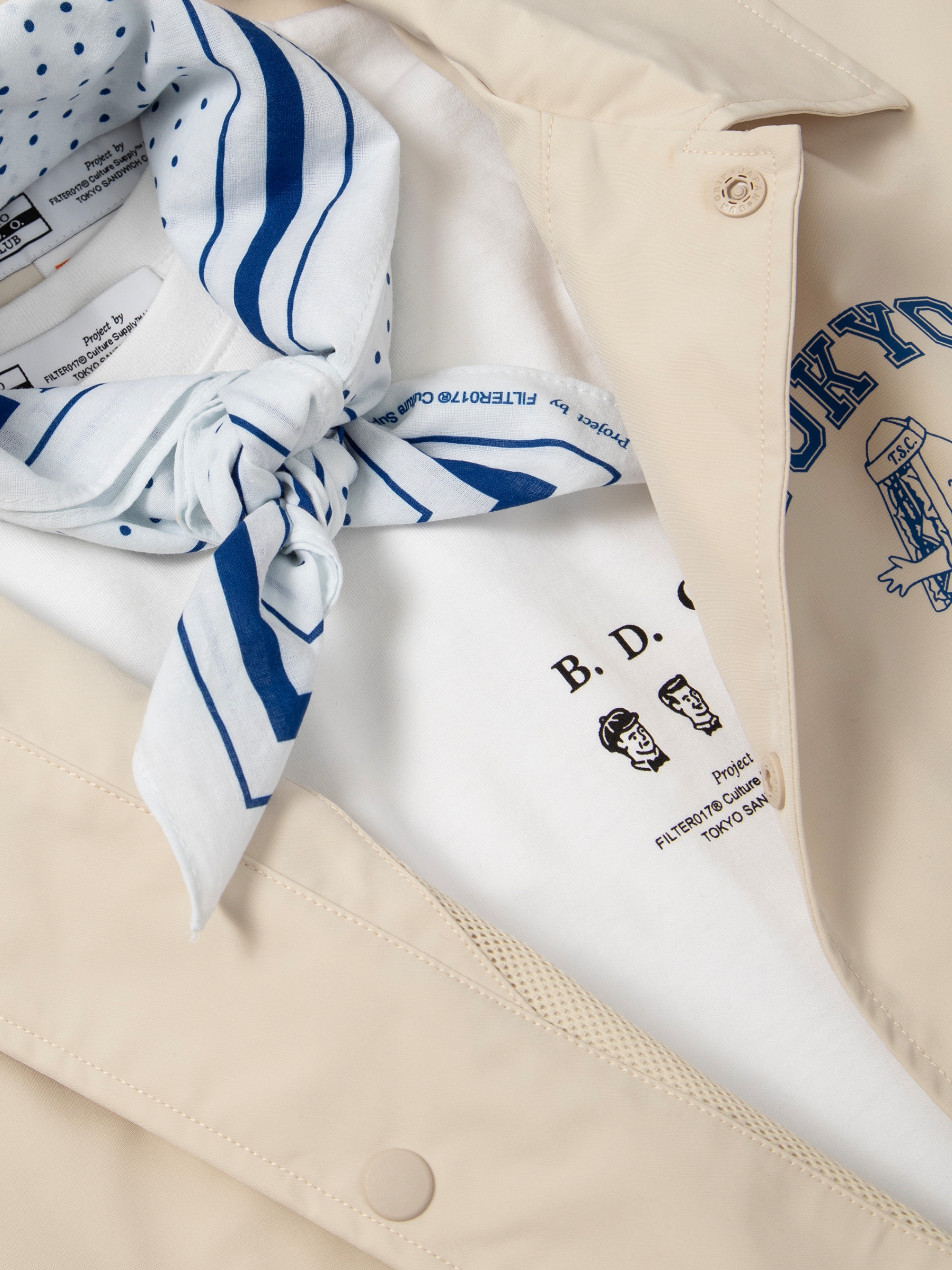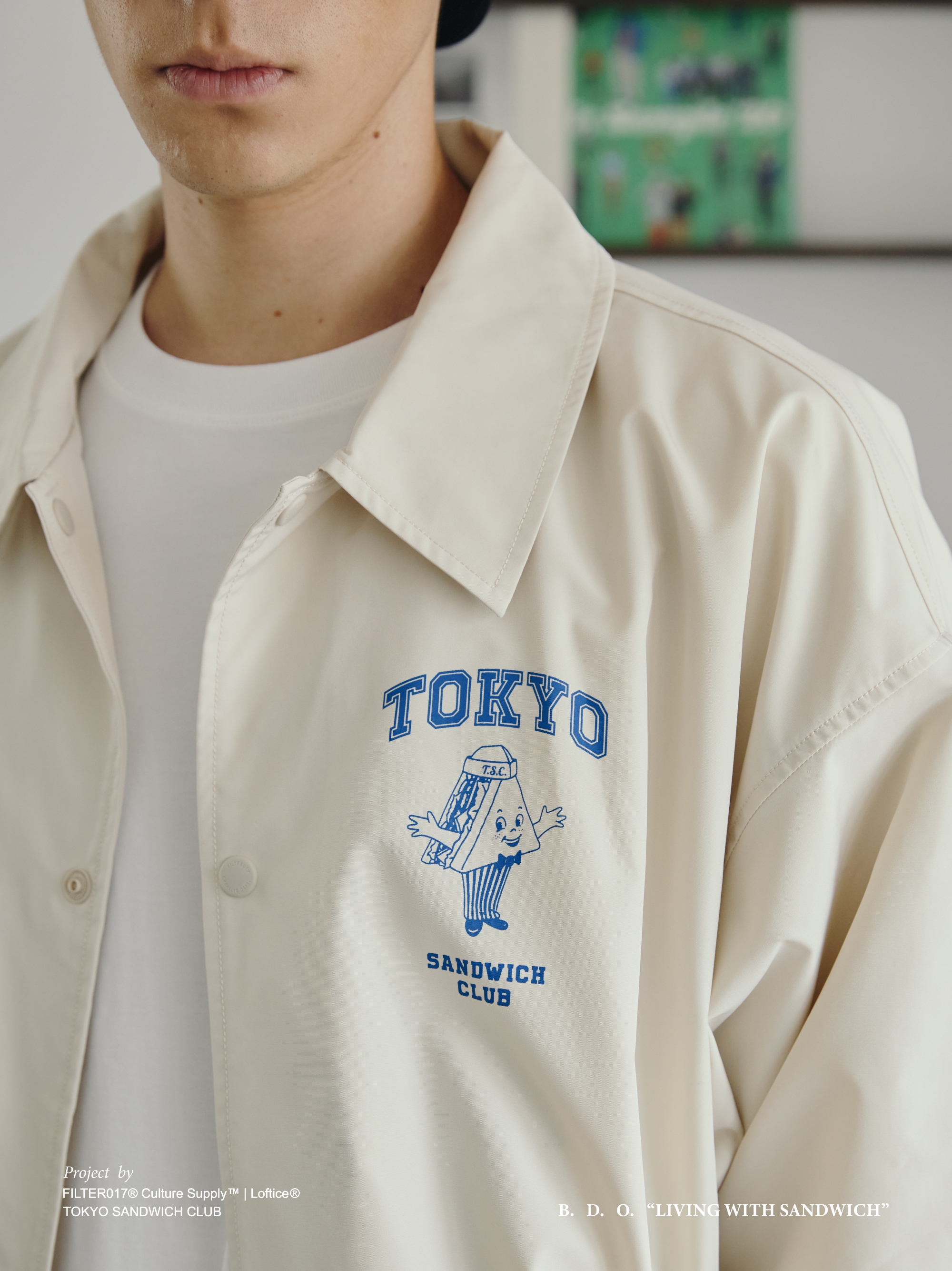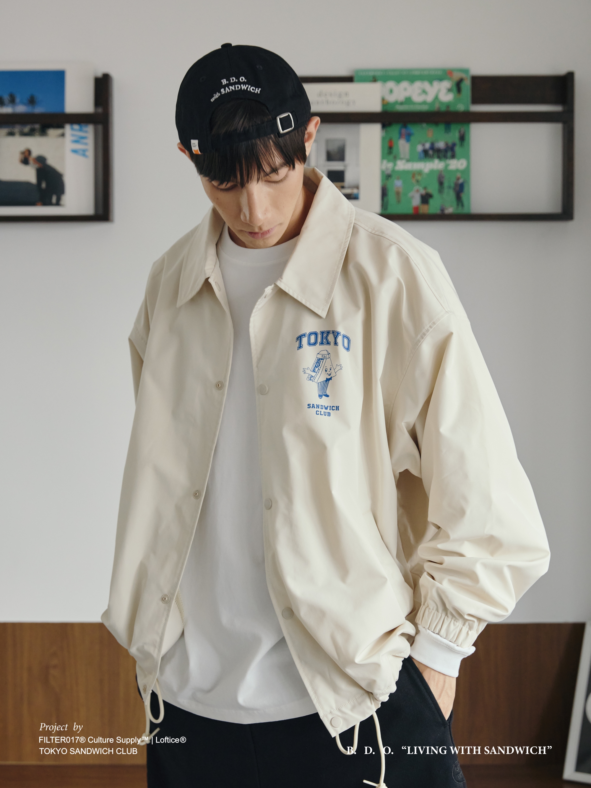 以Tokyo Sandwich Club 品牌經典三明治吉祥物圖像作為主視覺,版型採用美式運動教練外套樣式為考究基礎,將剪裁身形修改調整為時下流行的短襬落肩寬鬆輪廓,嚴選具有些許光澤感、輕量扎實的防潑水聚酯纖維面料,適合四季防風與層次搭配著用,為日常休閒帶來舒適隨性的穿搭體驗。