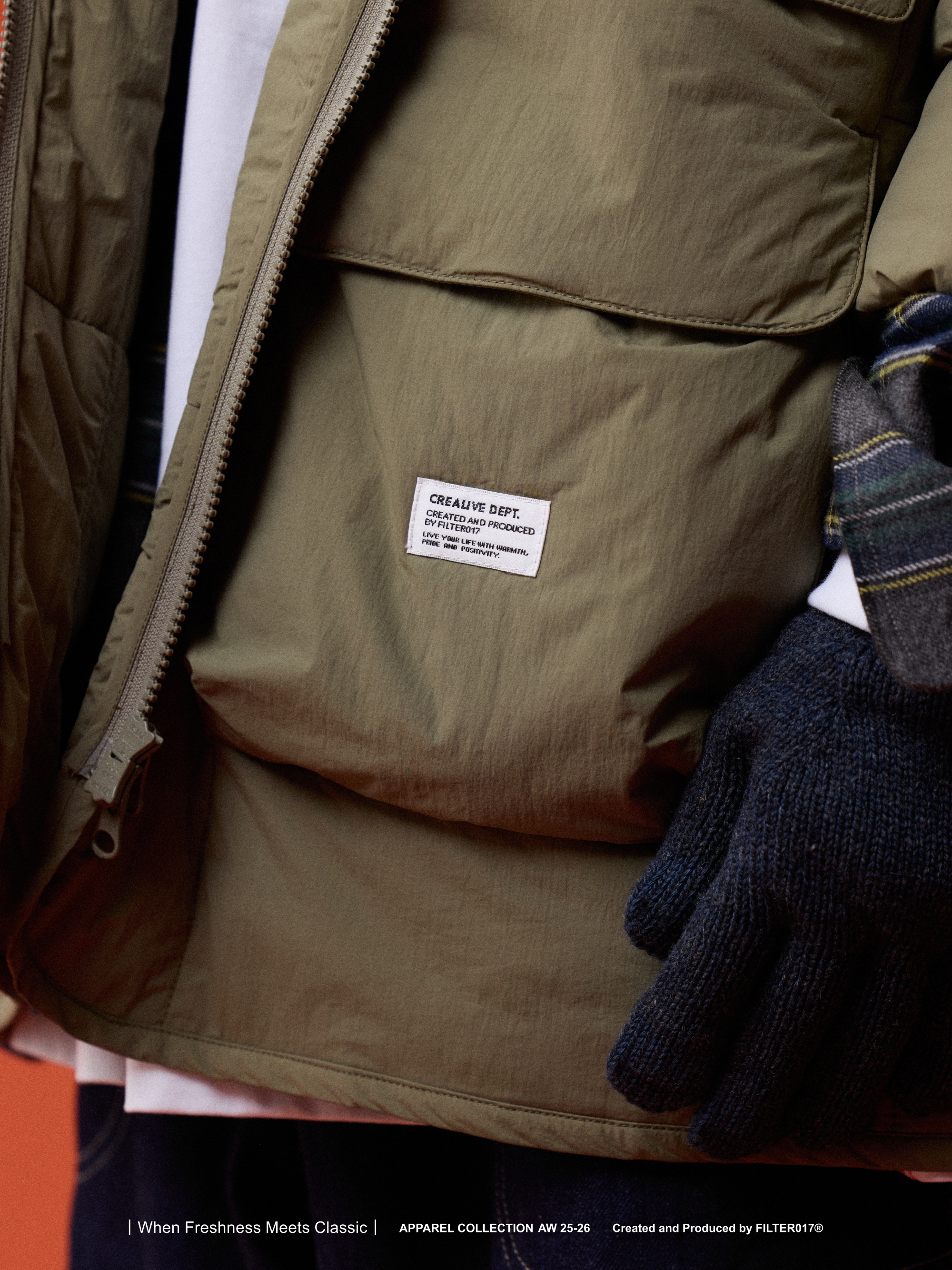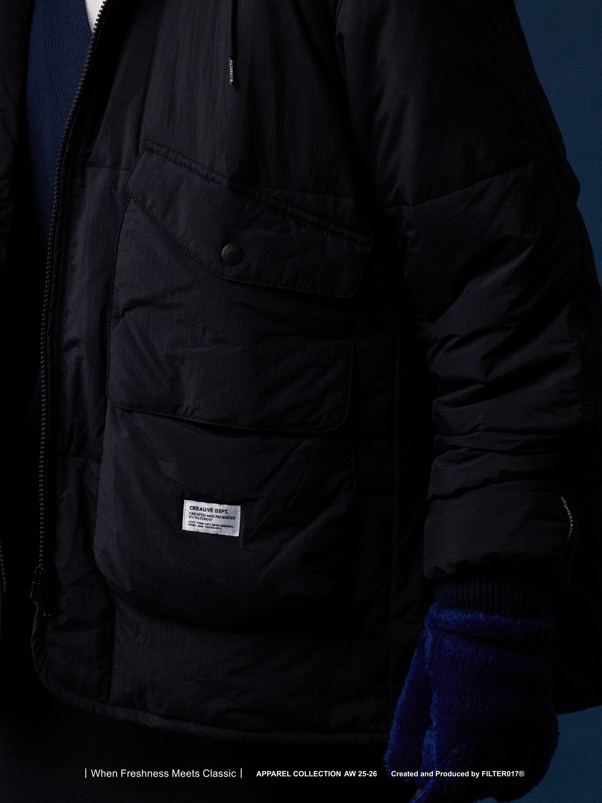 考究60 年代歐美軍用野戰夾克絎縫內膽為靈感基礎,融入美式獵裝口袋造型與連帽結構重新混合演繹,使整體風格在Urban Outdoor 的基礎上取得協調與平衡。