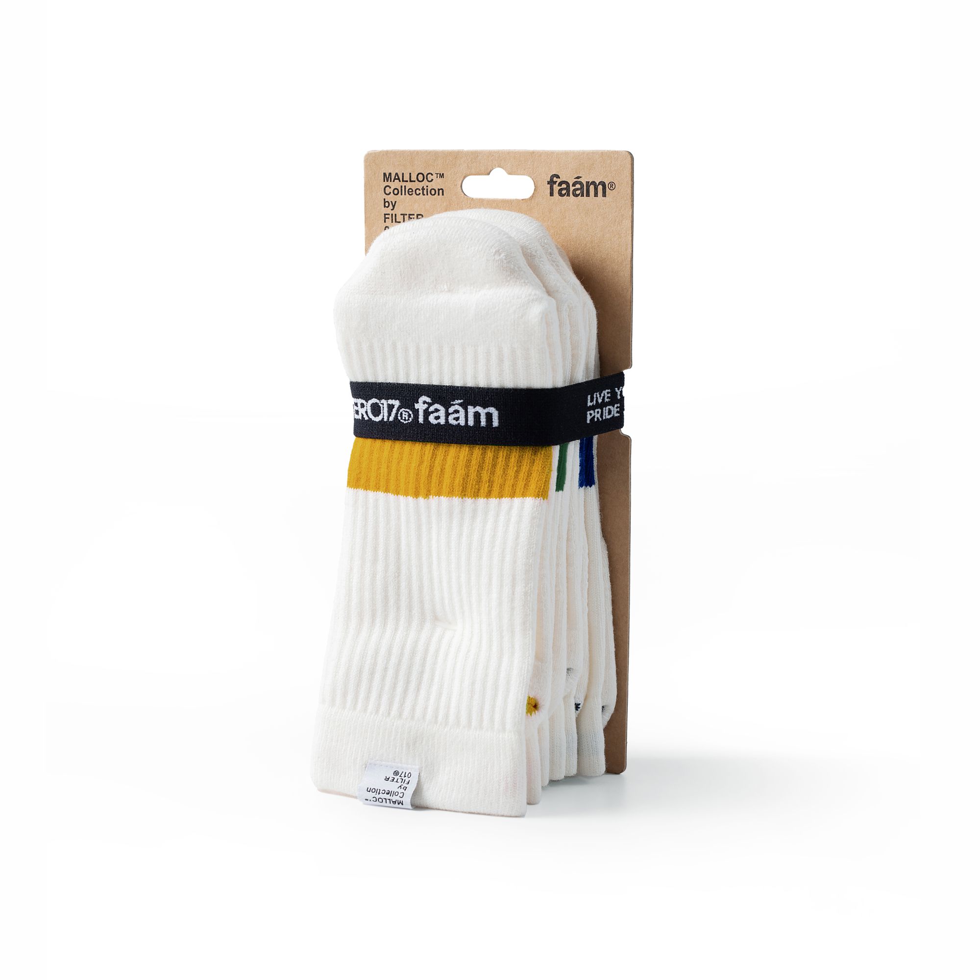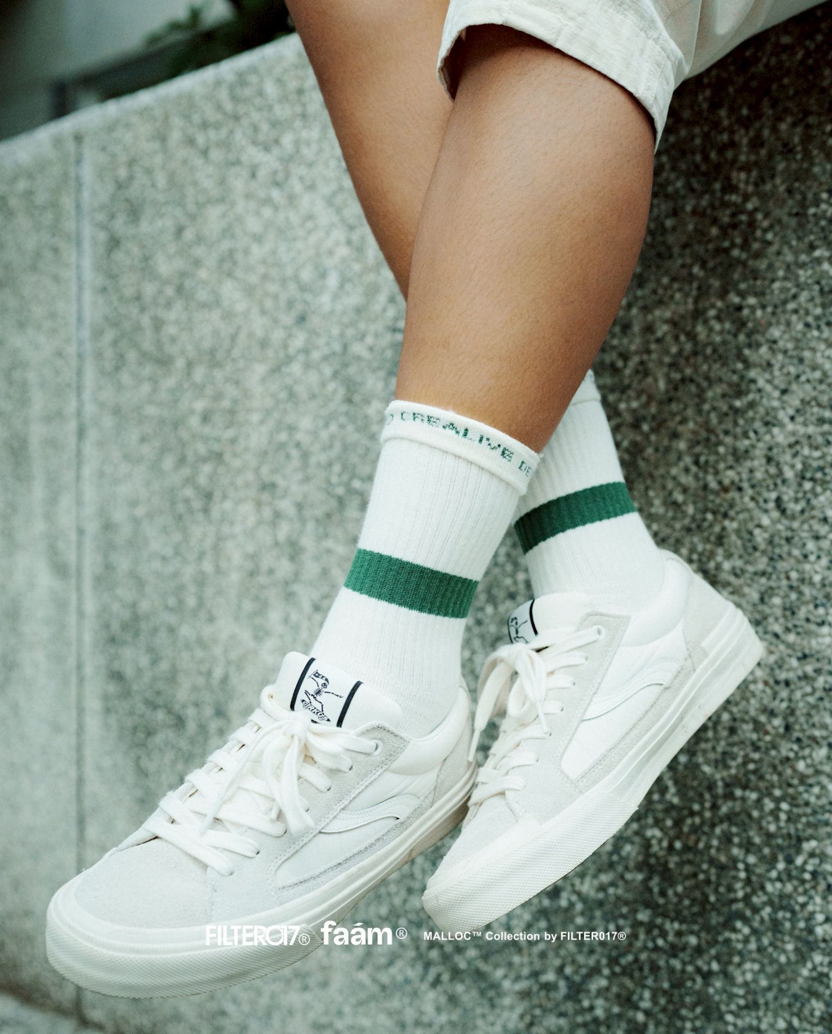本次復刻新作用選用象牙白作為襪身本體,以MALLOC™ 織標及襪底印刷詮釋聯名細節,襪管內側提花FILTER017® 品牌字樣,著用時可反摺增加外觀搭配上的視覺靈活性。