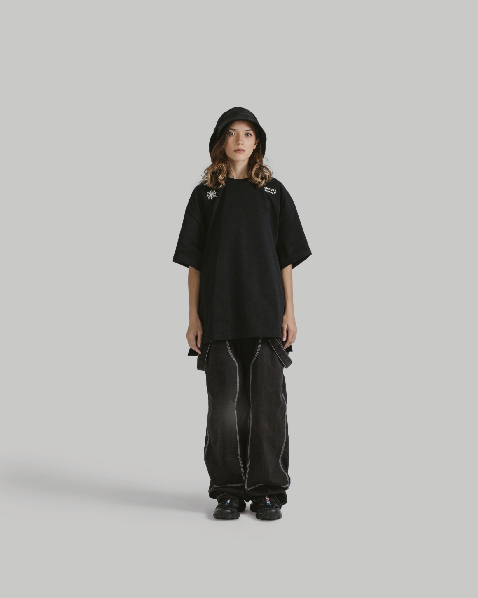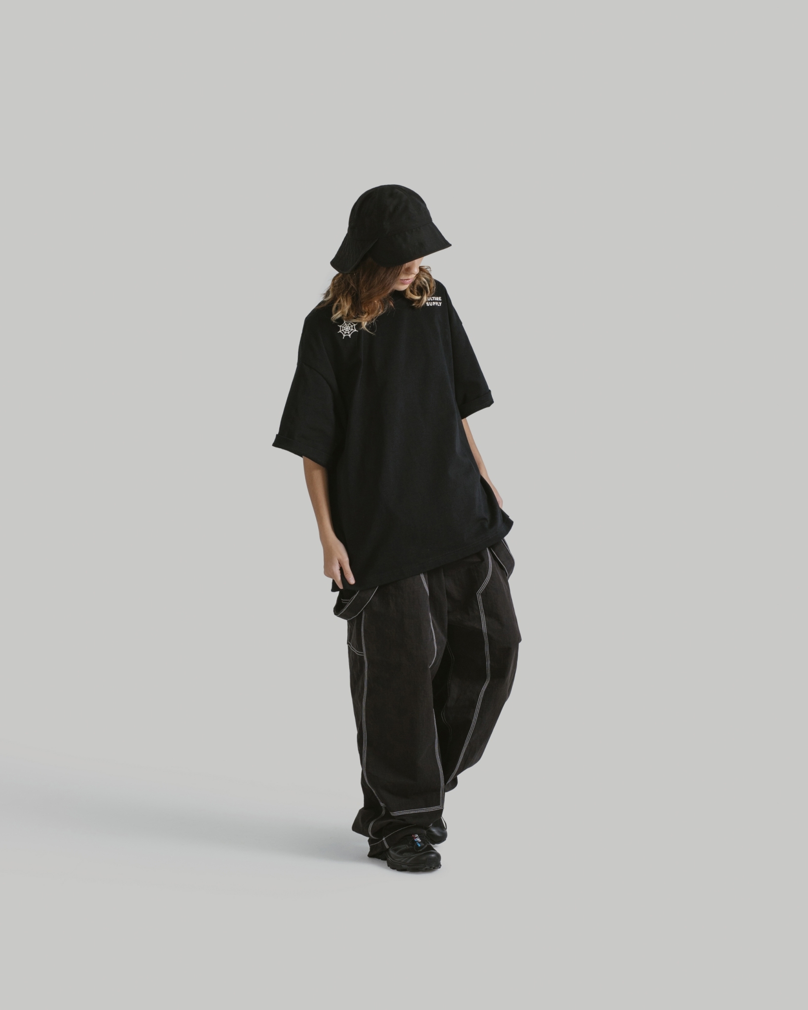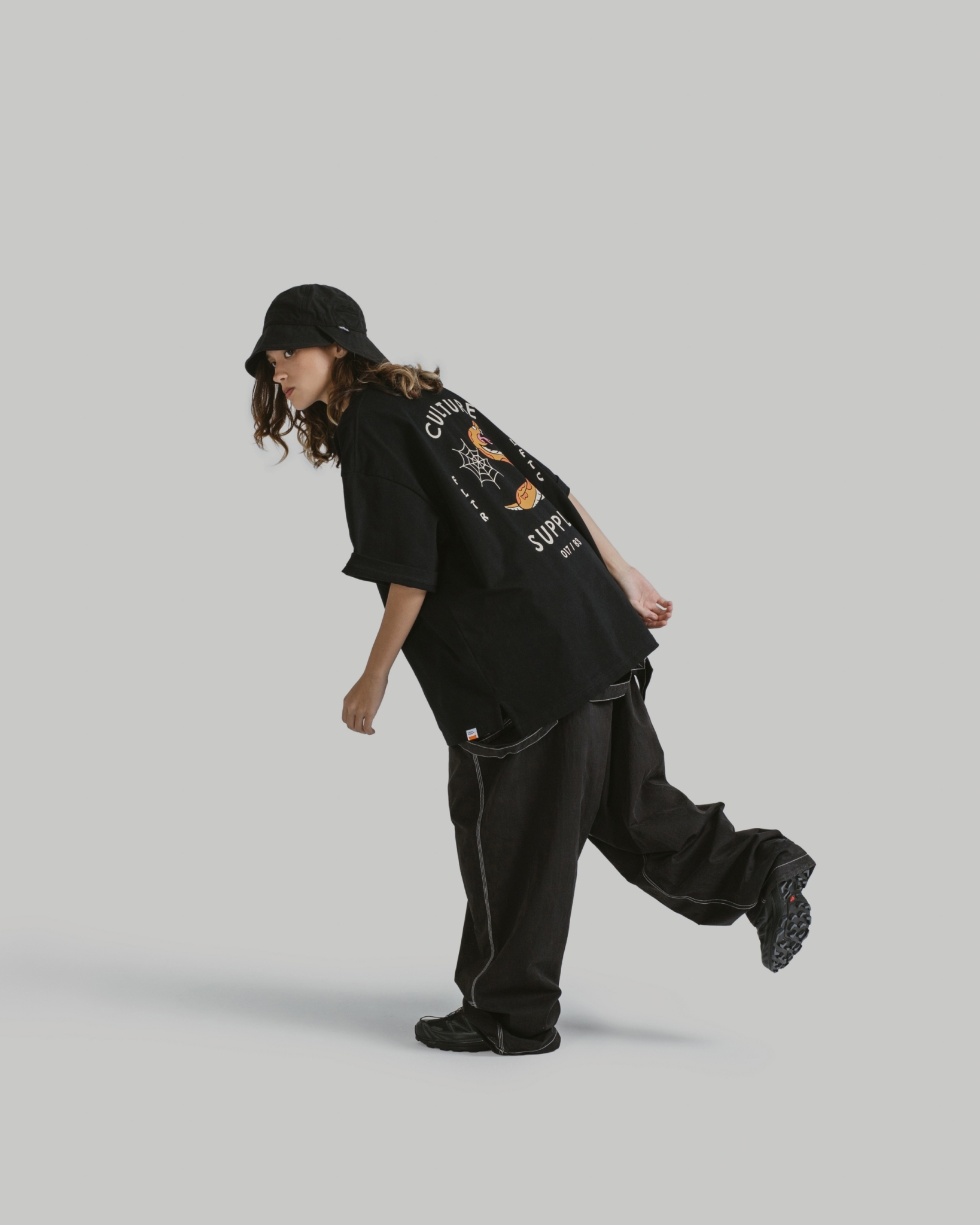 此款短T採用融合日本傳統與美式文化的橫須賀風格呈現,正面採用細緻刺繡入圖,背面印刷以蜘蛛網和手繪字體進行編排,藉此襯托仿軍事感筆觸繪製而成的蛇年圖像。