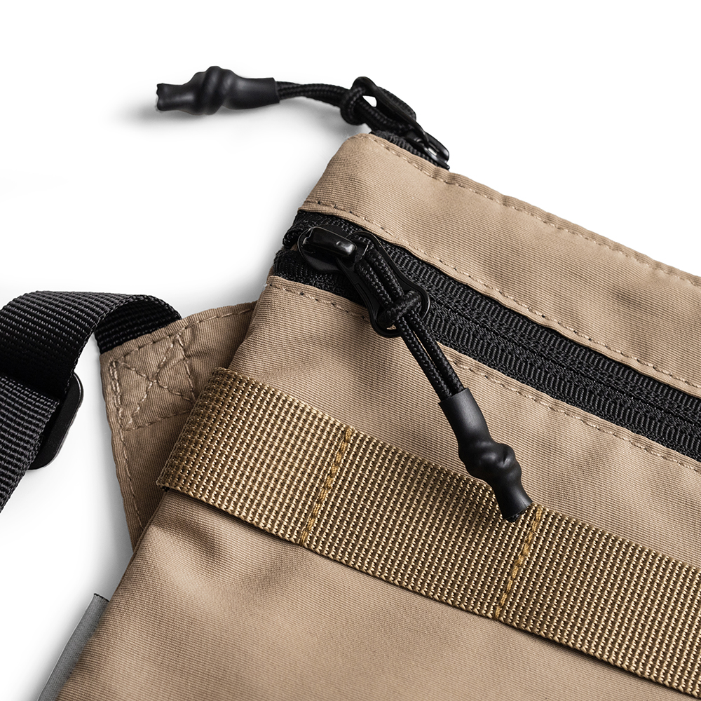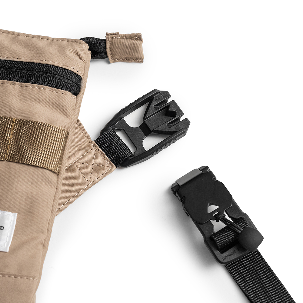 背帶設計上,採用了德國知名扣具品牌「FIDLOCK」精良的磁吸專利扣具,便於快速釋放拆卸與連結的特性,使包款攜帶上更提高了方便度與安全性,提供了日常都市生活及戶外活動中絕佳的機能與收納性。