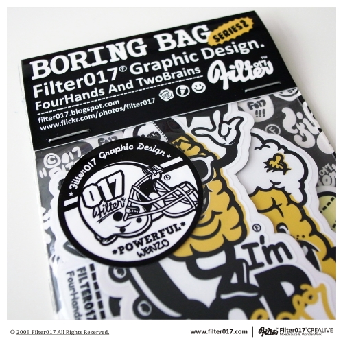 Filter017 Boring Bag 貼紙包內含8款不同設計圖像的貼紙,其中4款為高質感網版印刷的透明貼紙,4款為PVC材質斯不破貼紙。正反兩面印刷,防水、不殘膠、抗紫外線、不退色。