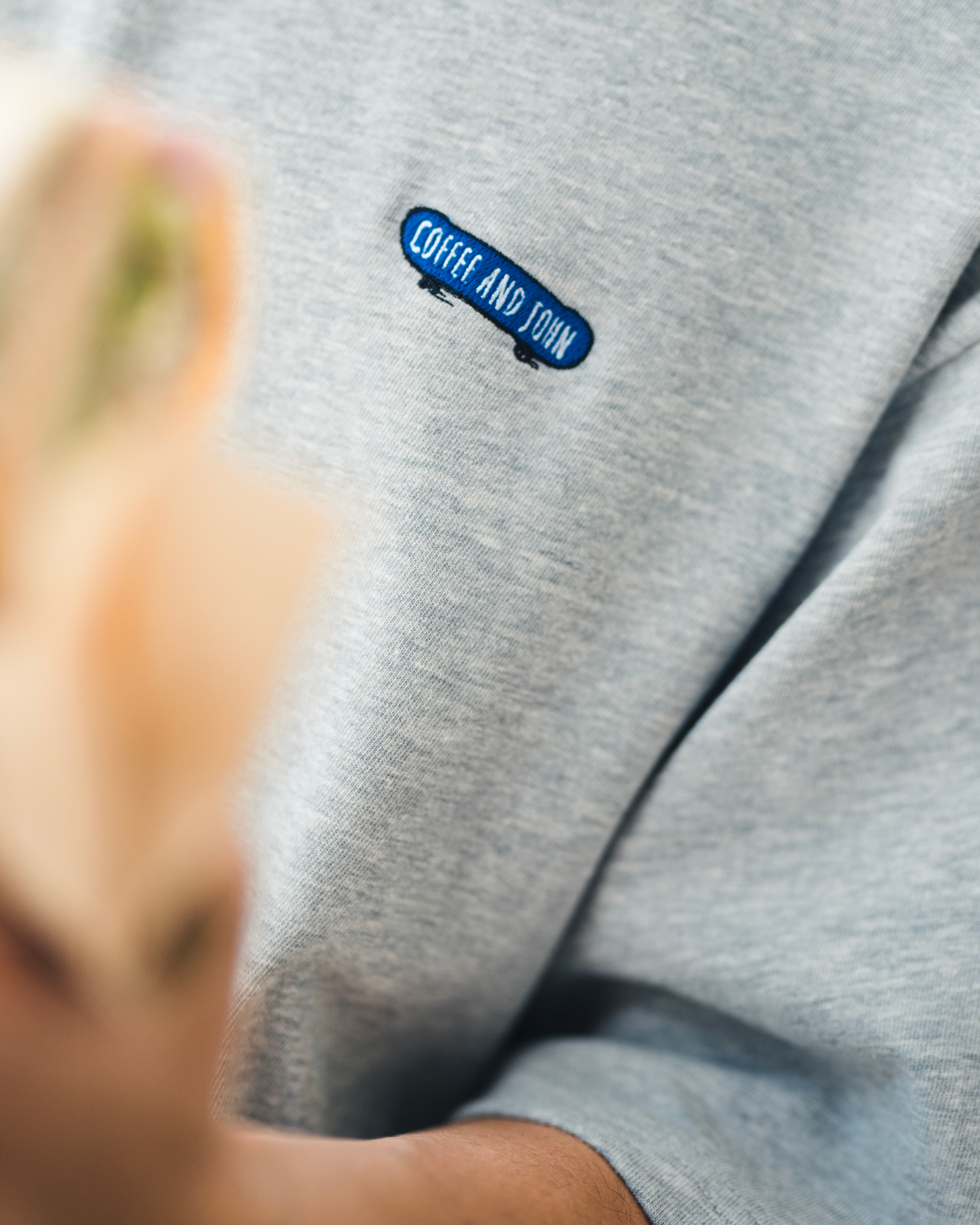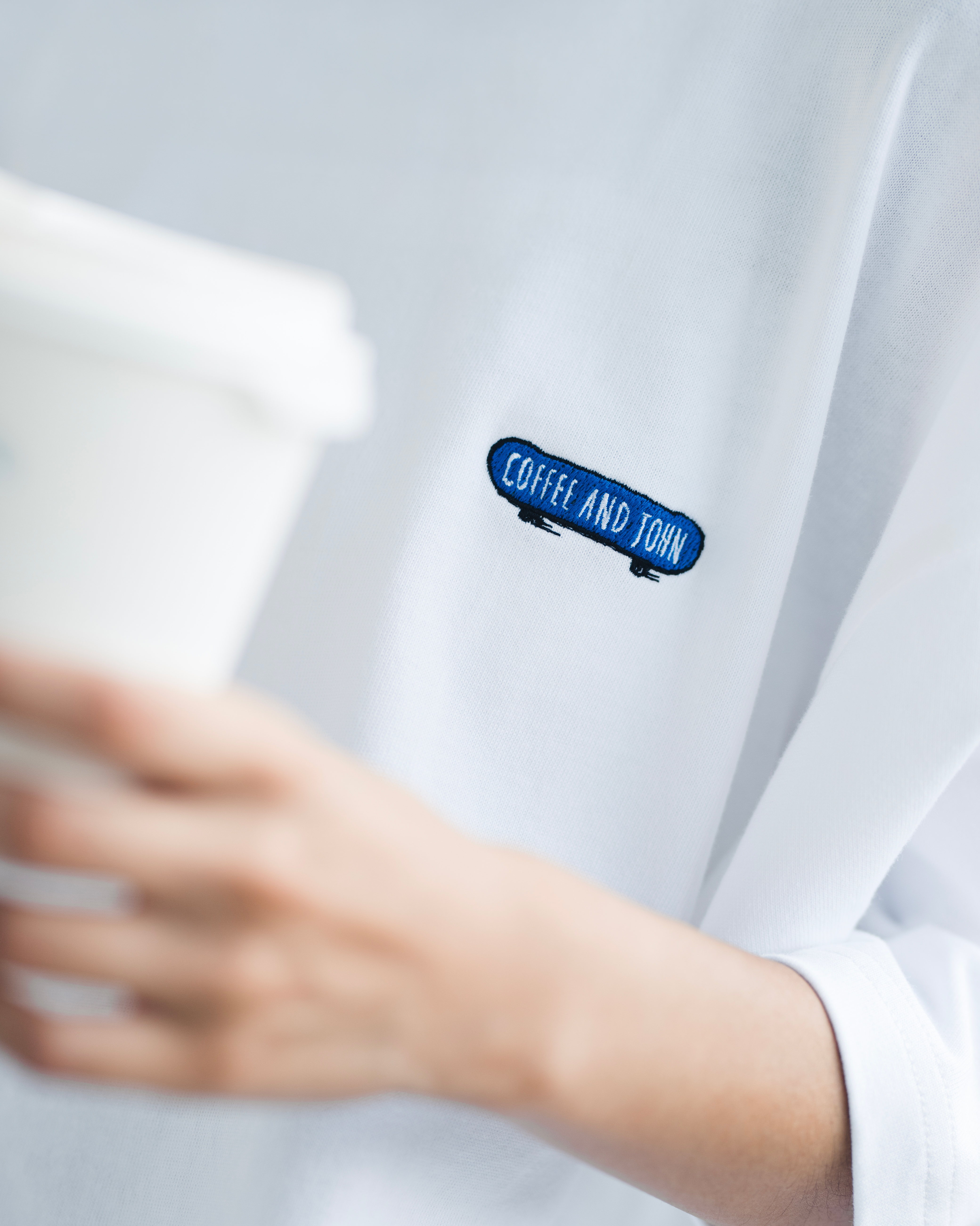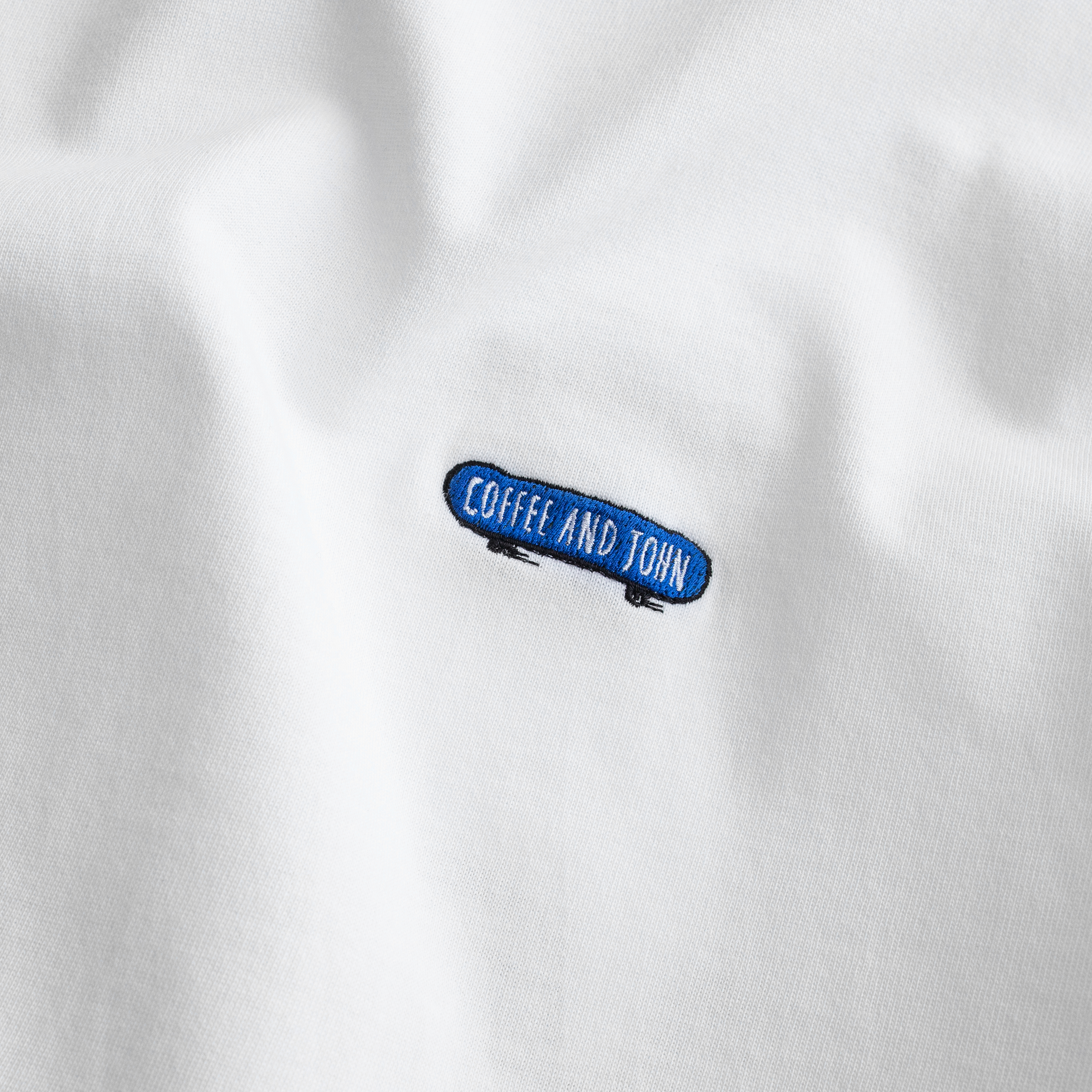 胸前以JOHN的滑板搭配COFFEE AND JOHN字樣刺繡,並於底部描繪出滑行速度感的趣味細節。背後描繪出JOHN坐著滑板於城市中休憩的樣貌,同時不忘來一杯咖啡,展現EVERYDAY IS A GOOD DAY的生活理念。