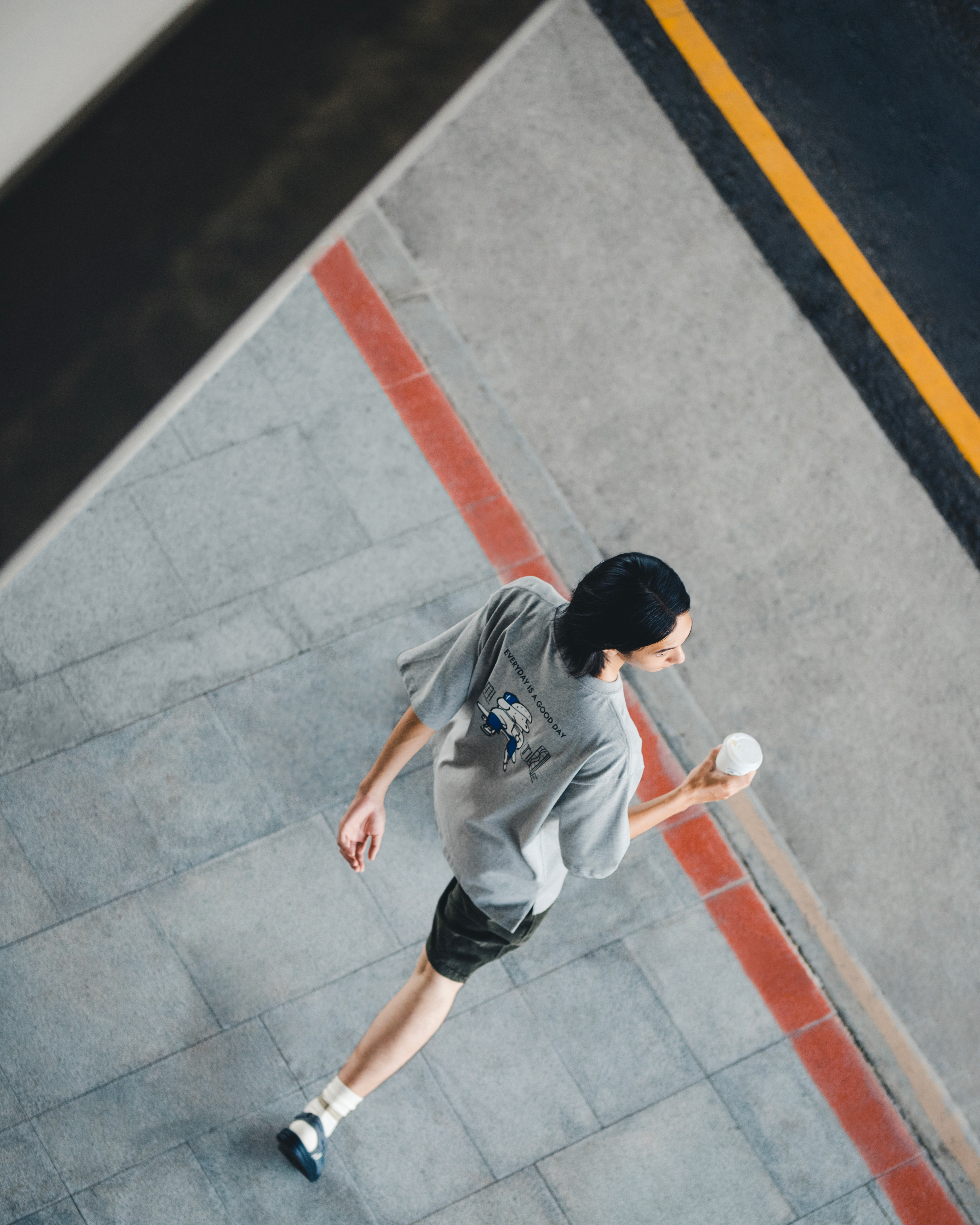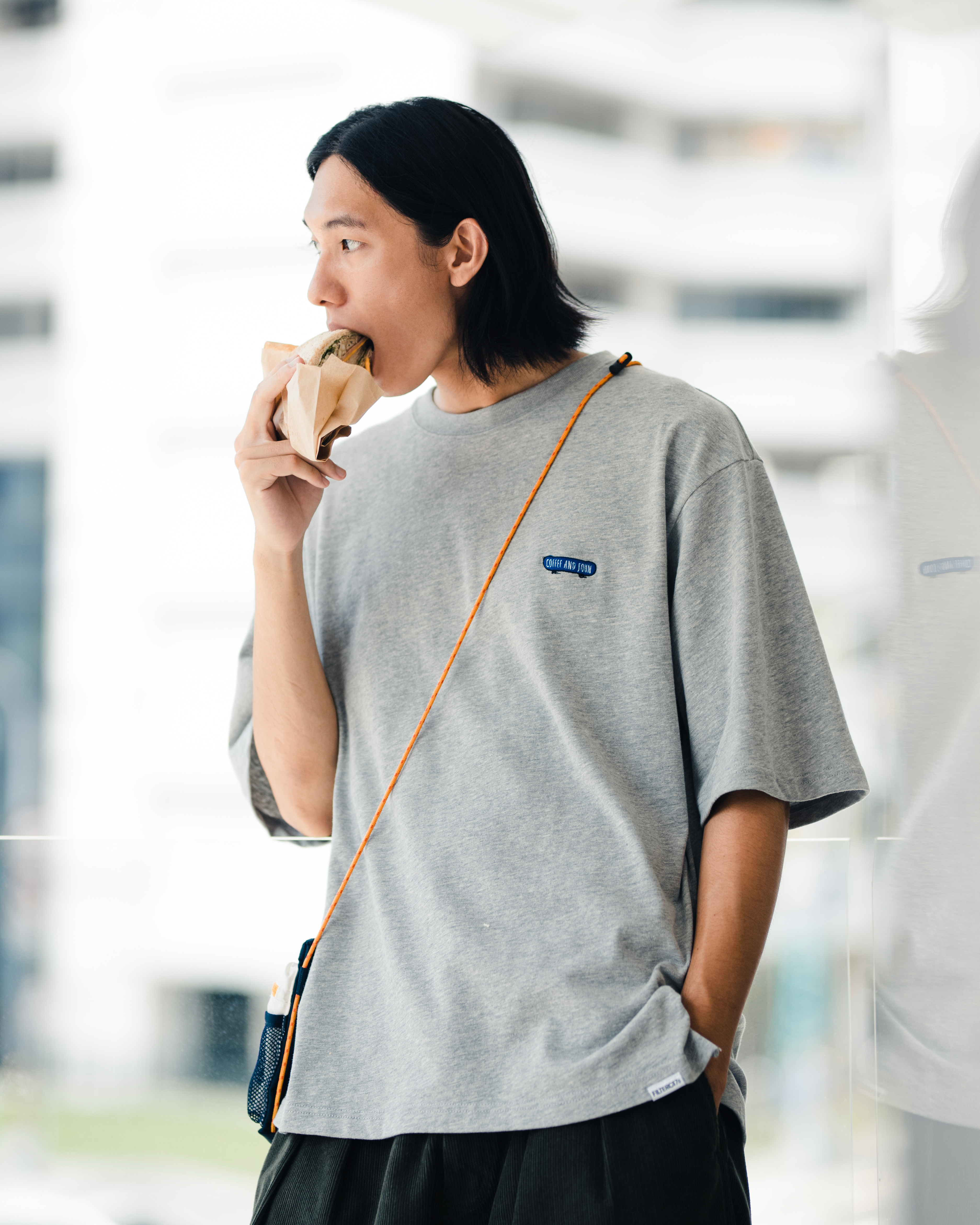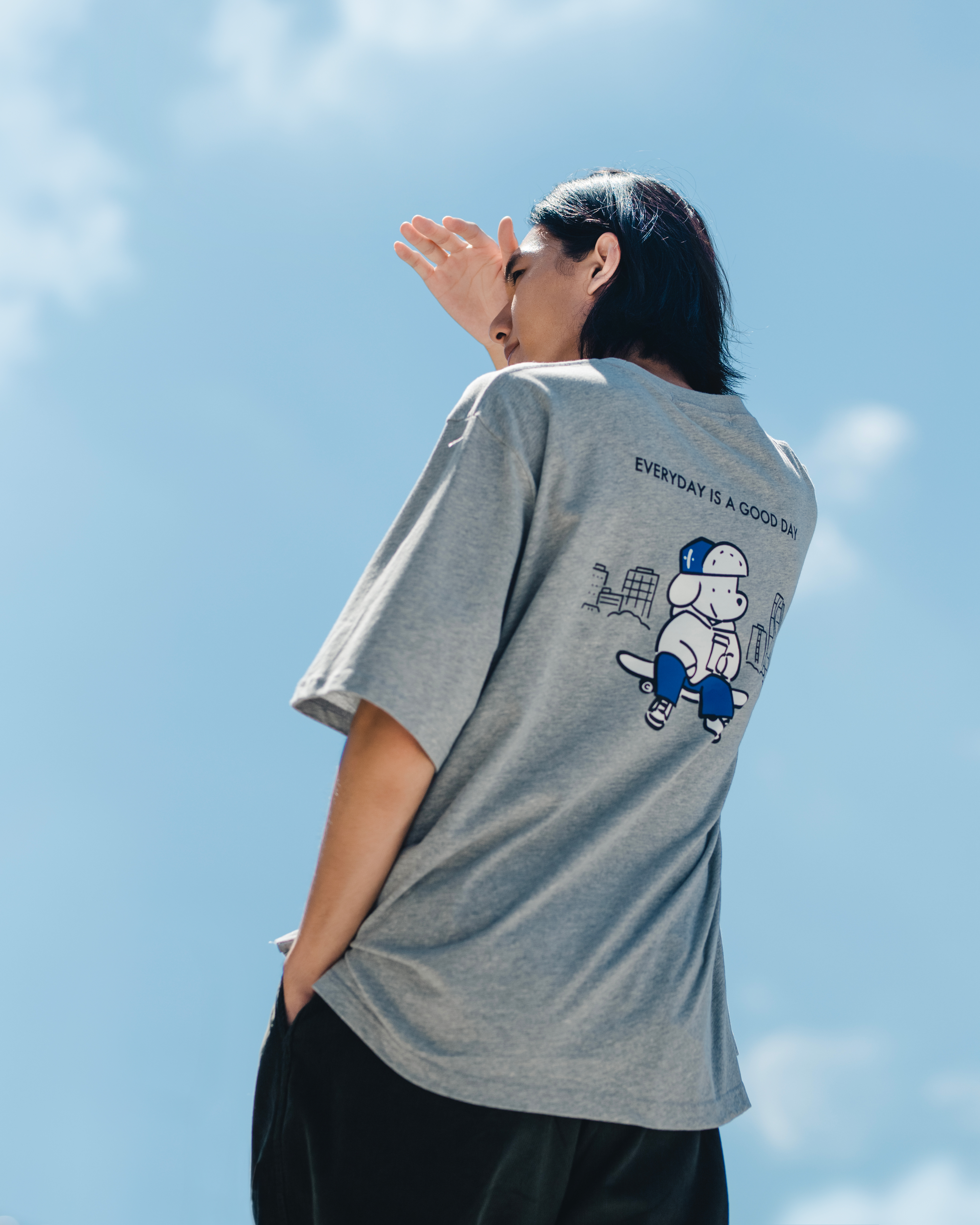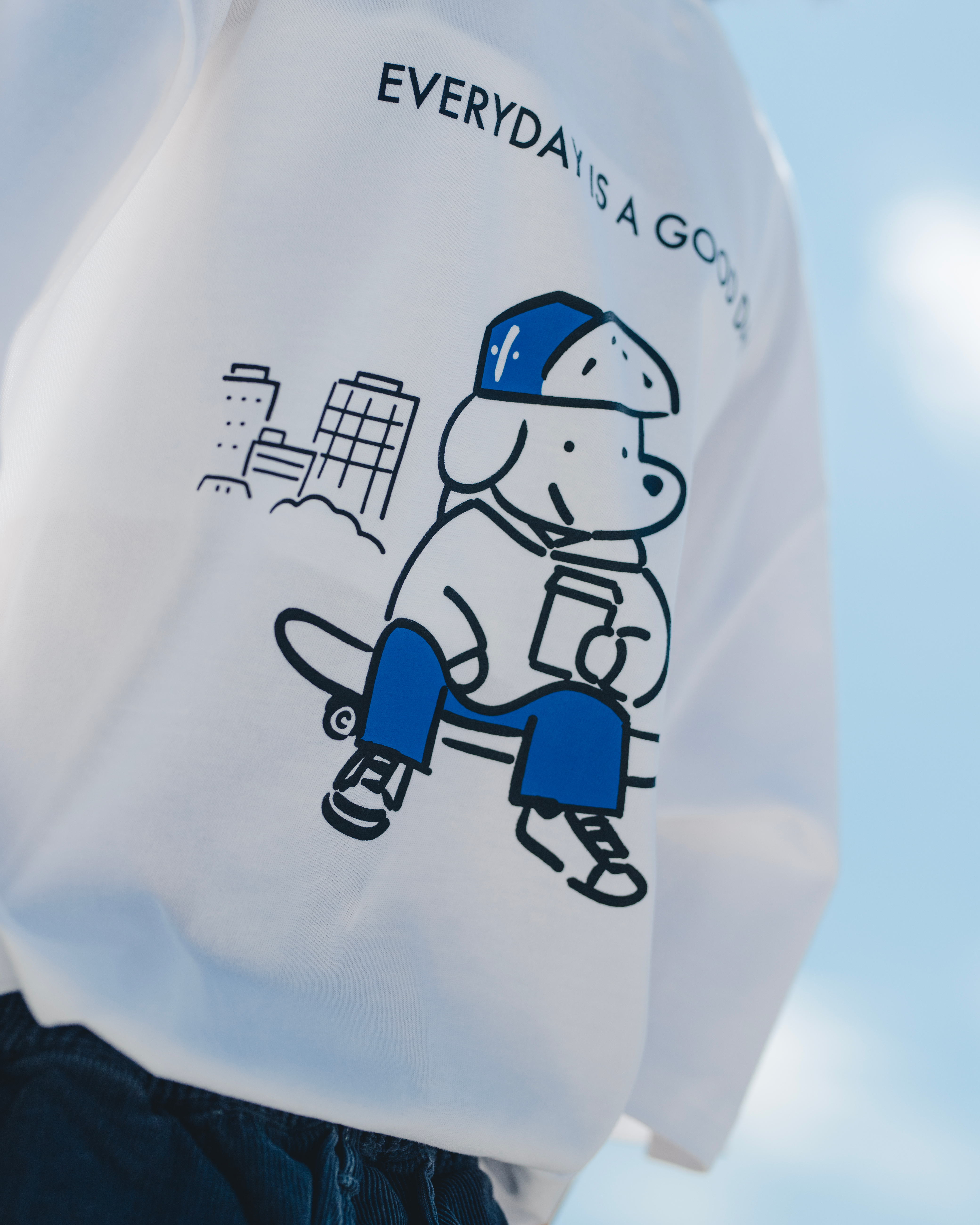 胸前以JOHN的滑板搭配COFFEE AND JOHN字樣刺繡,並於底部描繪出滑行速度感的趣味細節。背後描繪出JOHN坐著滑板於城市中休憩的樣貌,同時不忘來一杯咖啡,展現EVERYDAY IS A GOOD DAY的生活理念。