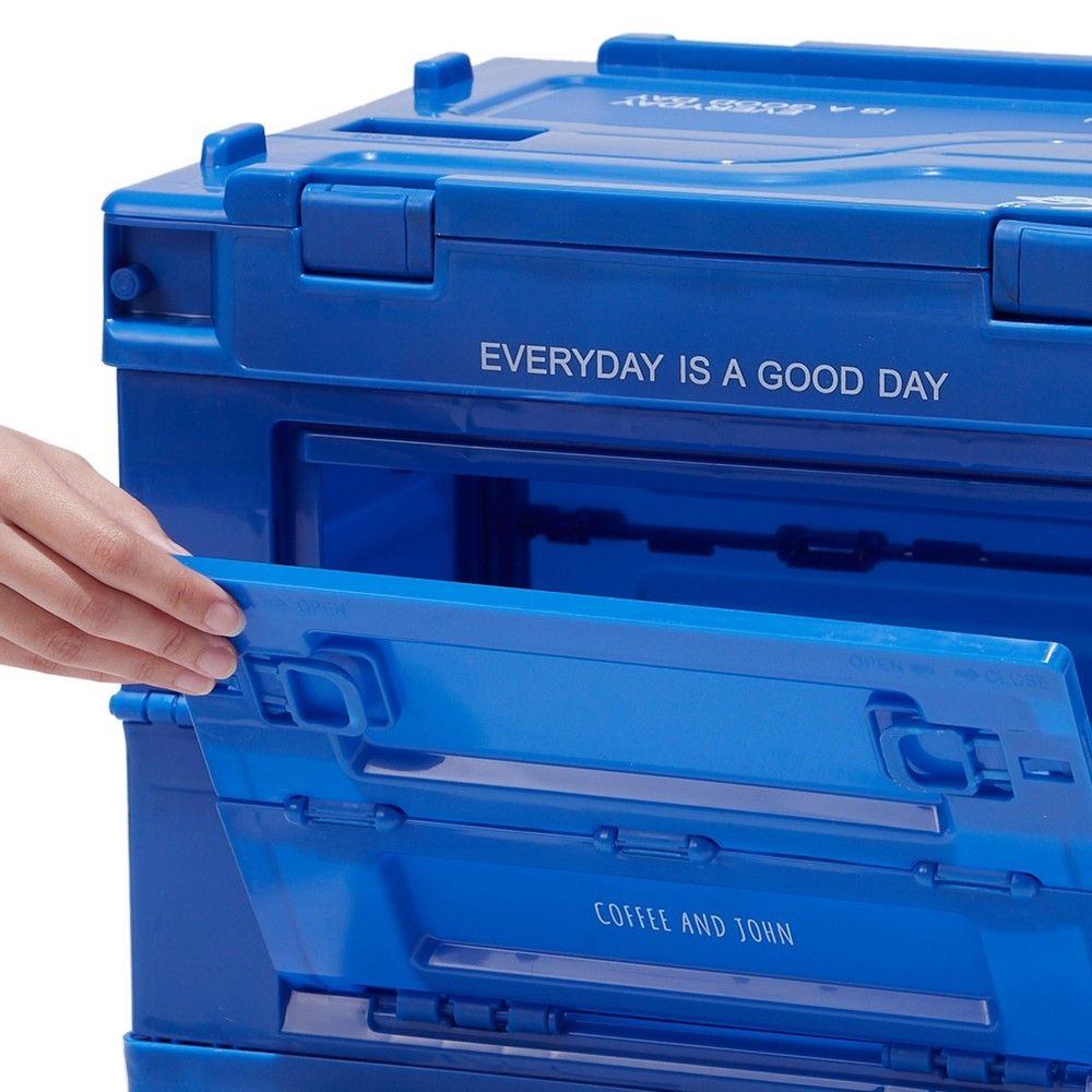 本次推出的 COFFEE AND JOHN 摺疊箱,以JOHN 插畫及字體提點主題,並採以延續系列藍色經典視覺,雙面皆可側開,並在上蓋新增固定扣鎖,使用上更加不受限制。同樣採用輕巧的 PP 塑料材質,除了保留摺疊箱原有的便利性與機能性外,即使將多個收納箱疊加組合,無需搬動即可輕鬆收取物品。
