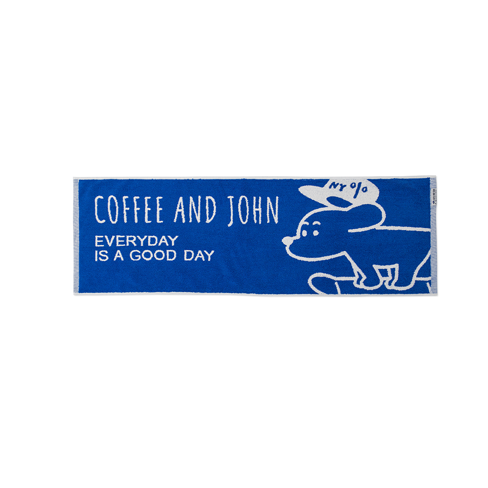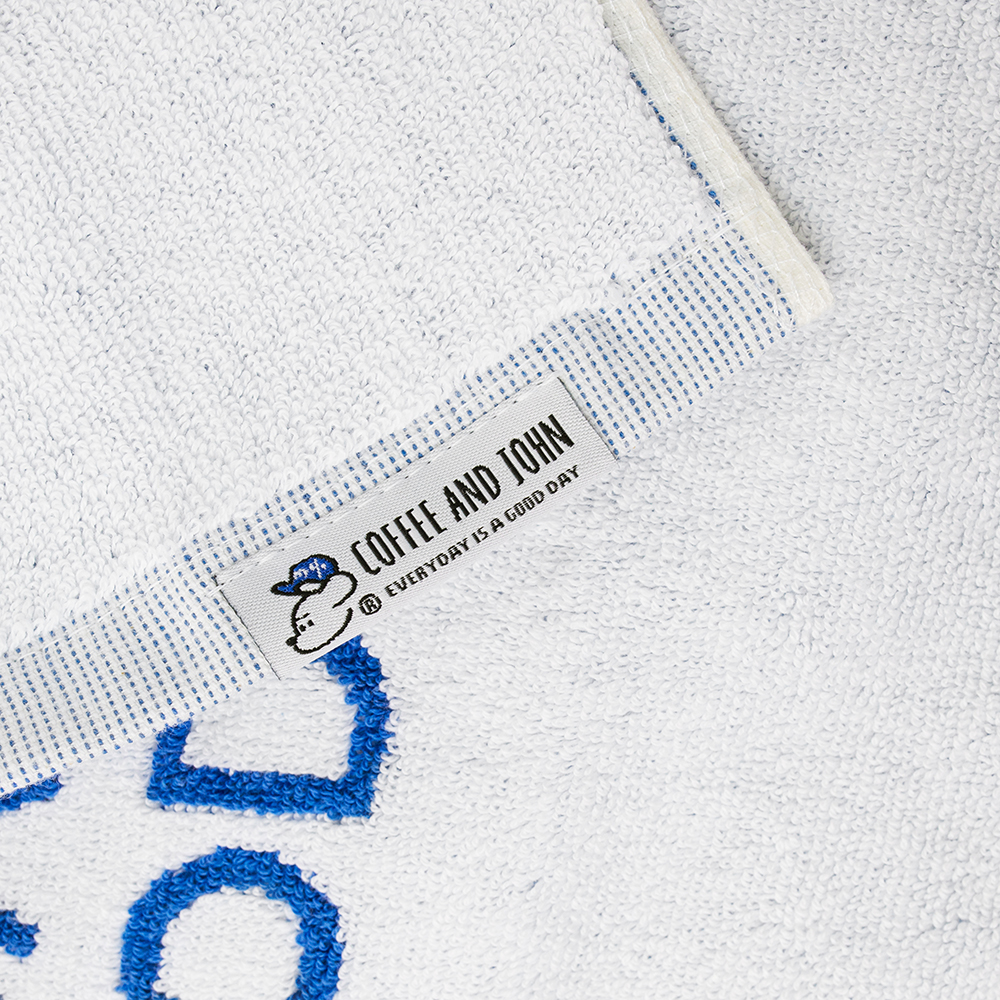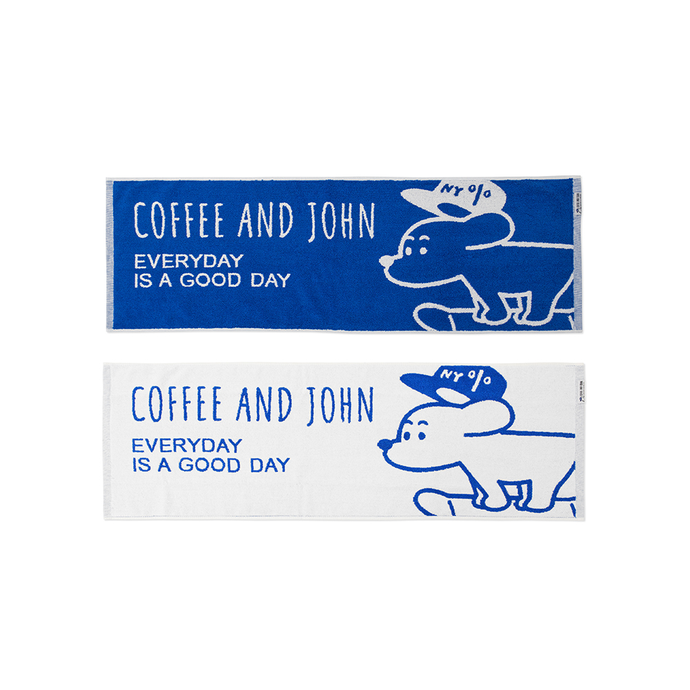 經典的 COFFEE AND JOHN 藍白配色,利用紗線排列相互交織的「緹花工法」勾勒出 JOHN 的模樣。