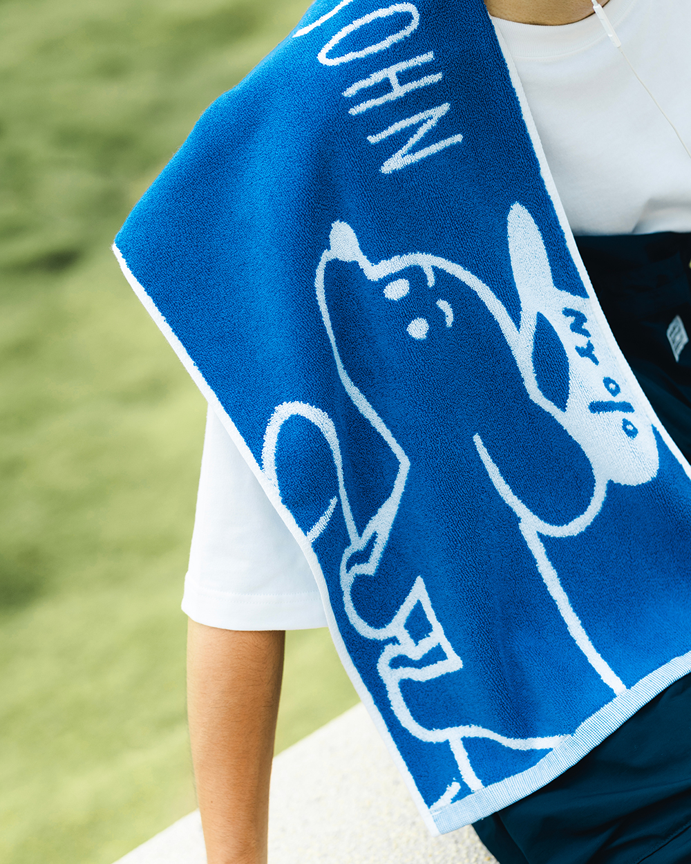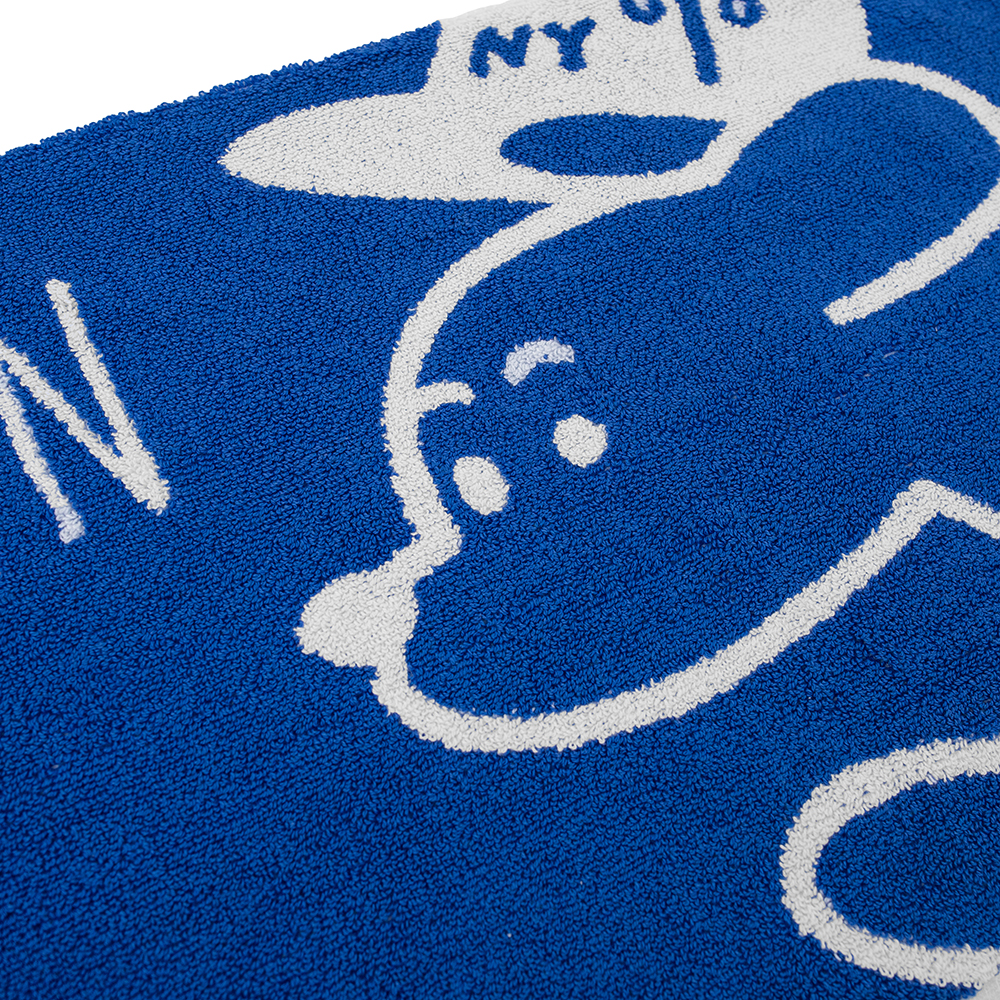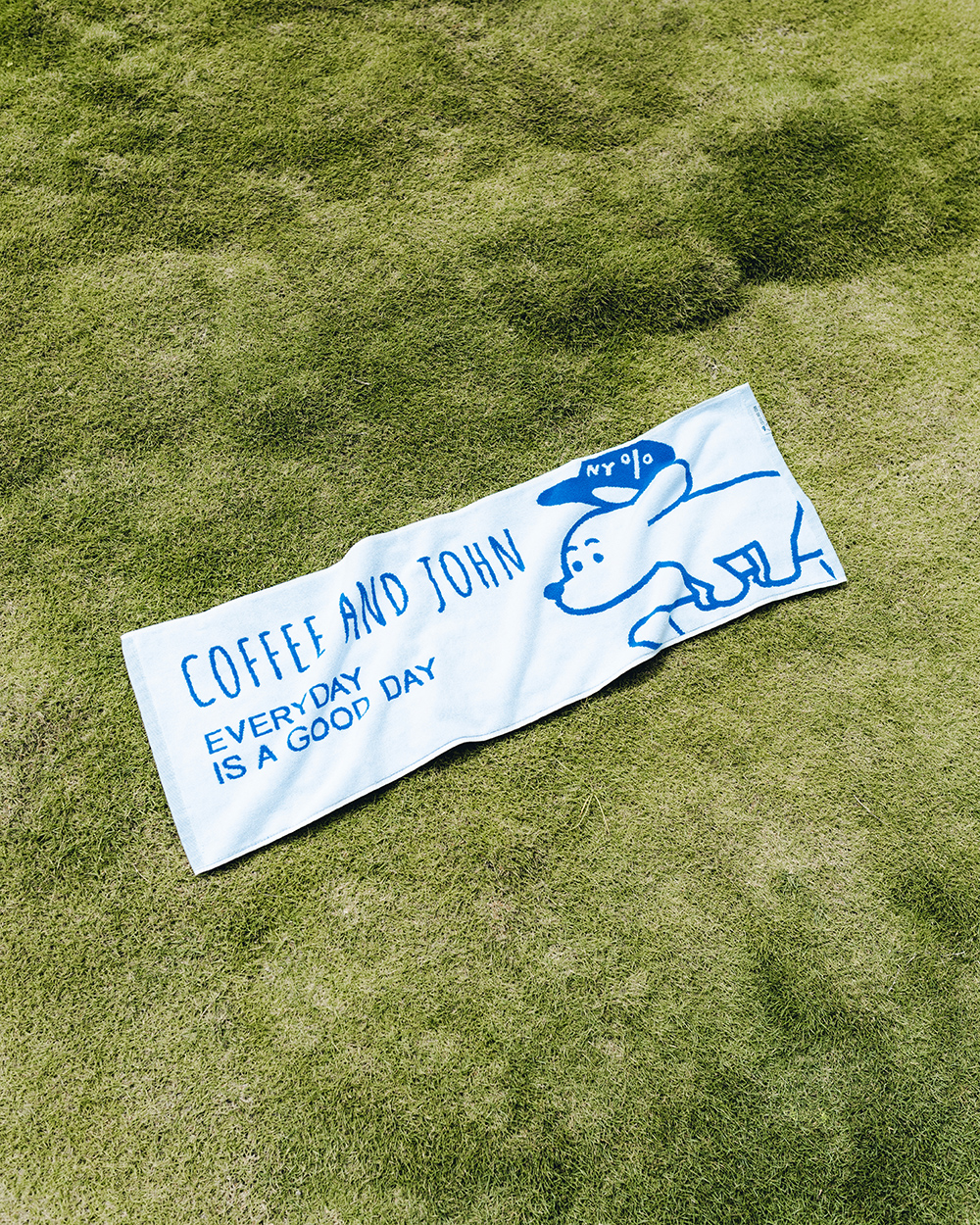 經典的 COFFEE AND JOHN 藍白配色,利用紗線排列相互交織的「緹花工法」勾勒出 JOHN 的模樣。
