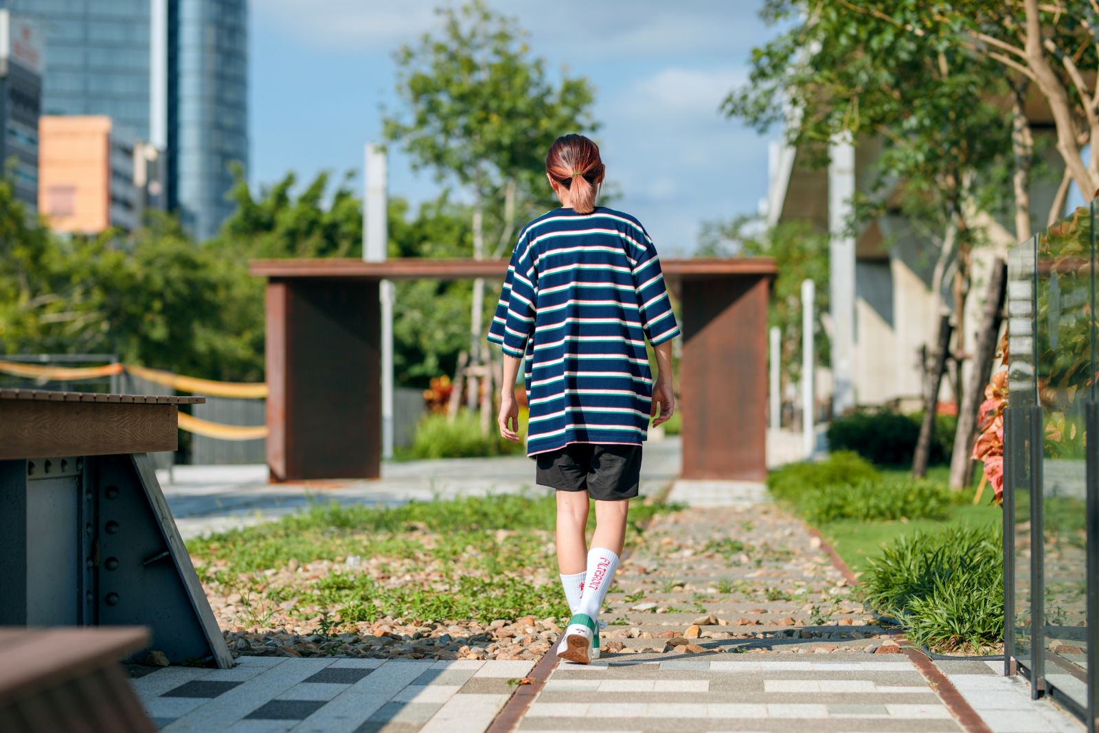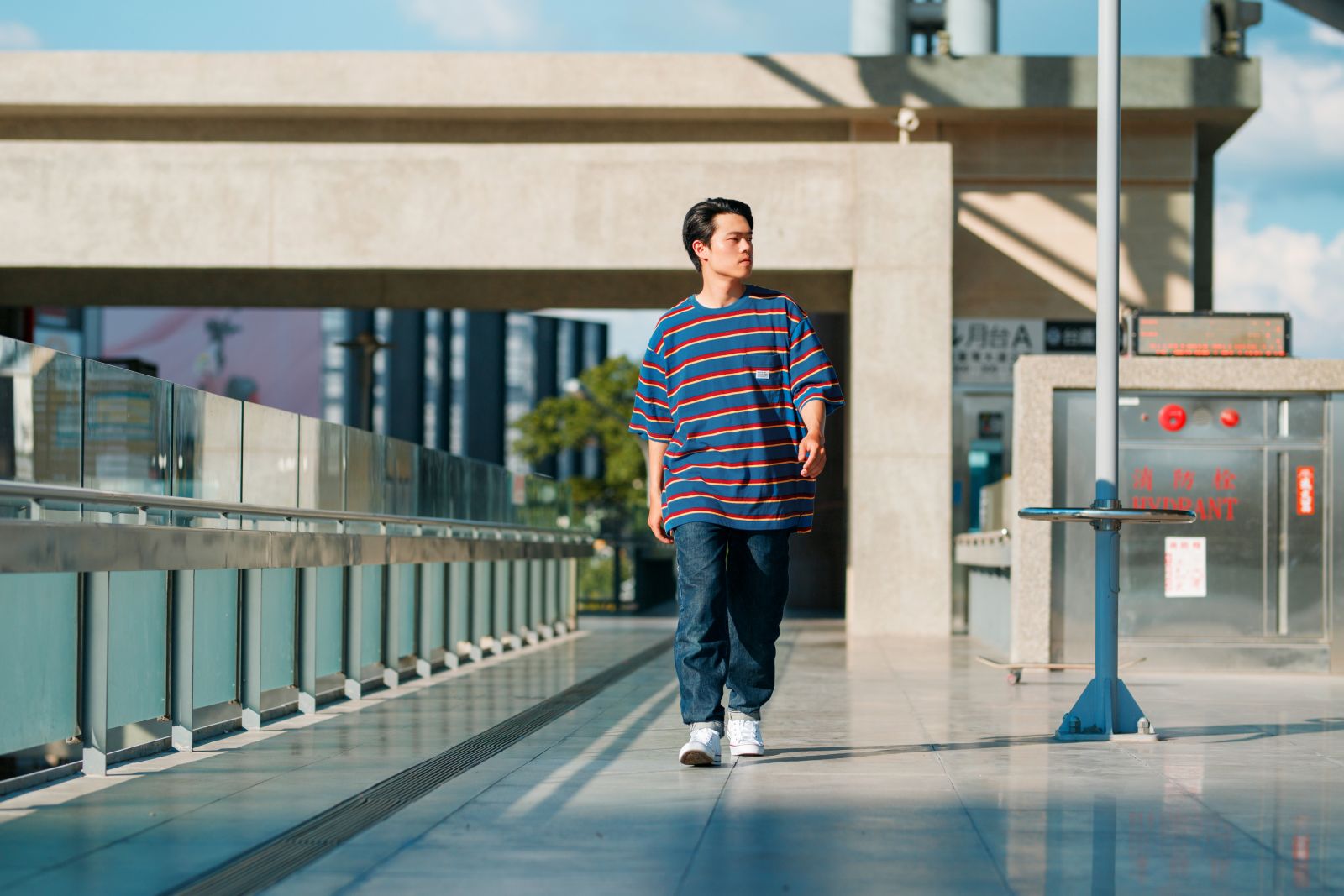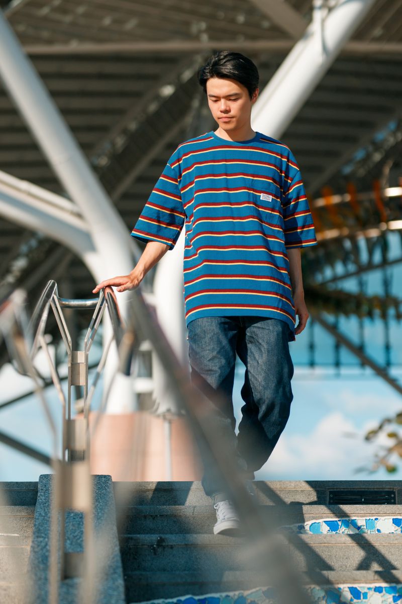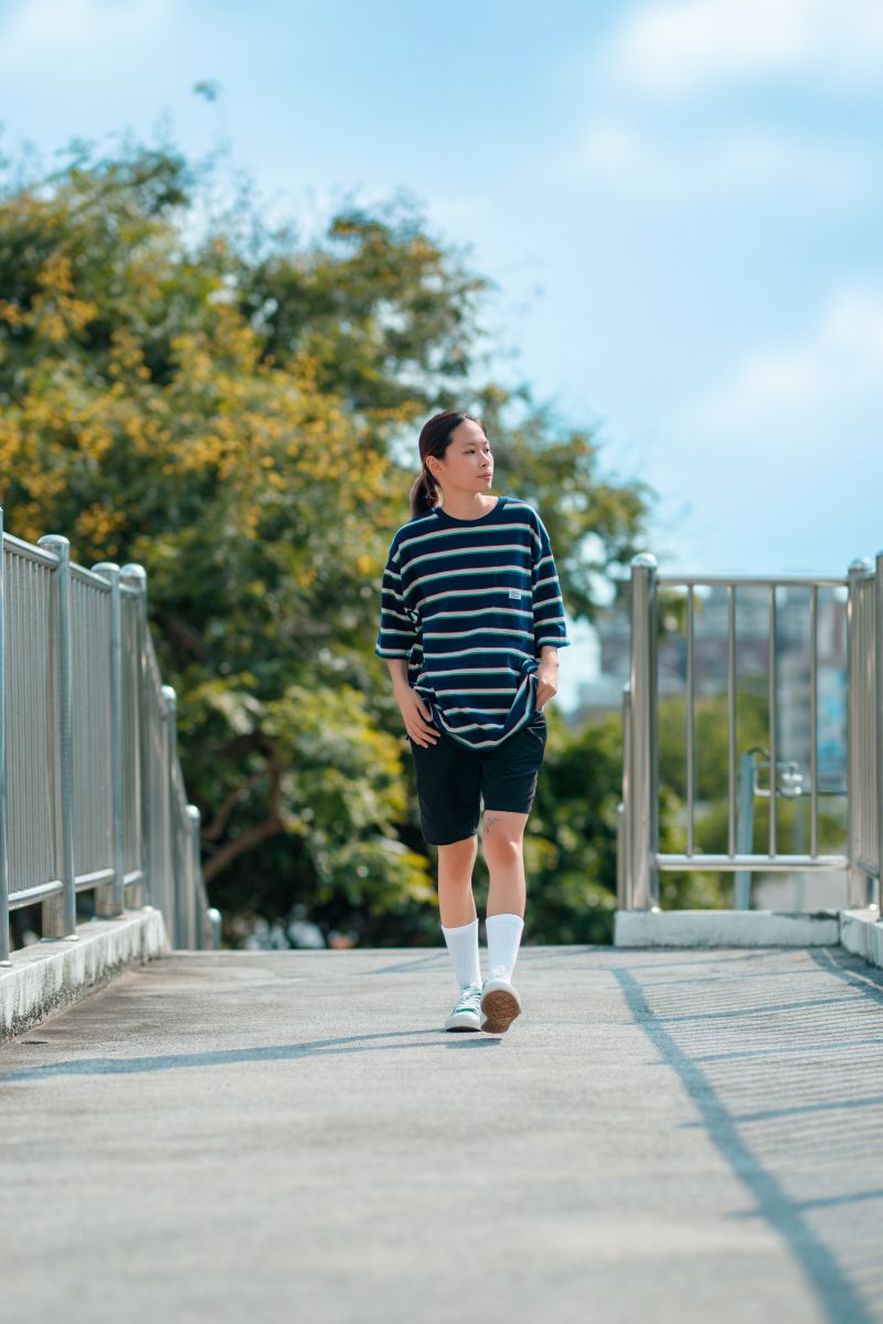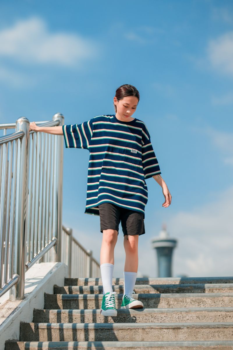 結合穿搭潮流中經典的條紋元素與寬鬆落肩版型設計,