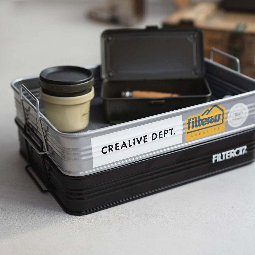 本次FILTER017將醒目的旗下品牌選物店CREALIVE DEPT.識別LOGO,以網版印刷方式呈現於高品質之 PVC 材質貼紙中,與一般貼紙相較更為防水、抗撕、耐用、不殘膠且抗 UV 不易褪色,為INOUT質感生活增添亮眼點綴。