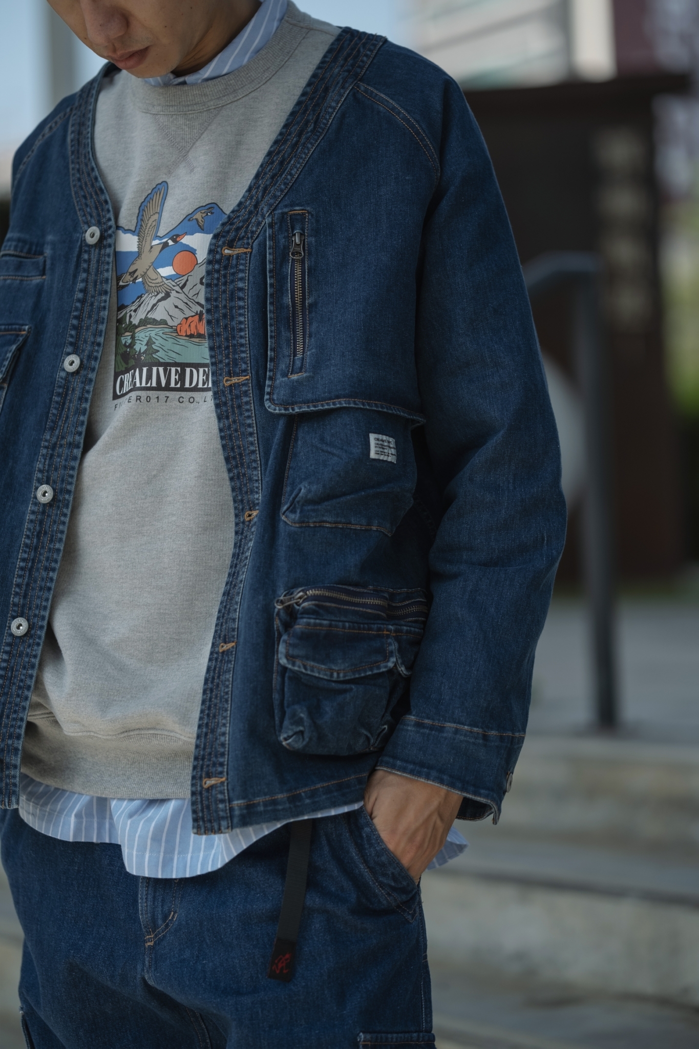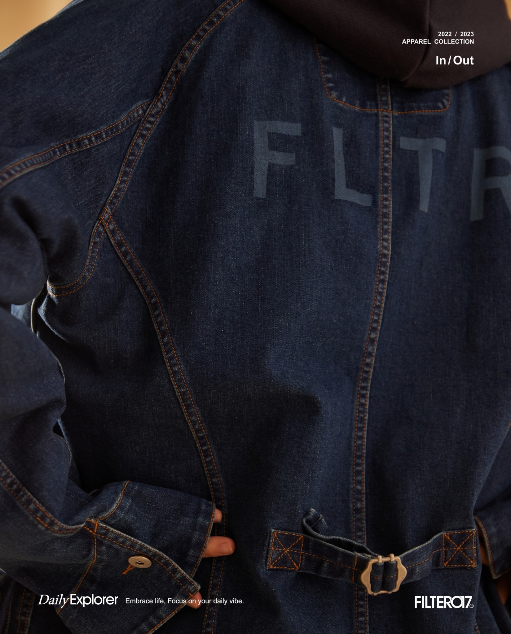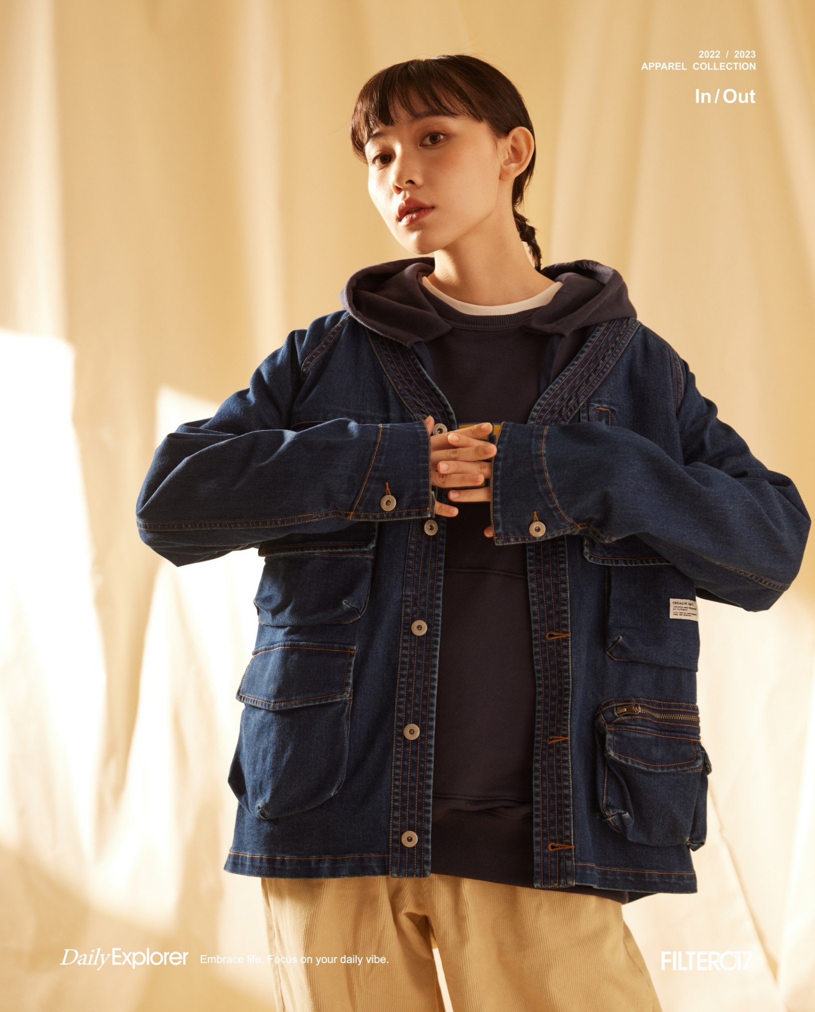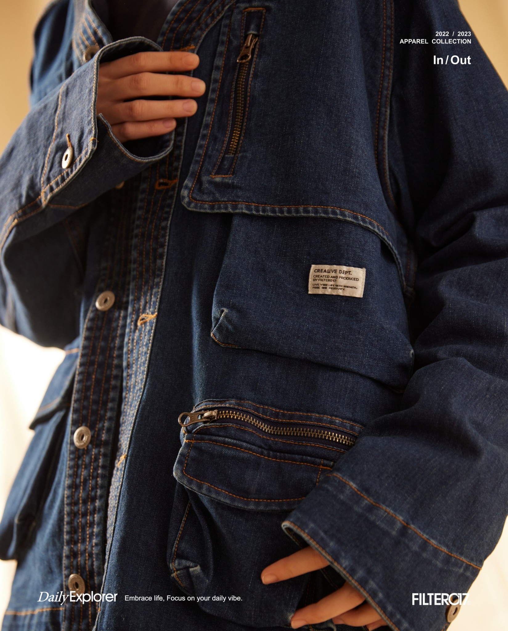 以70年代工裝外套作為靈感原型,舒適休閒為複合考量,V領開襟剪裁與寬鬆俐落的輪廓版型,帶有些許彈性的丹寧材質酵素石洗處理呈現,細節考究復古戶外獵裝及軍工元素融入造型視覺及實用考量。