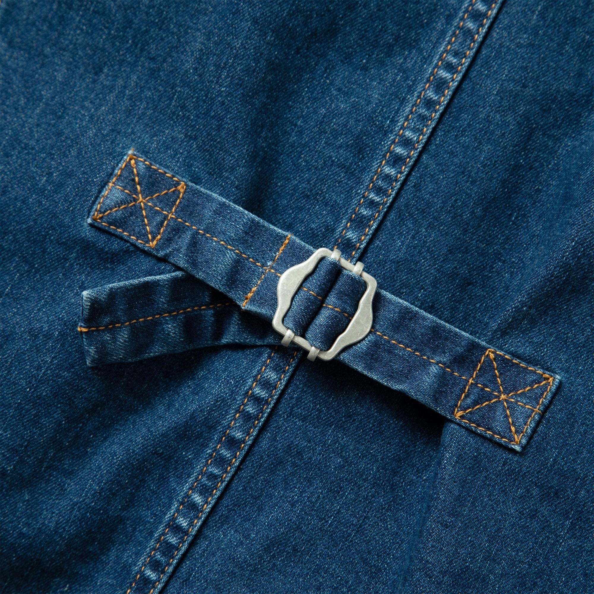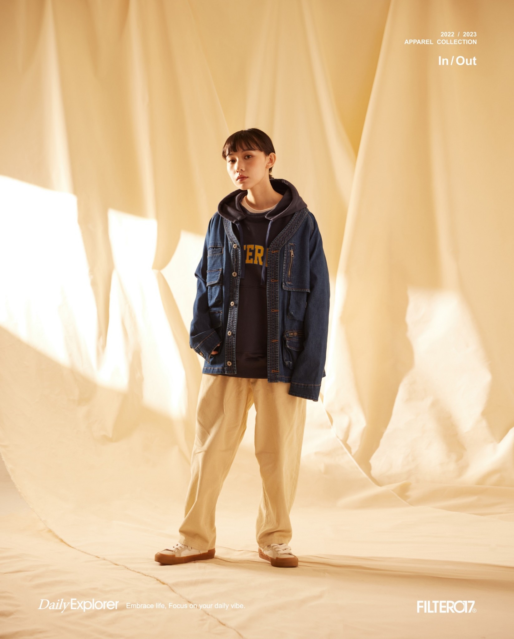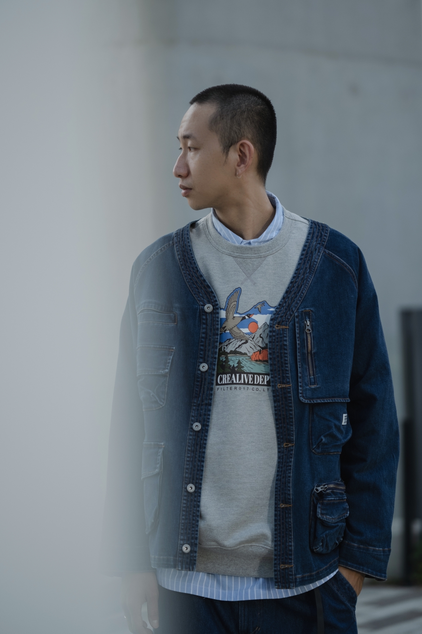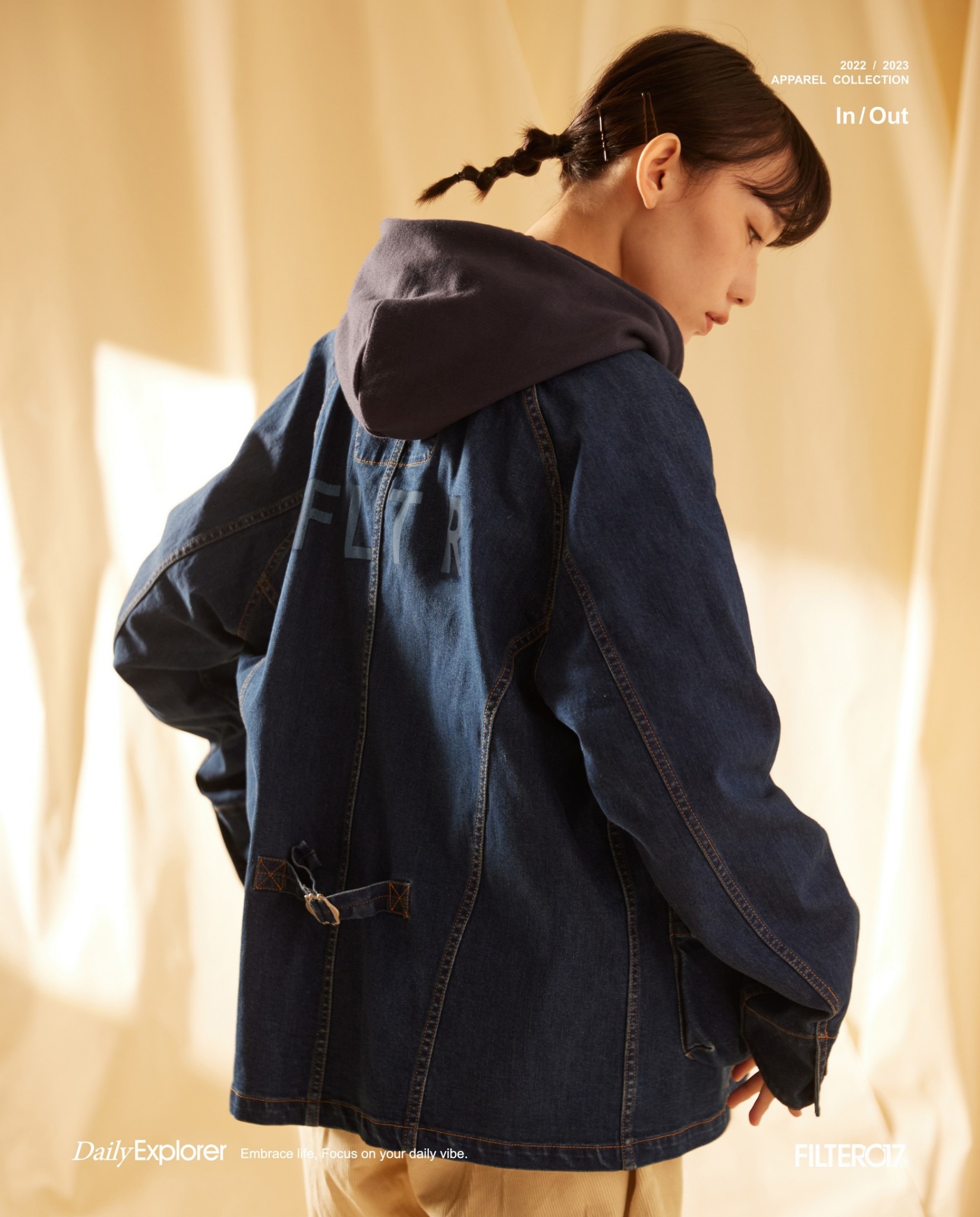 以70年代工裝外套作為靈感原型,舒適休閒為複合考量,V領開襟剪裁與寬鬆俐落的輪廓版型,帶有些許彈性的丹寧材質酵素石洗處理呈現,細節考究復古戶外獵裝及軍工元素融入造型視覺及實用考量。