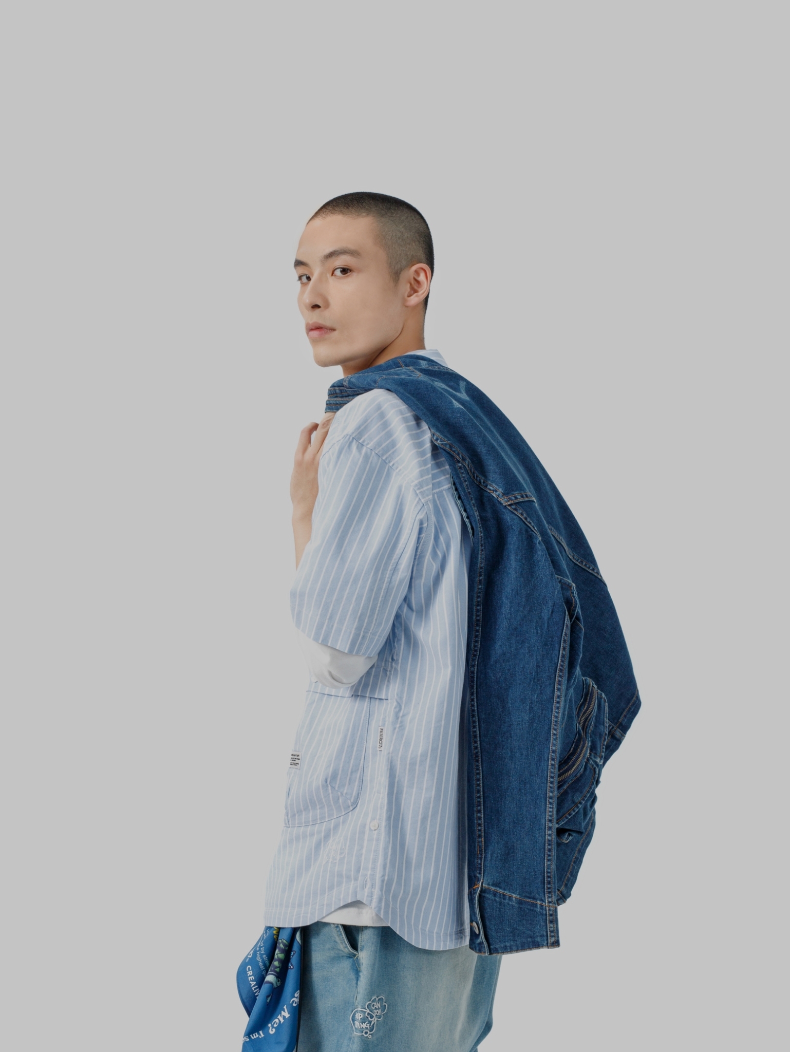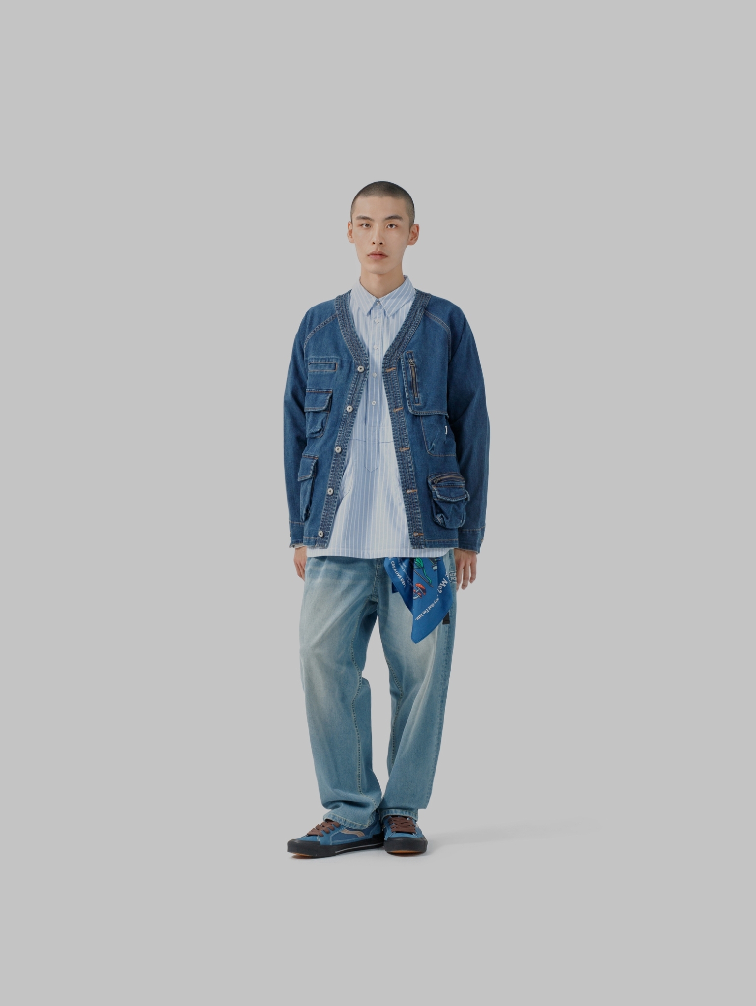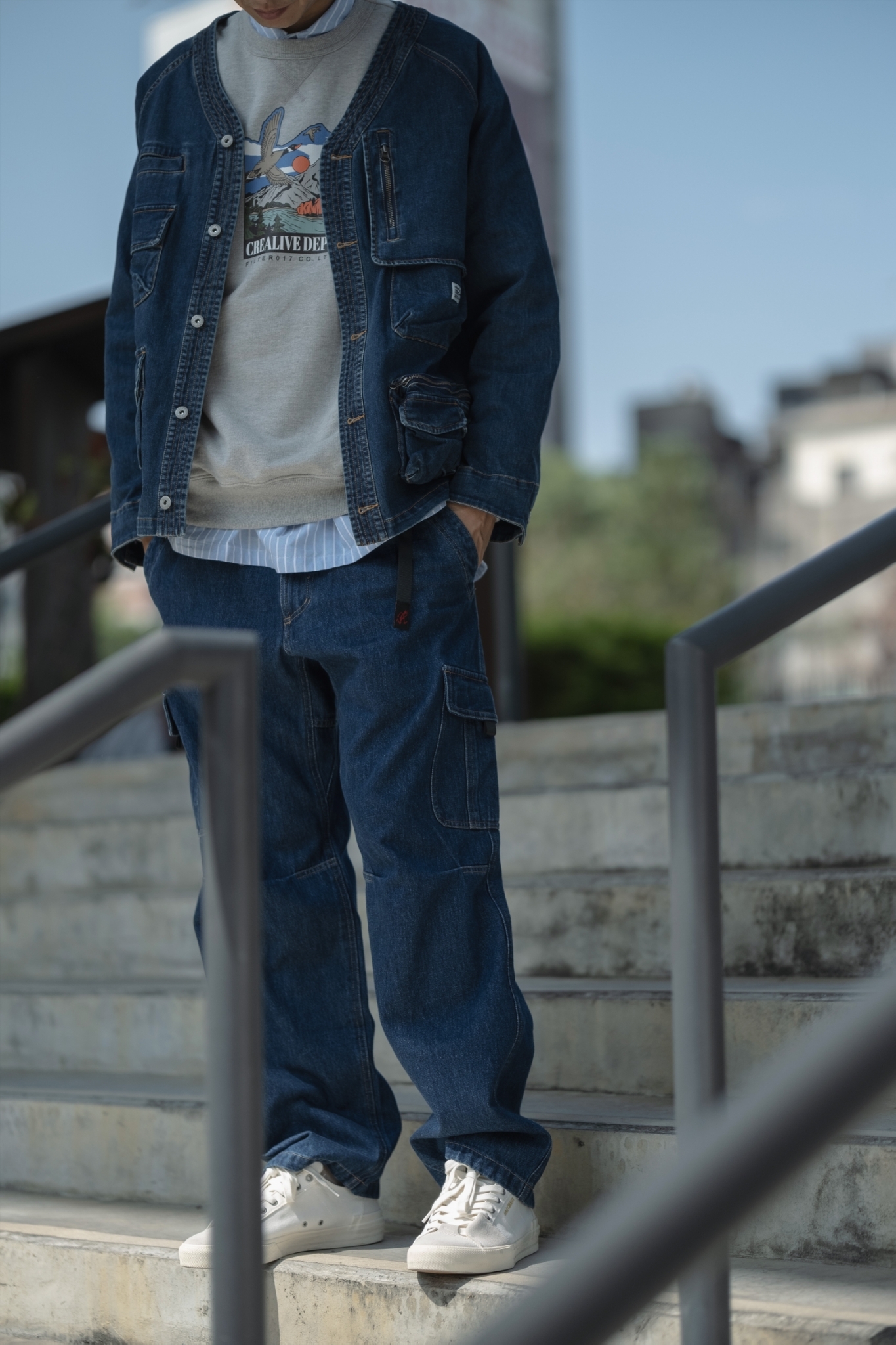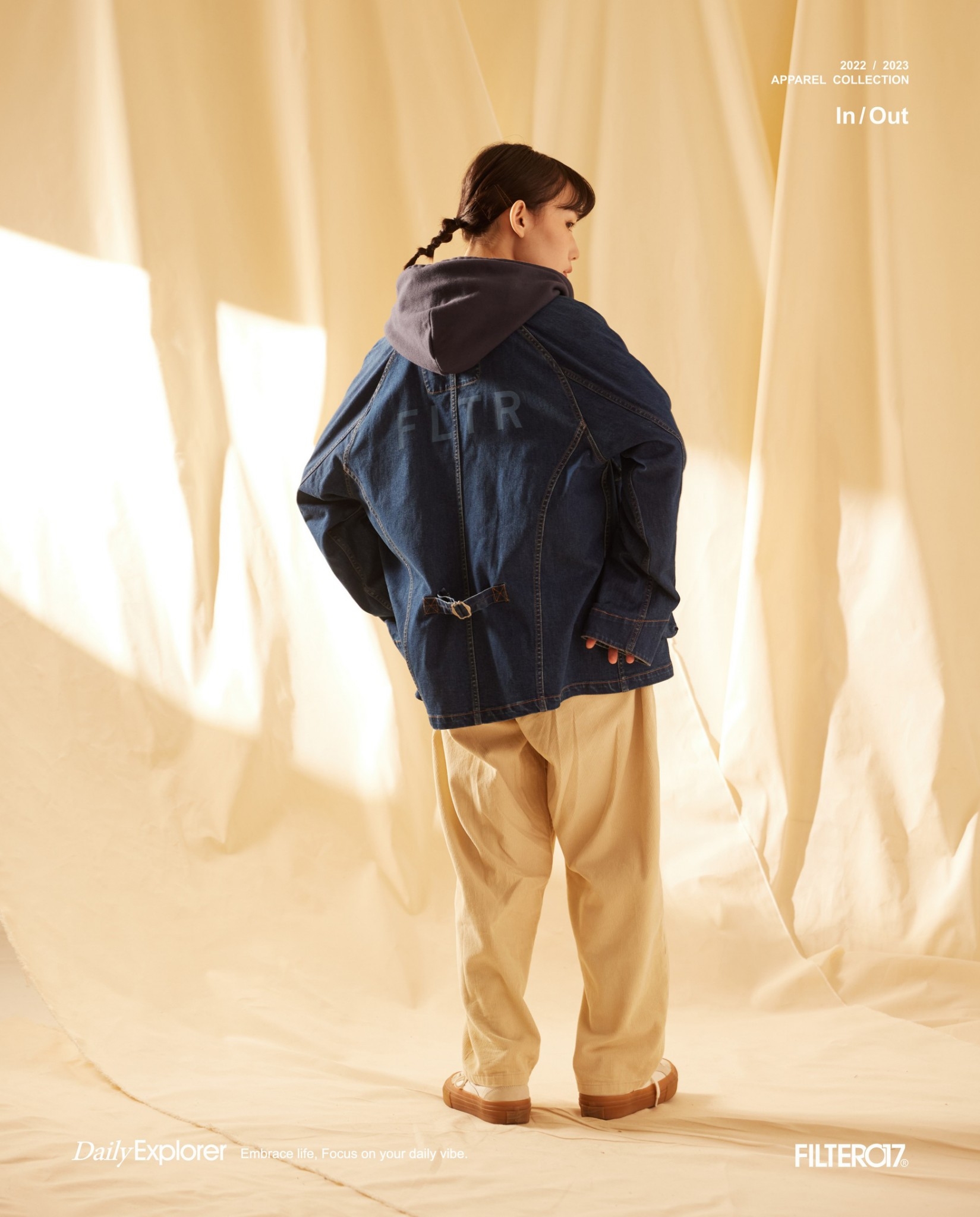 以70年代工裝外套作為靈感原型,舒適休閒為複合考量,V領開襟剪裁與寬鬆俐落的輪廓版型,帶有些許彈性的丹寧材質酵素石洗處理呈現,細節考究復古戶外獵裝及軍工元素融入造型視覺及實用考量。