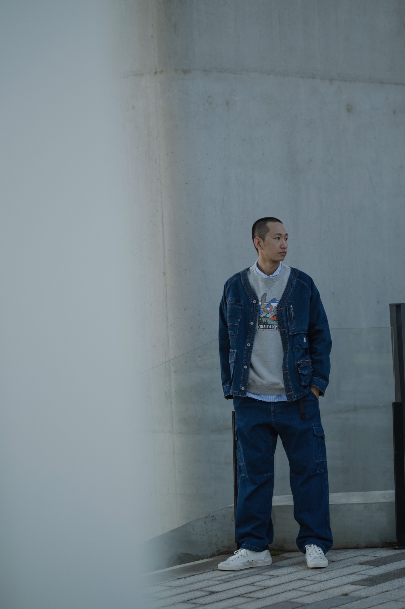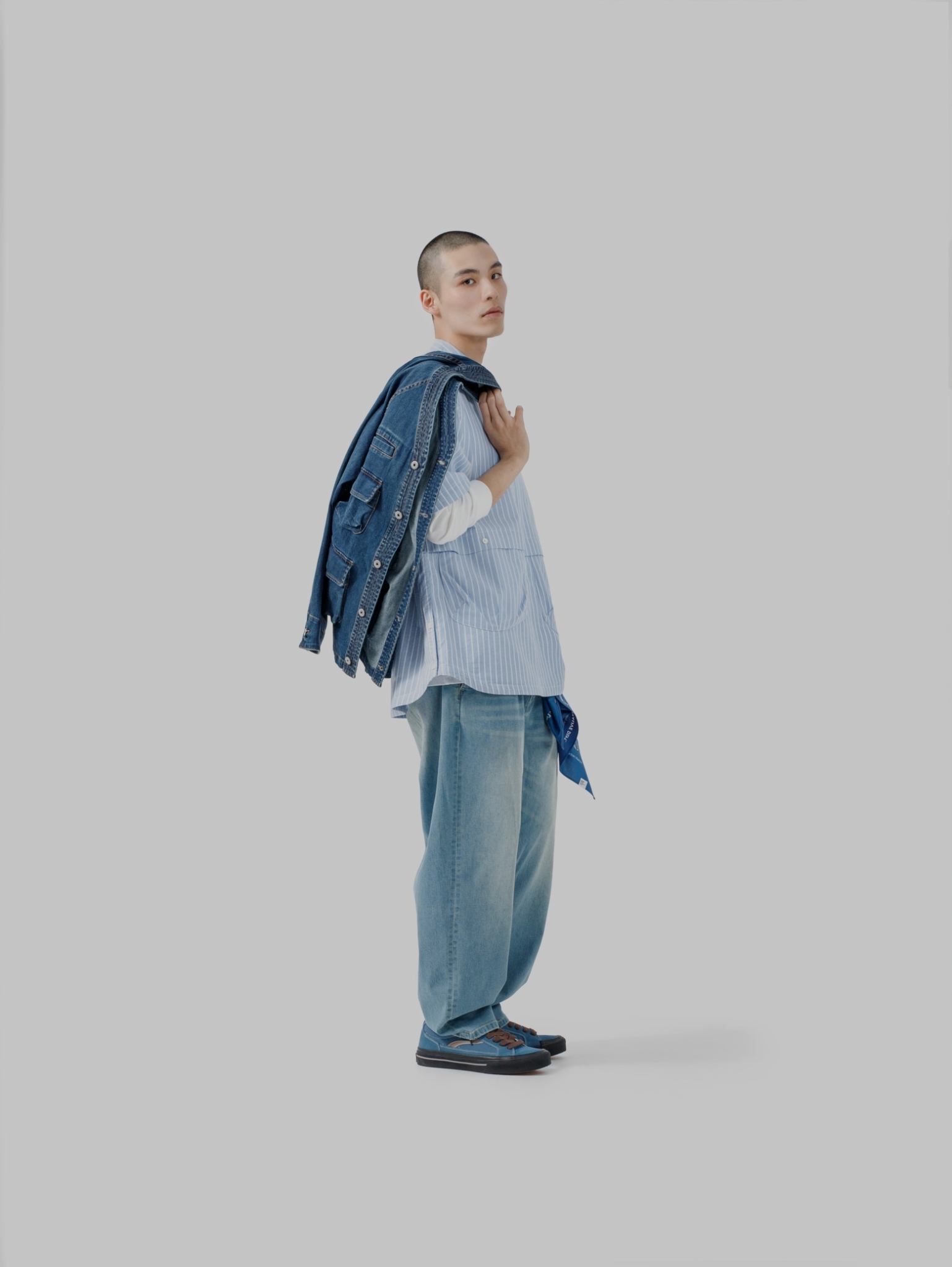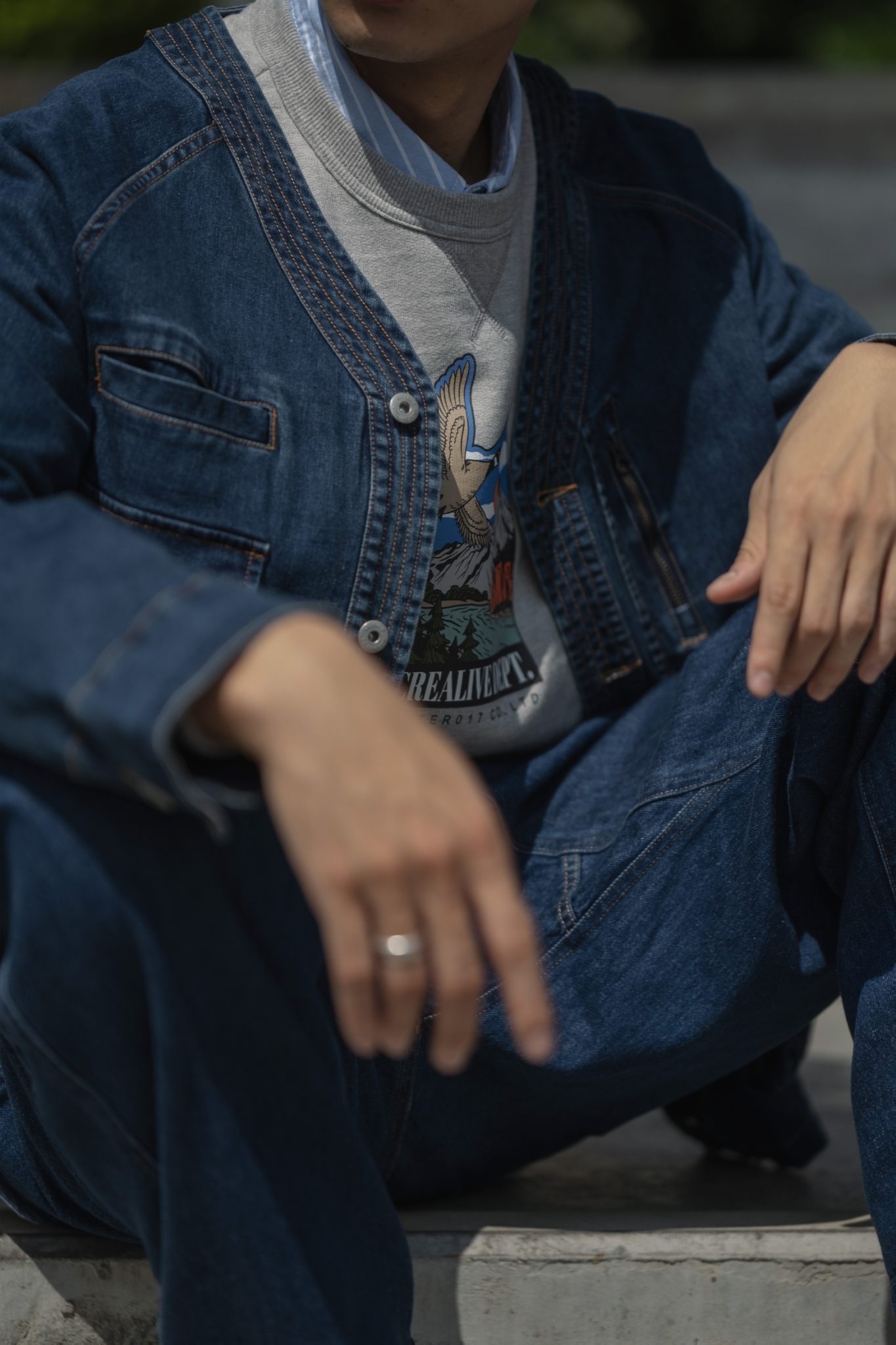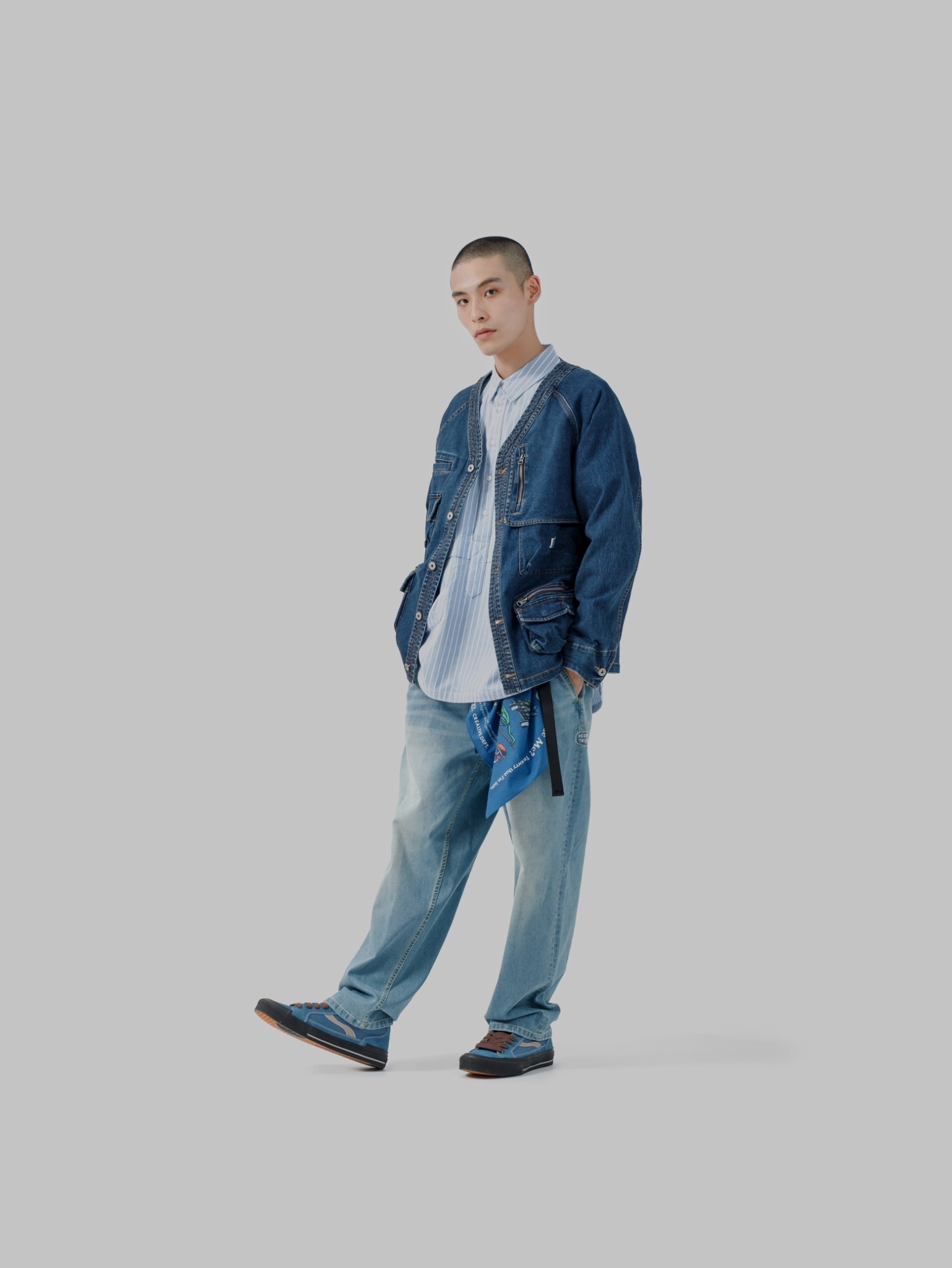 以70年代工裝外套作為靈感原型,舒適休閒為複合考量,V領開襟剪裁與寬鬆俐落的輪廓版型,帶有些許彈性的丹寧材質酵素石洗處理呈現,細節考究復古戶外獵裝及軍工元素融入造型視覺及實用考量。