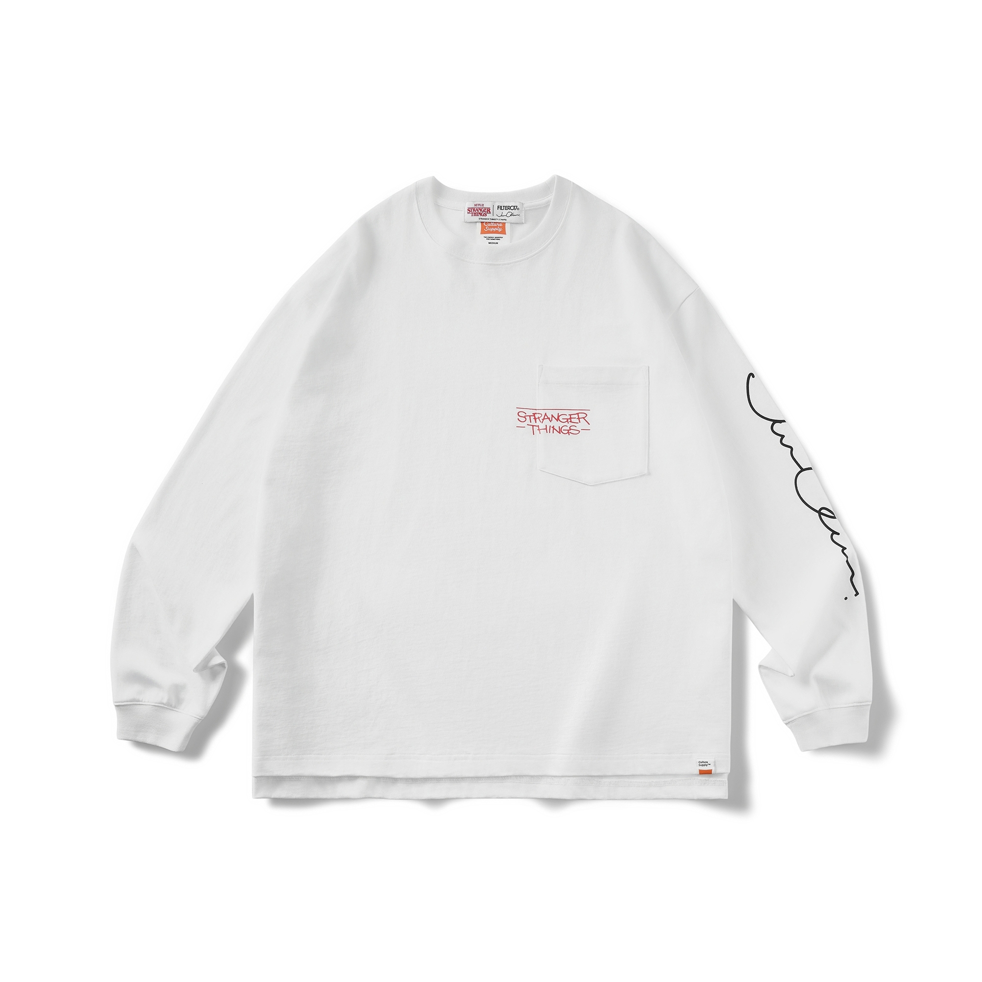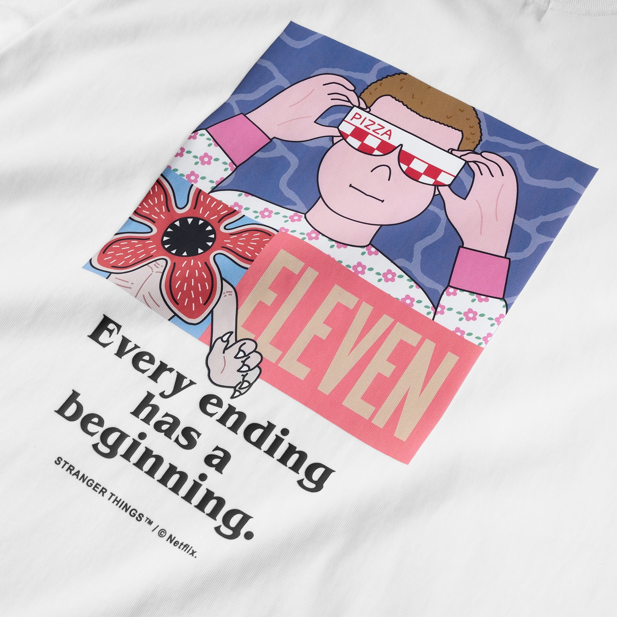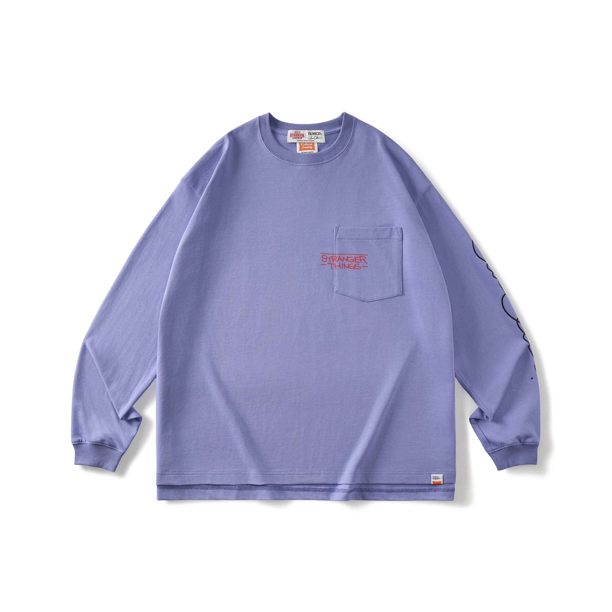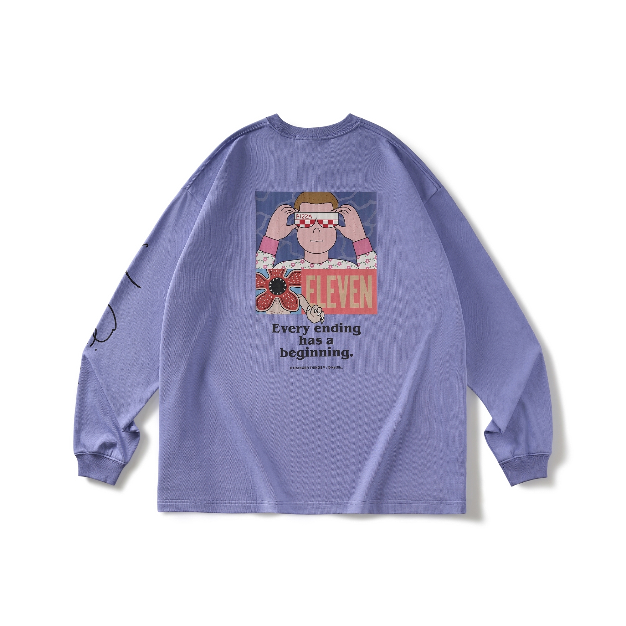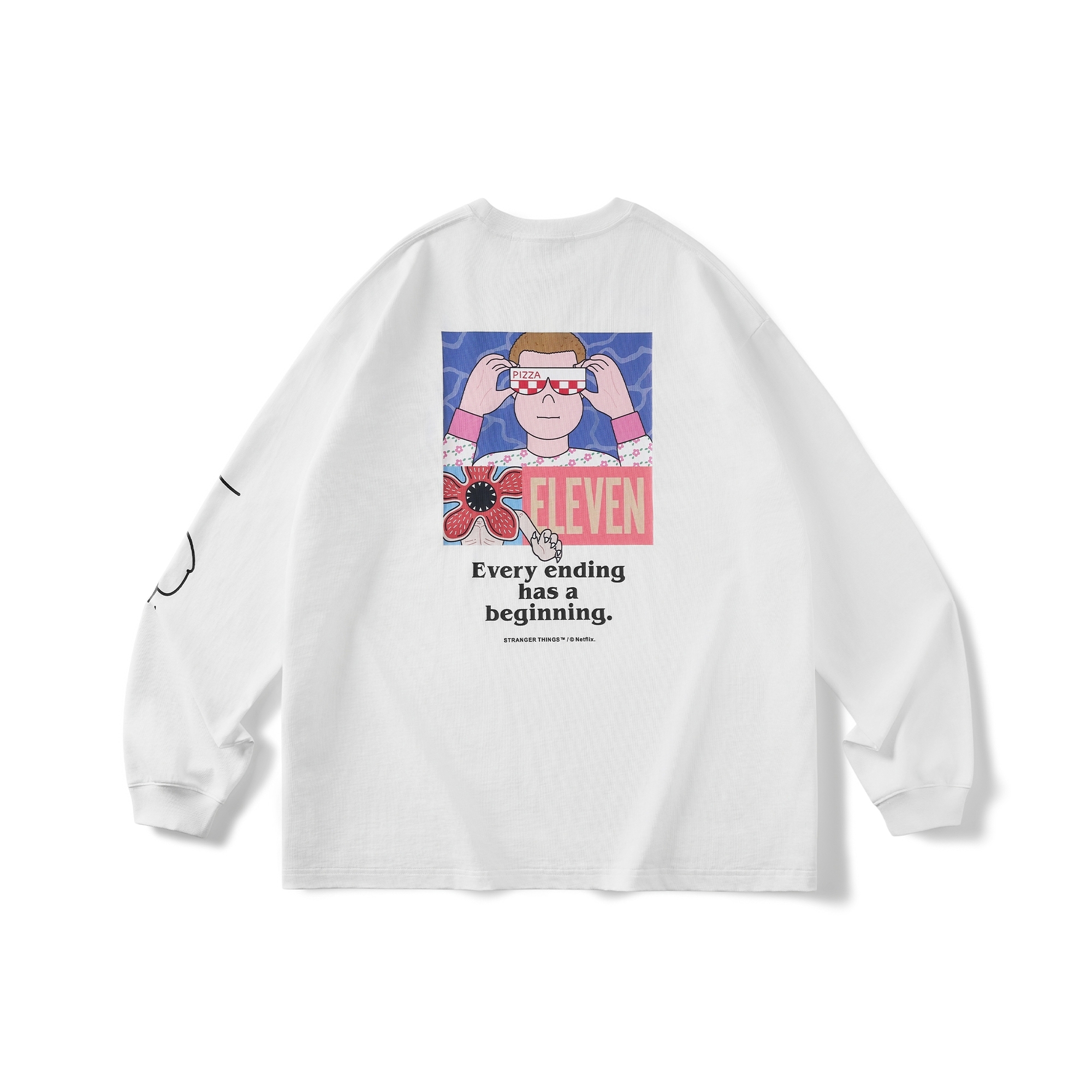 以Jun Oson 常見的視覺分割畫風,巧妙重現劇中戴上Eleven戴上披薩盒眼鏡的經典造型與張牙舞爪的魔神形象,呈現趣味而詭譎的對峙氛意象。嚴選厚實高品質棉質面料製作,落肩但不過顯鬆弛的寬鬆版型設計,前短後長的層次剪裁,提升穿著舒適度與增添穿搭視覺,為日常帶來絕佳的穿著體感及休閒氛圍。