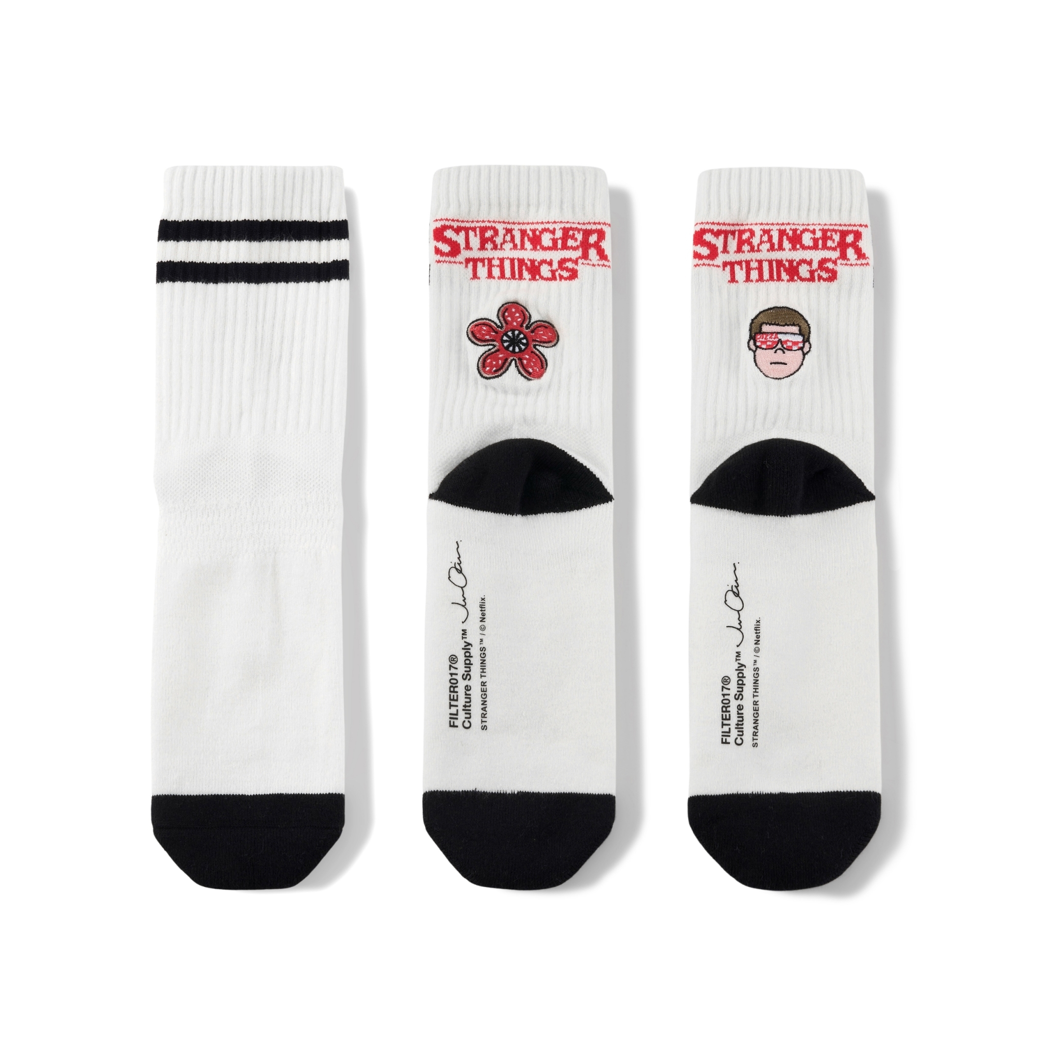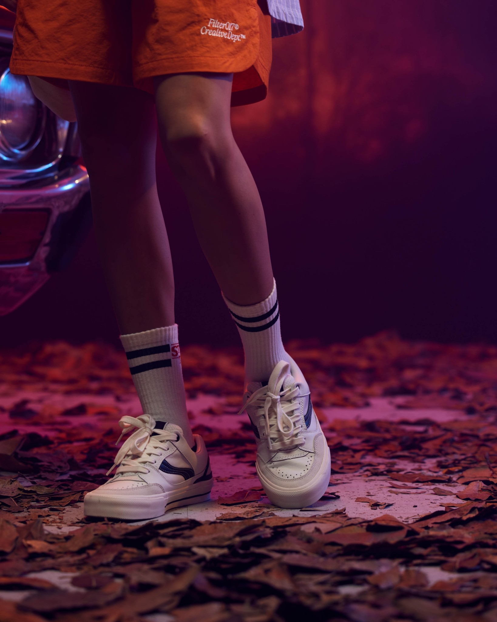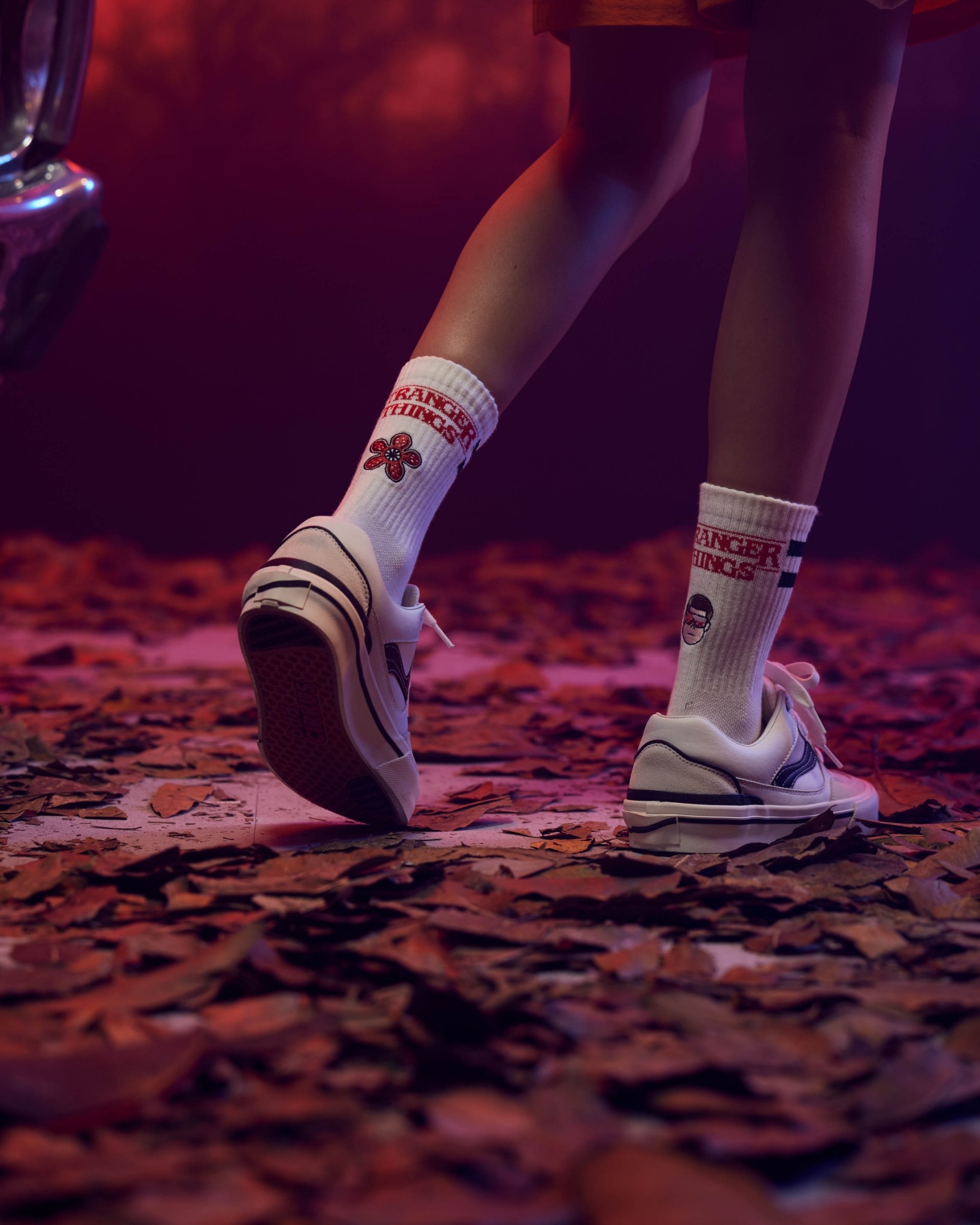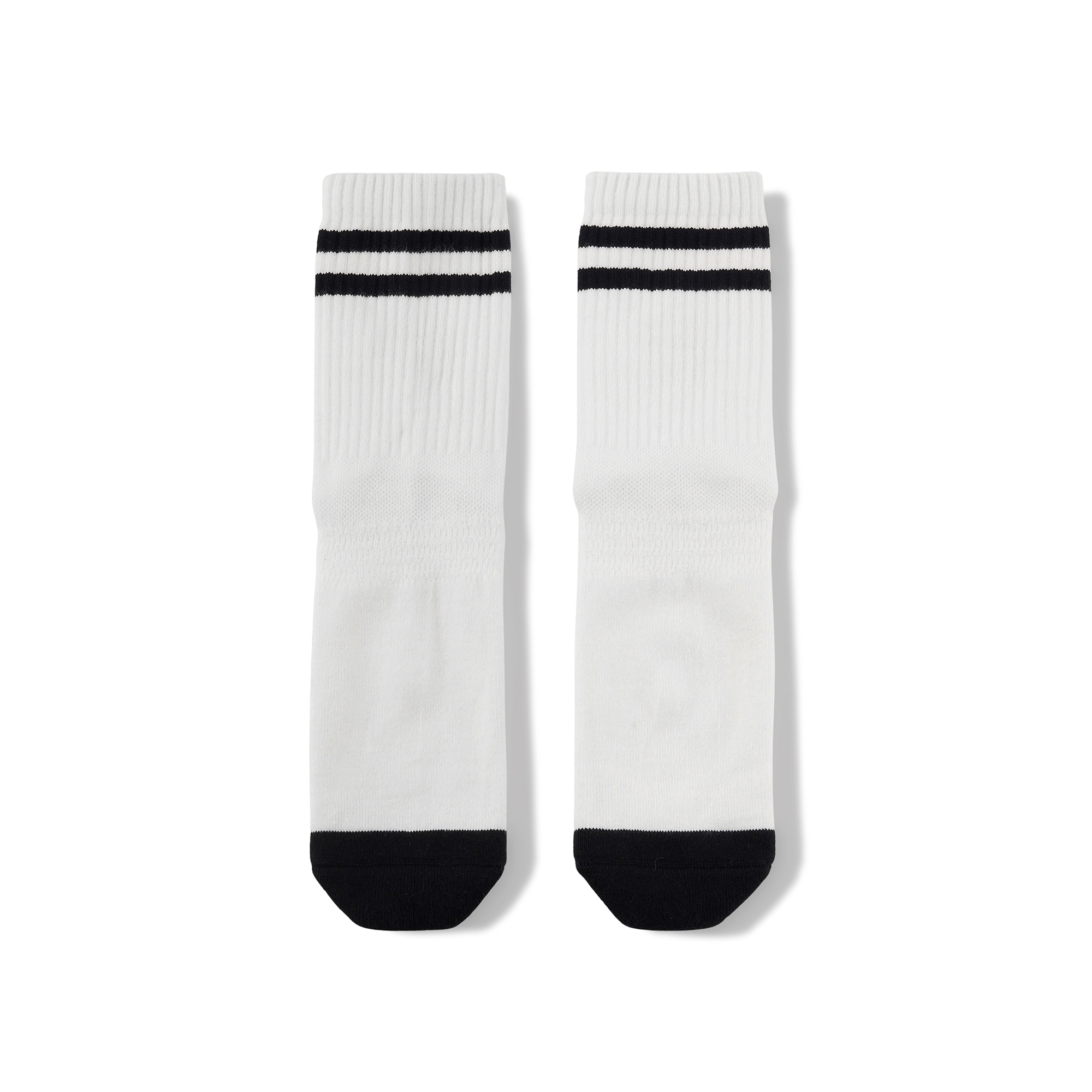 視覺考究80-90 年代美式學院運動風格,以經典鮮明的條紋樣式為基礎,搭配圖像電繡,並特別委託專精織襪的台灣知名品牌faam®製作,於襪身表面以多種織法增添層次及變化性。選用手感滑順的精梳棉以及Protimo® 抑菌紗、LYCRA® 彈性纖維、毛圈緩震,給予襪款最佳的品質與耐用度。