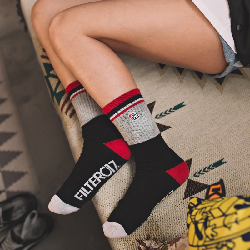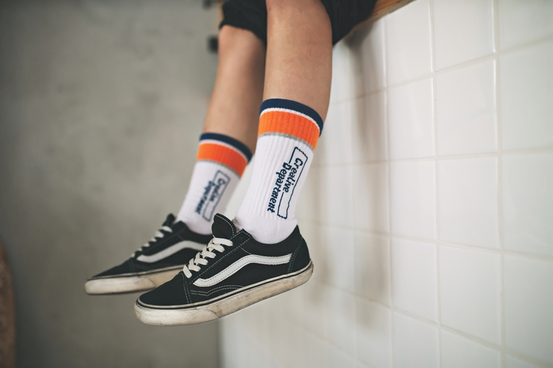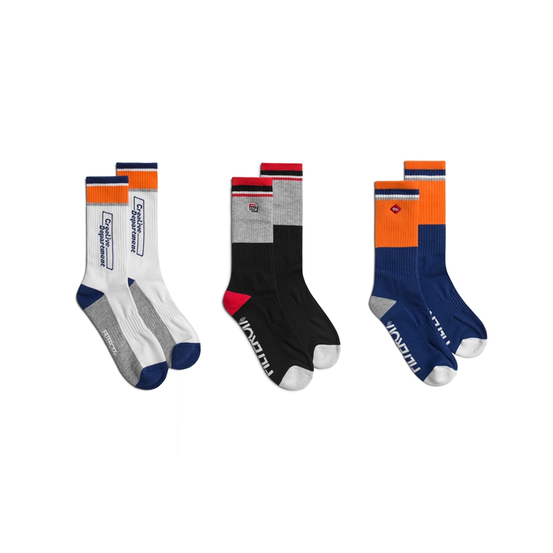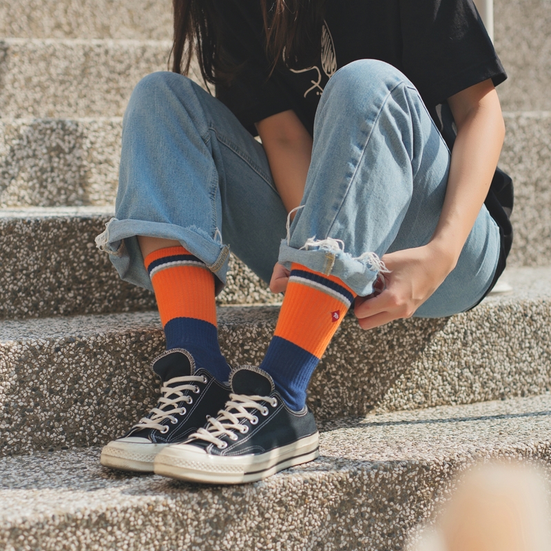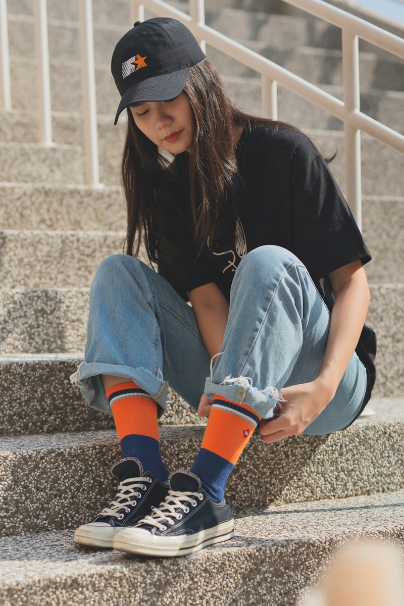 將充滿 90 年代風格的大色塊分割設計、飽滿明亮時代色彩的整體視覺經緻呈現於襪身款,