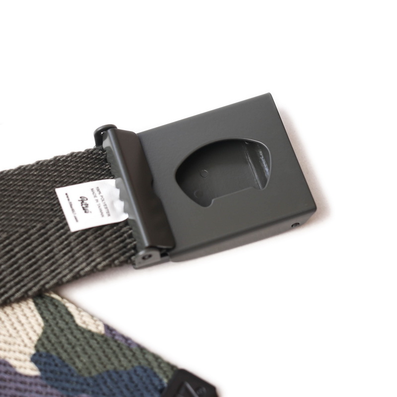 經典百搭的軍綠與迷彩配色,打造出帆布腰帶的休閒簡約風格及穿搭層次。