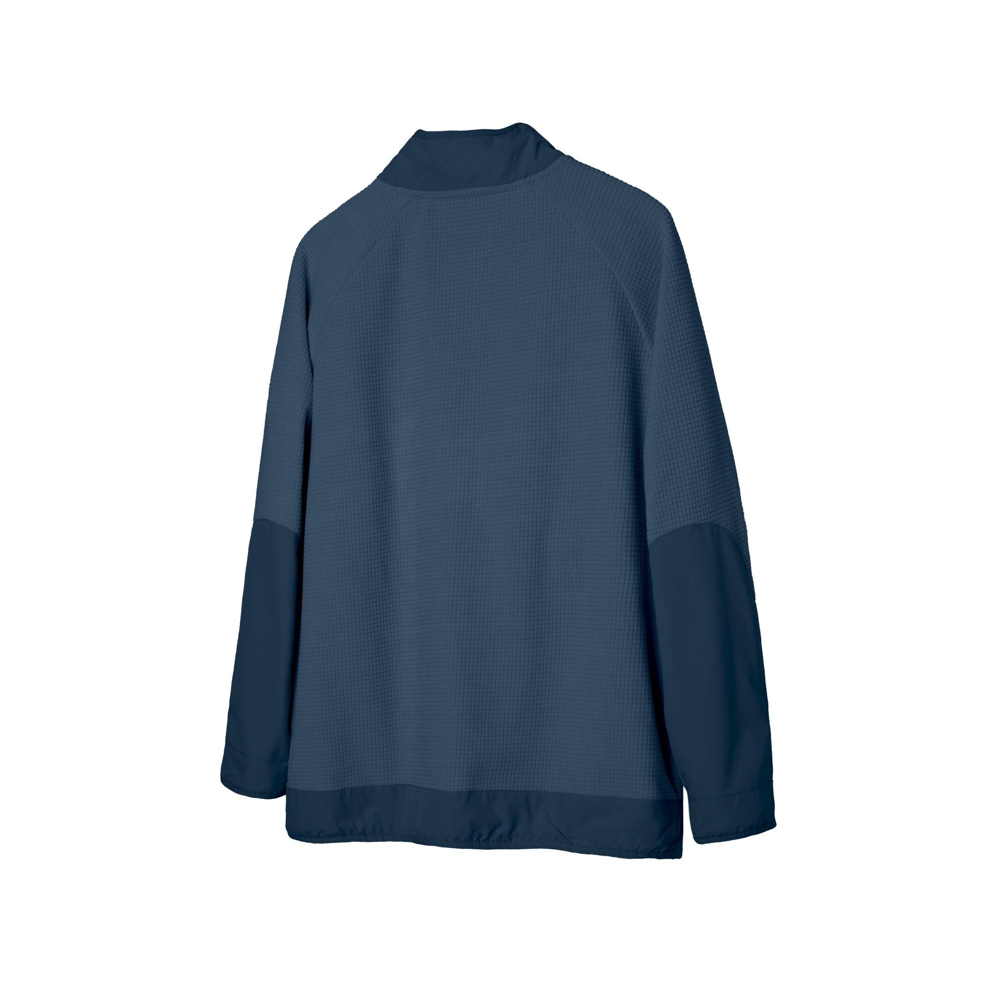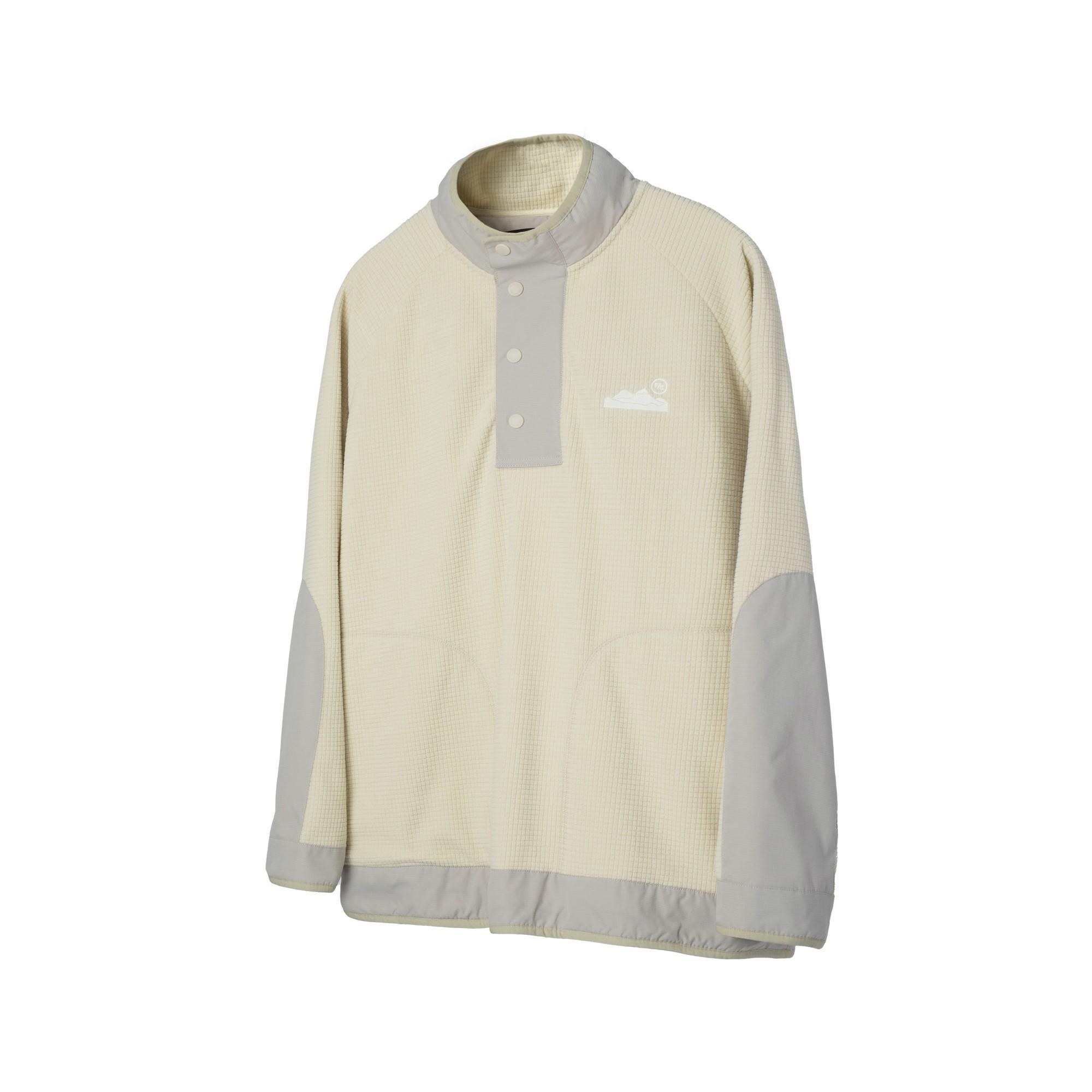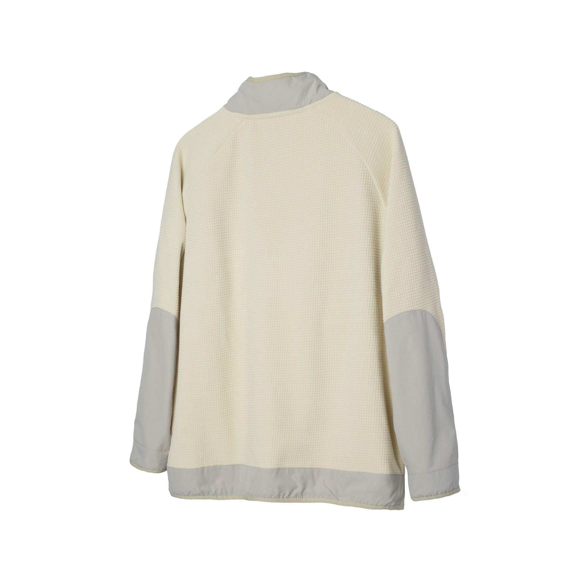 複合立領與半開襟套頭罩衫版型剪裁與異材質拼接設計,下擺抽繩可依照需求調整以利活動便利及阻絕冷空氣進入,衣身兩側暖手插袋設計為冬日增添保暖機能。