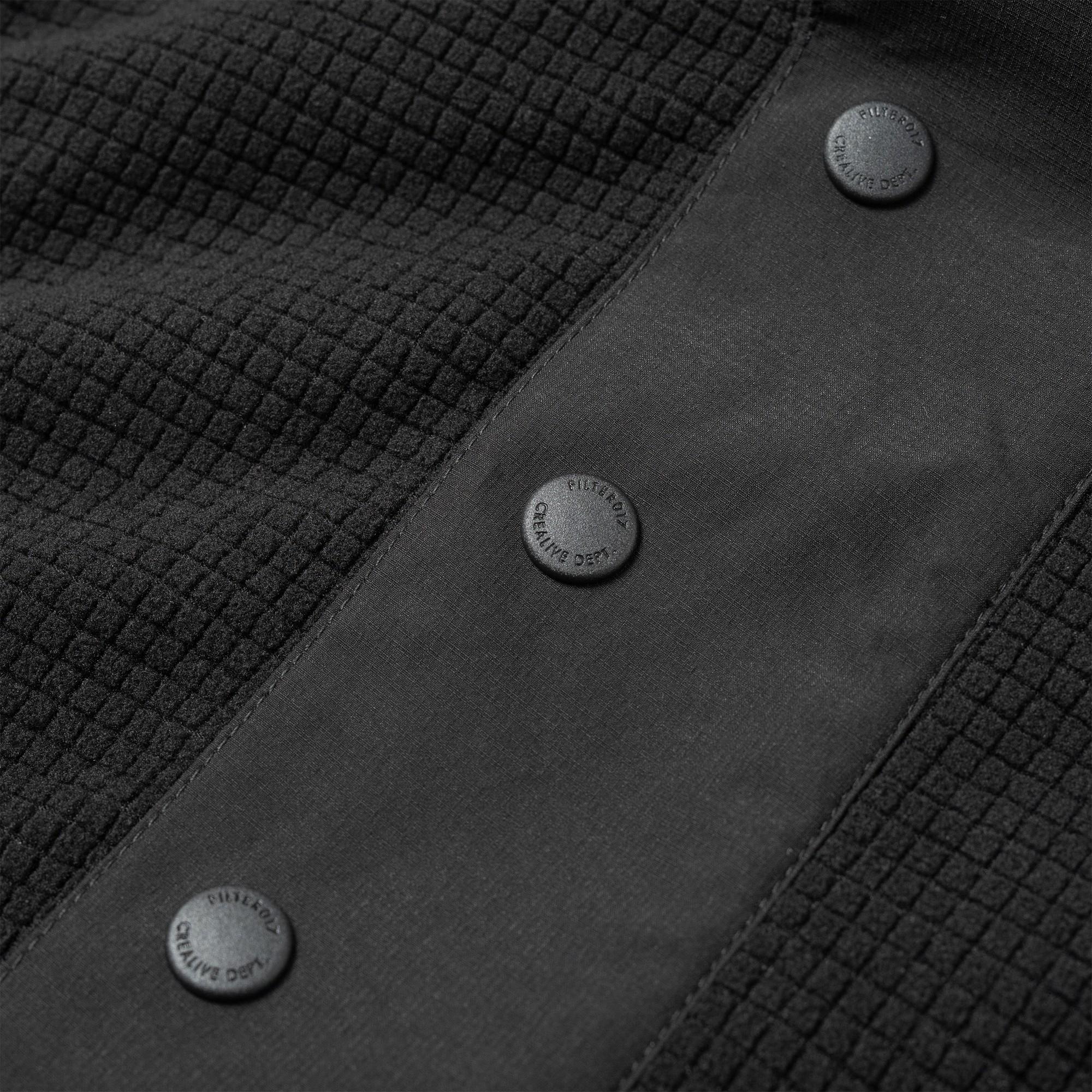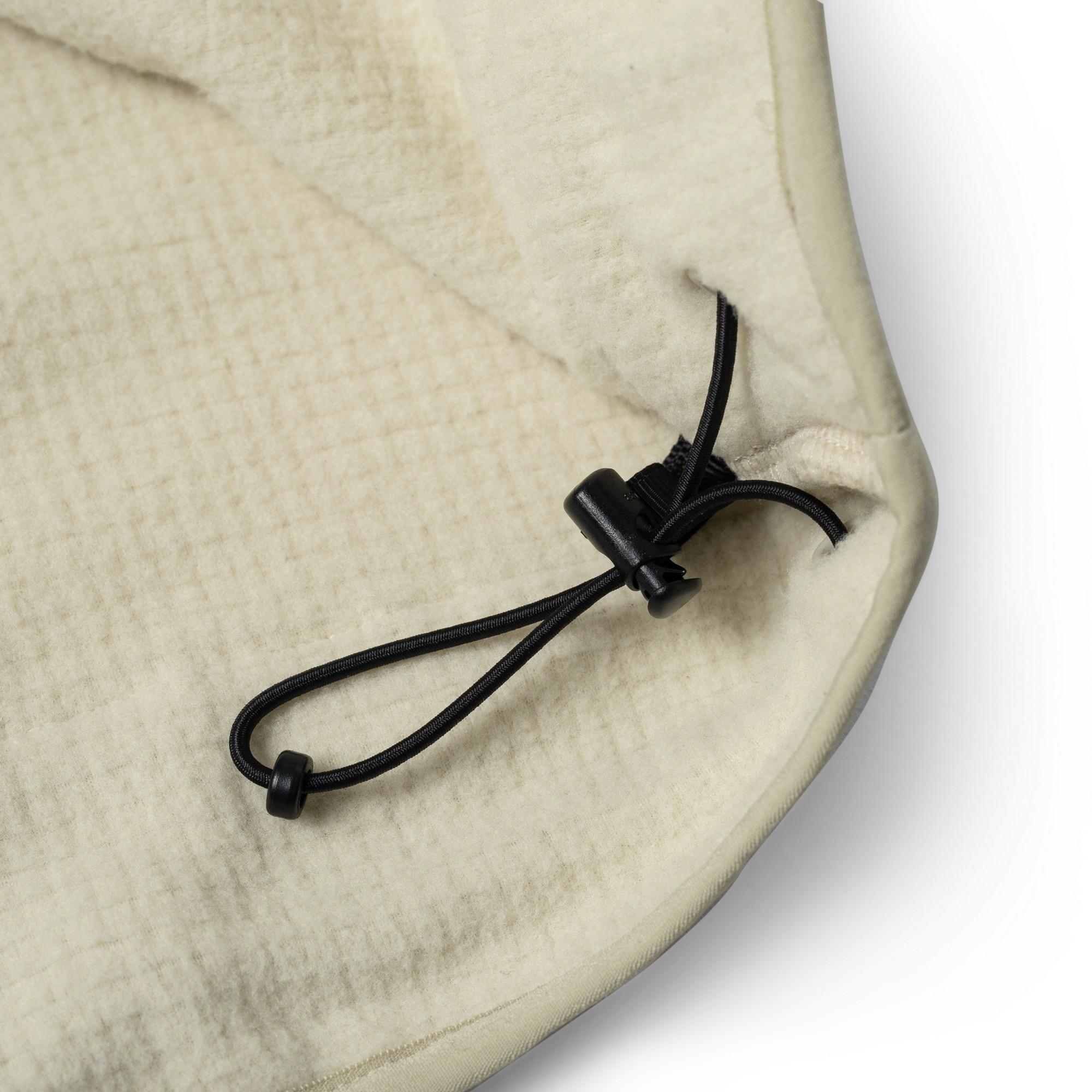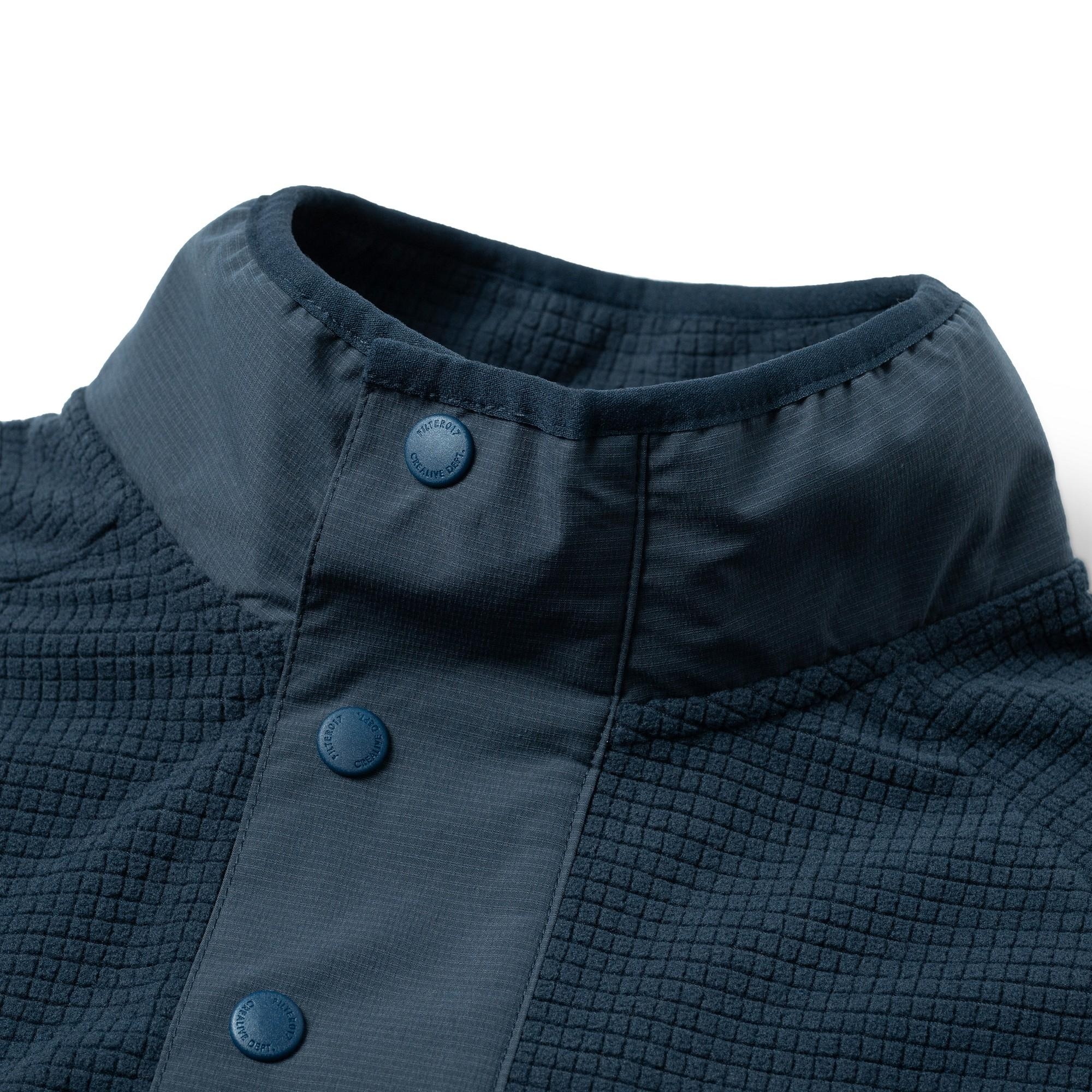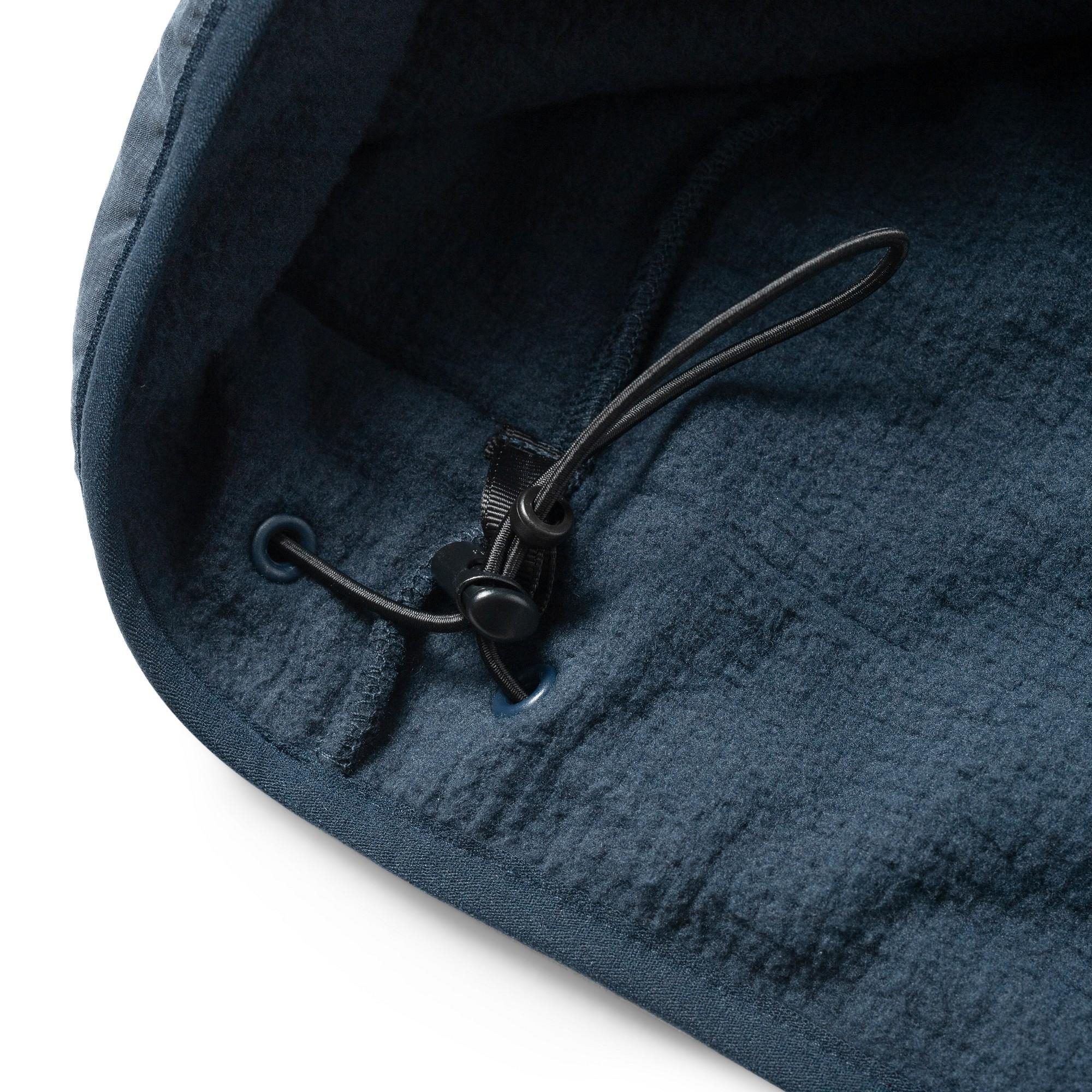 複合立領與半開襟套頭罩衫版型剪裁與異材質拼接設計,下擺抽繩可依照需求調整以利活動便利及阻絕冷空氣進入,衣身兩側暖手插袋設計為冬日增添保暖機能。