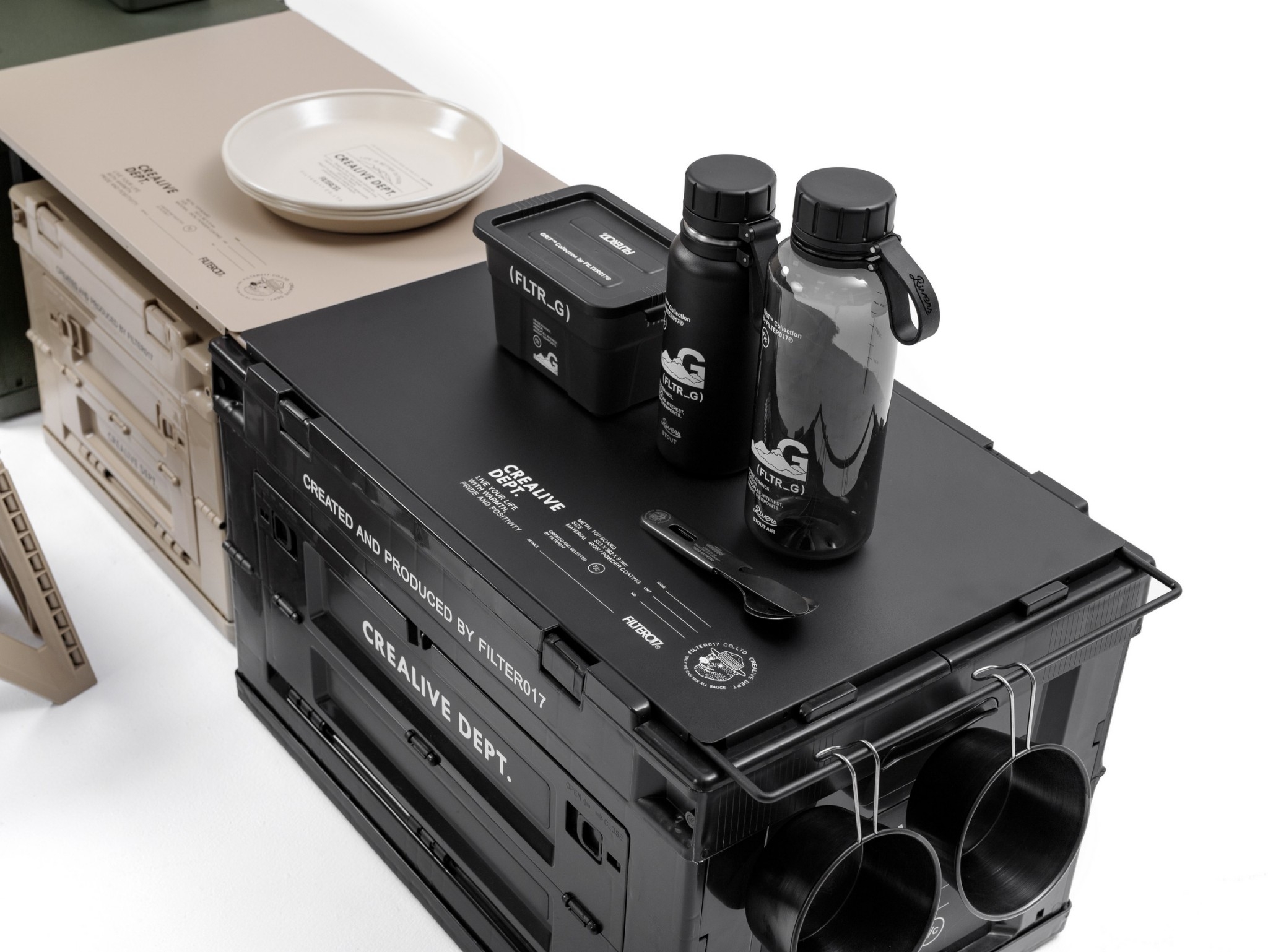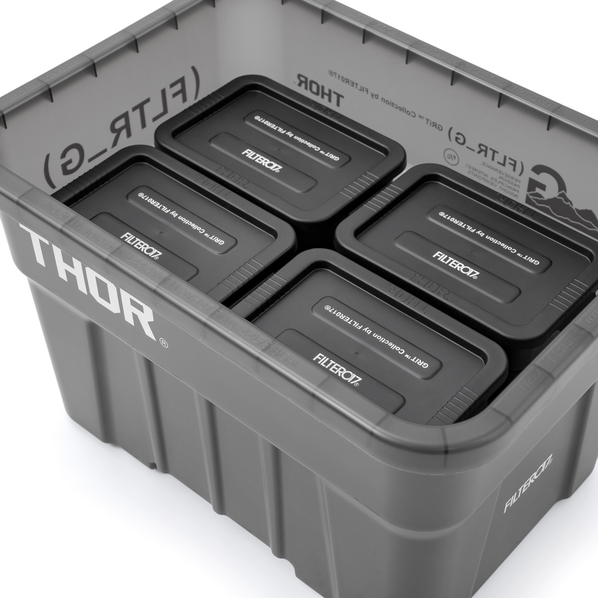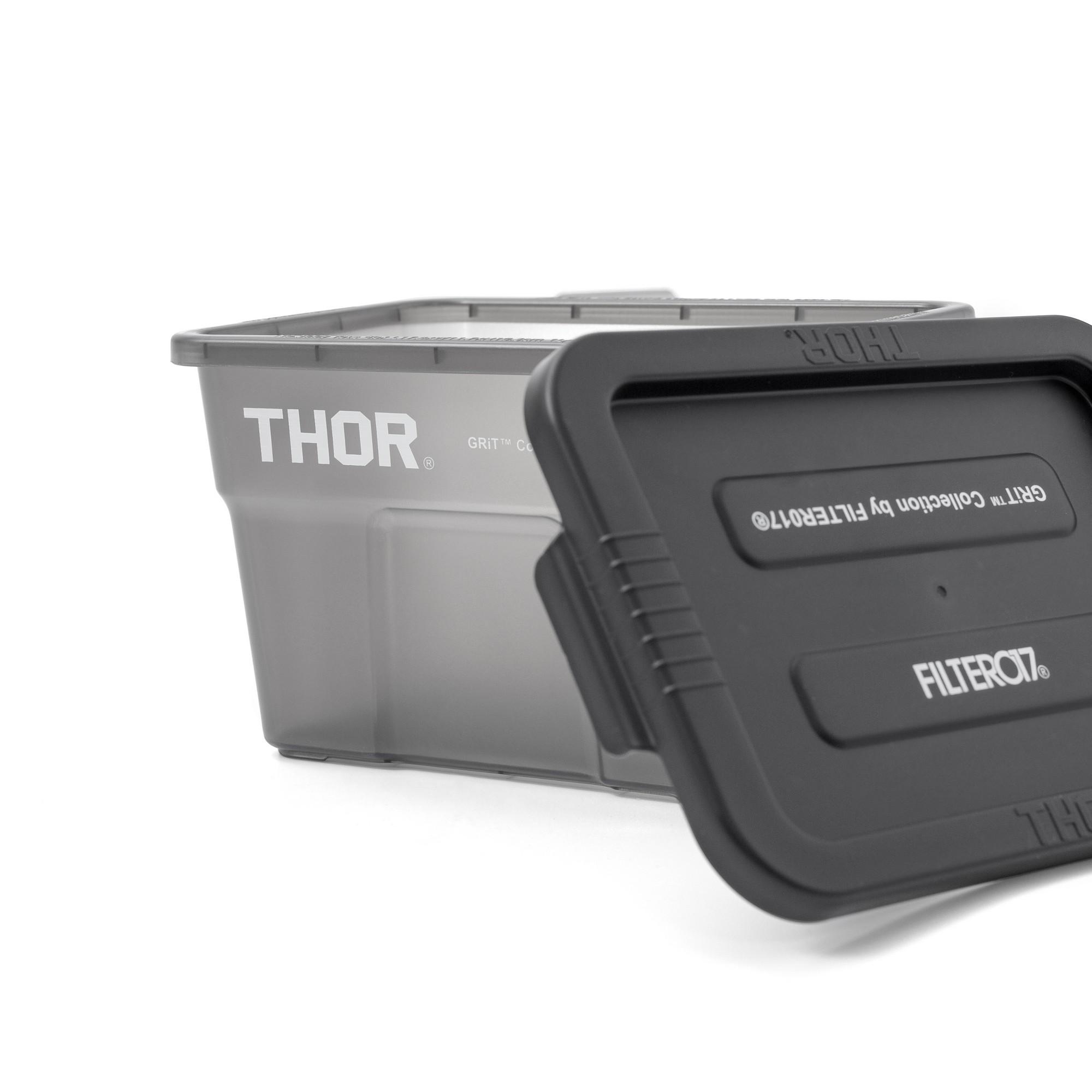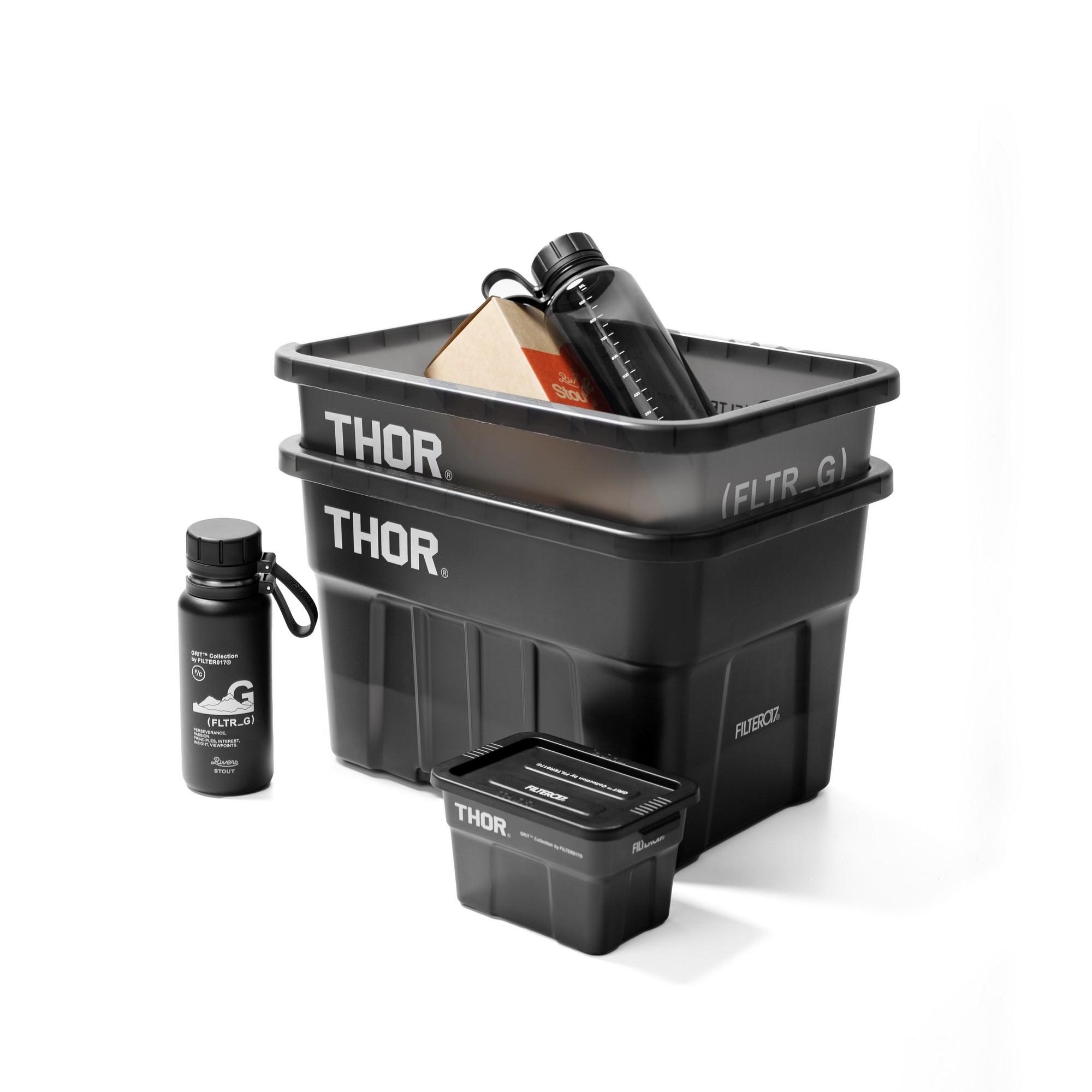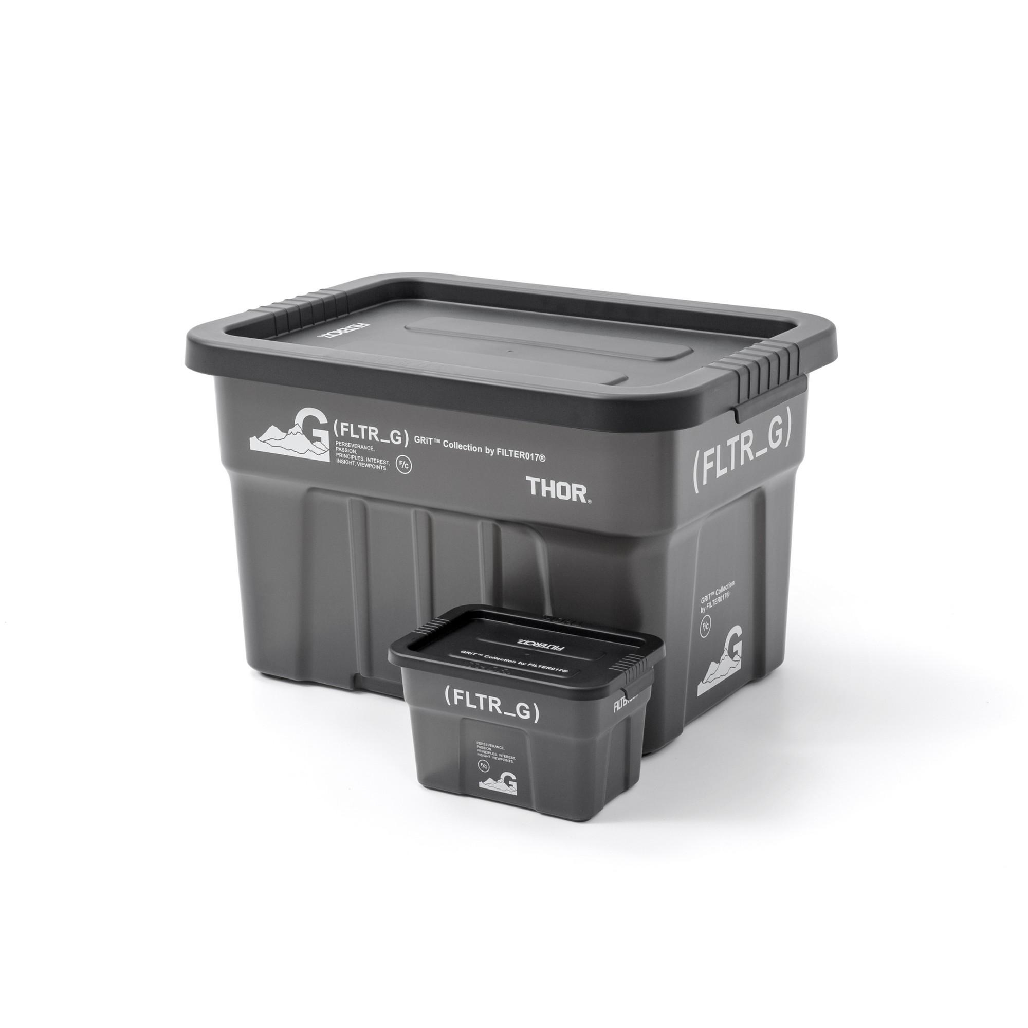 將FILTER017® GRiT™( FLTR_G ) 系列之機能概念與視覺,與美國知名工業收納容器品牌THOR® 完美結合,整體採用黑色作為主色調,箱體以半透明PP材質,搭配採用實色箱蓋專屬訂製聯名,攜手推出22L / Mini 兩款尺寸之多功能層疊收納箱。