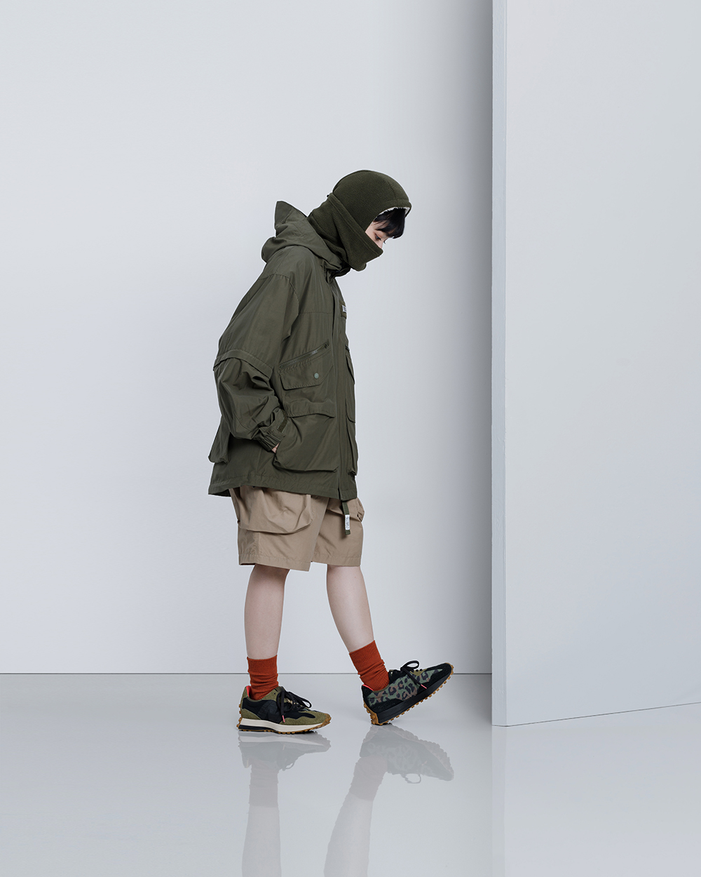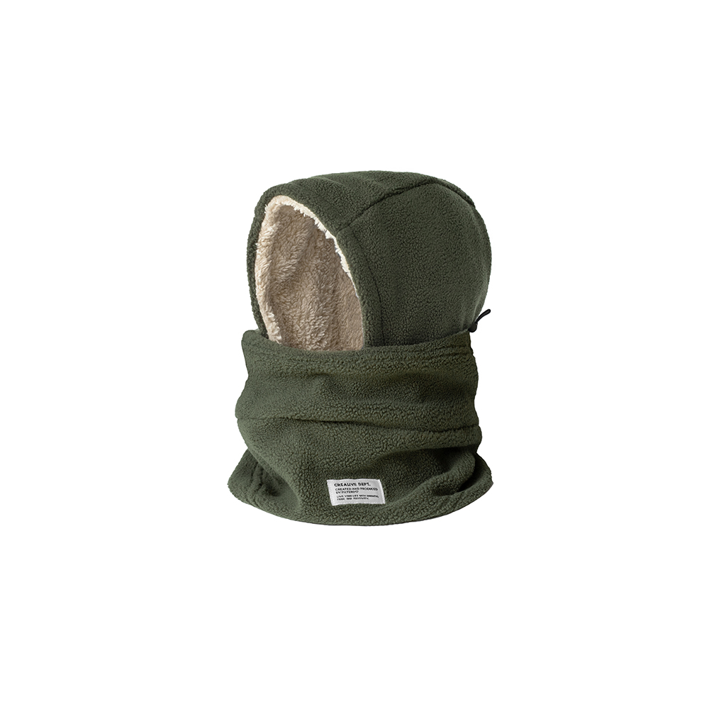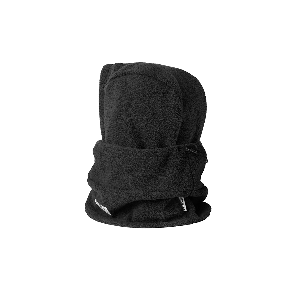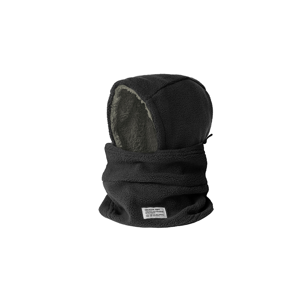 以如同羊毛般蓬鬆、輕量兼具保暖機能的搖粒絨人造纖維作為防寒面罩的主體材質,結合頭套和脖圍的雙重設計,當處於寒冷的戶外氣候時,可將面罩上緣拉起,並藉由後方的調節釦貼齊臉型,將臉部完整包覆。而可套入上衣領口的下擺設計,更可有效阻隔冷空氣進入、防止體溫流失,達到保暖的機能效果。