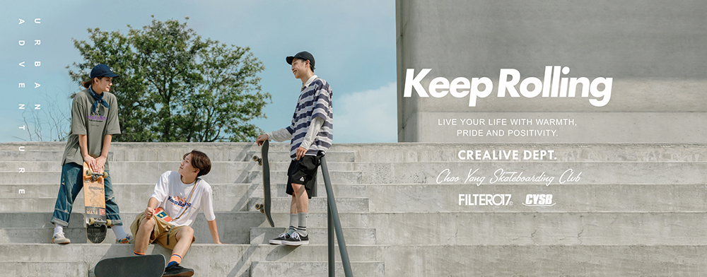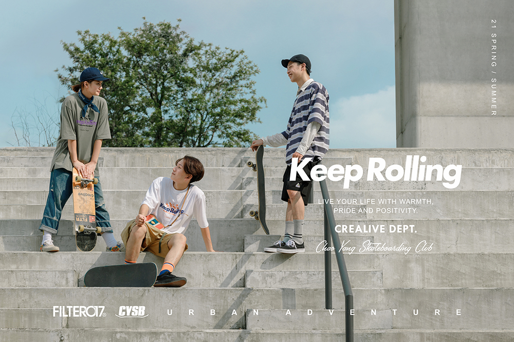Filter017以街頭文化 ─ 滑板做為本次設計發想,標語「Keep Rolling」不僅在滑板文化中具有「持續向前」之意,