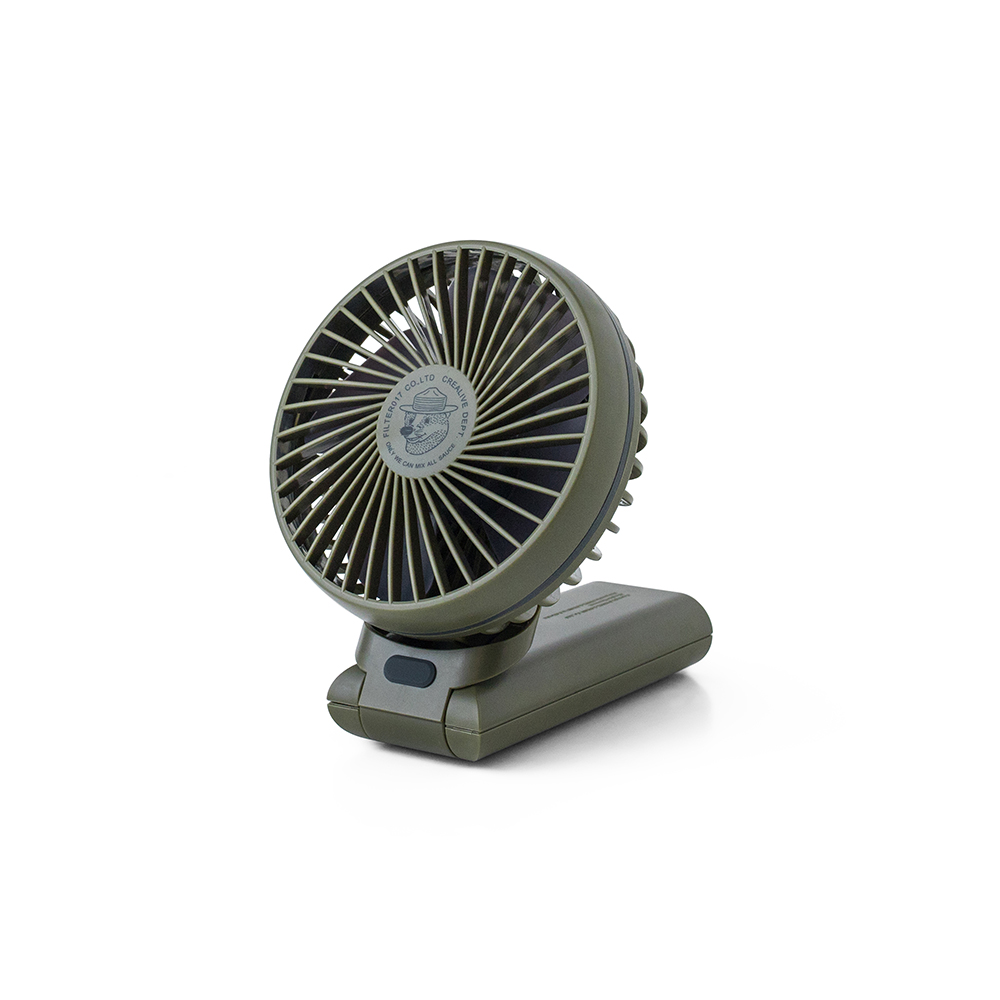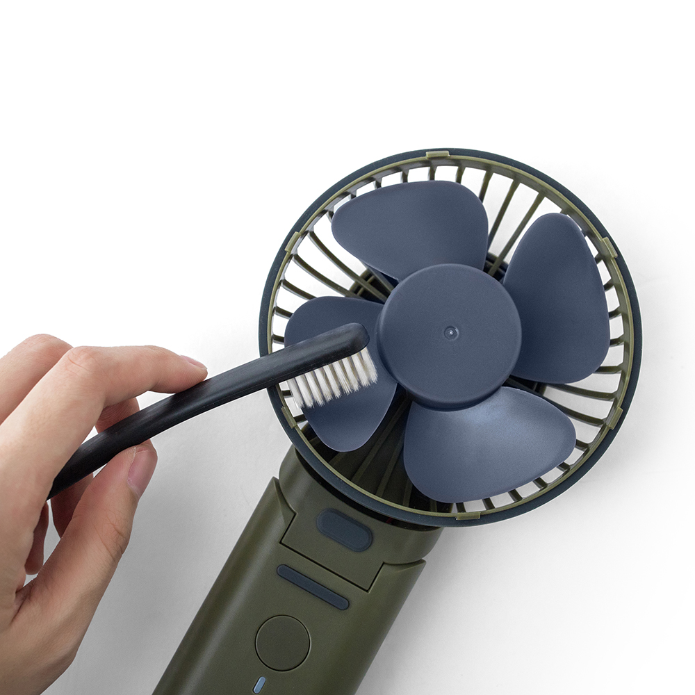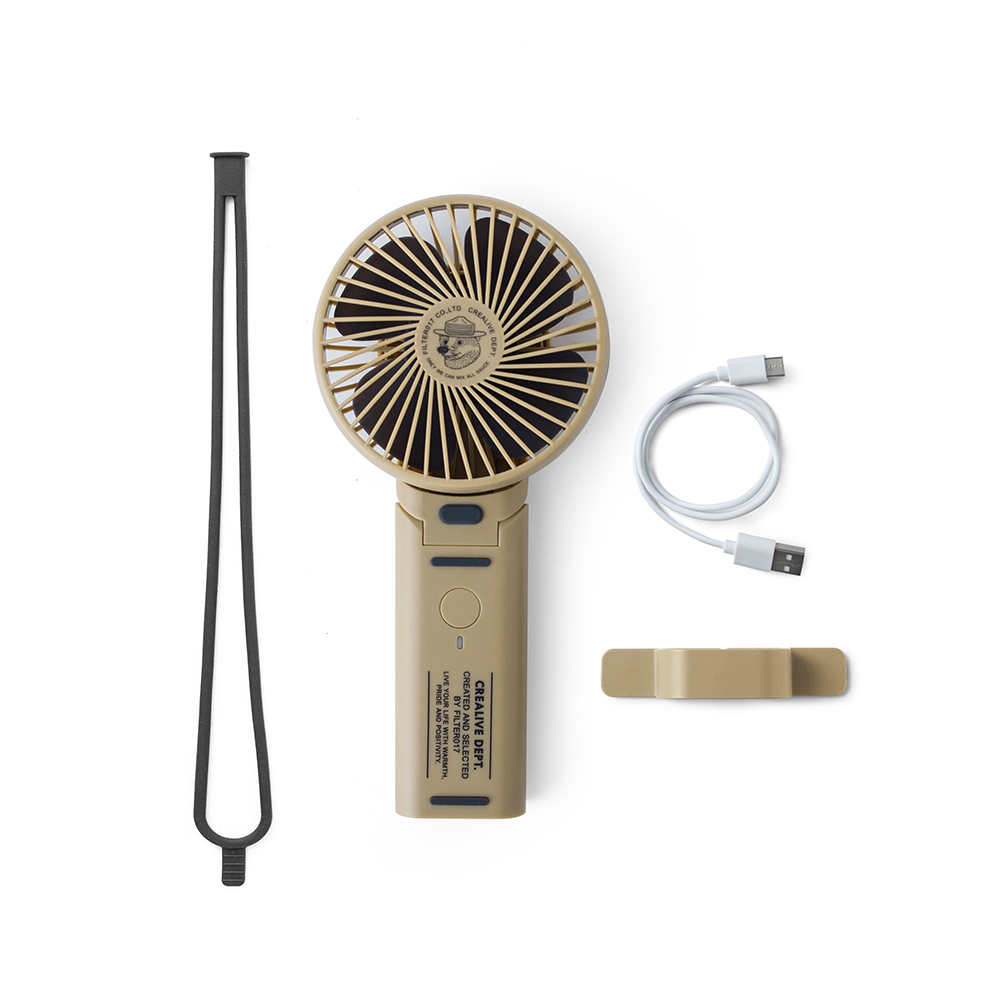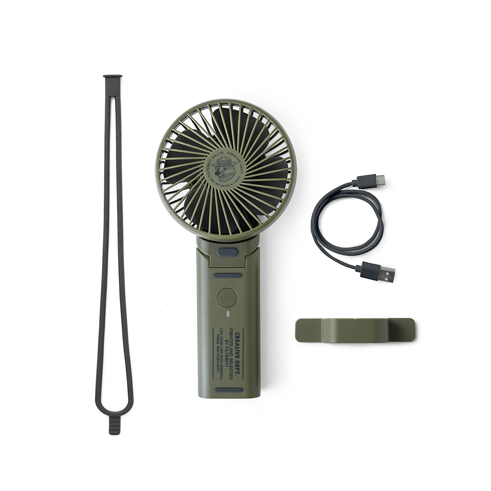 除一般手持使用外,搭配風扇前後5段的角度調節、不易使皮膚過敏的矽膠頸帶和固定架等配件,可掛於頸部或架於桌面作為桌扇使用。