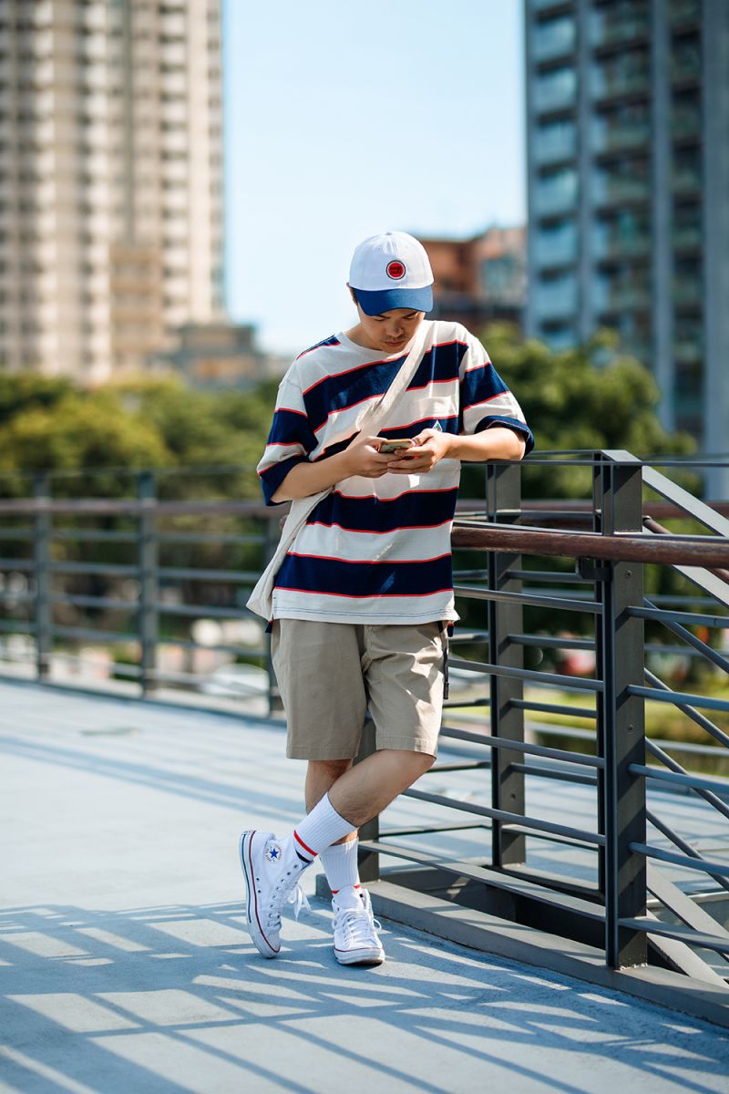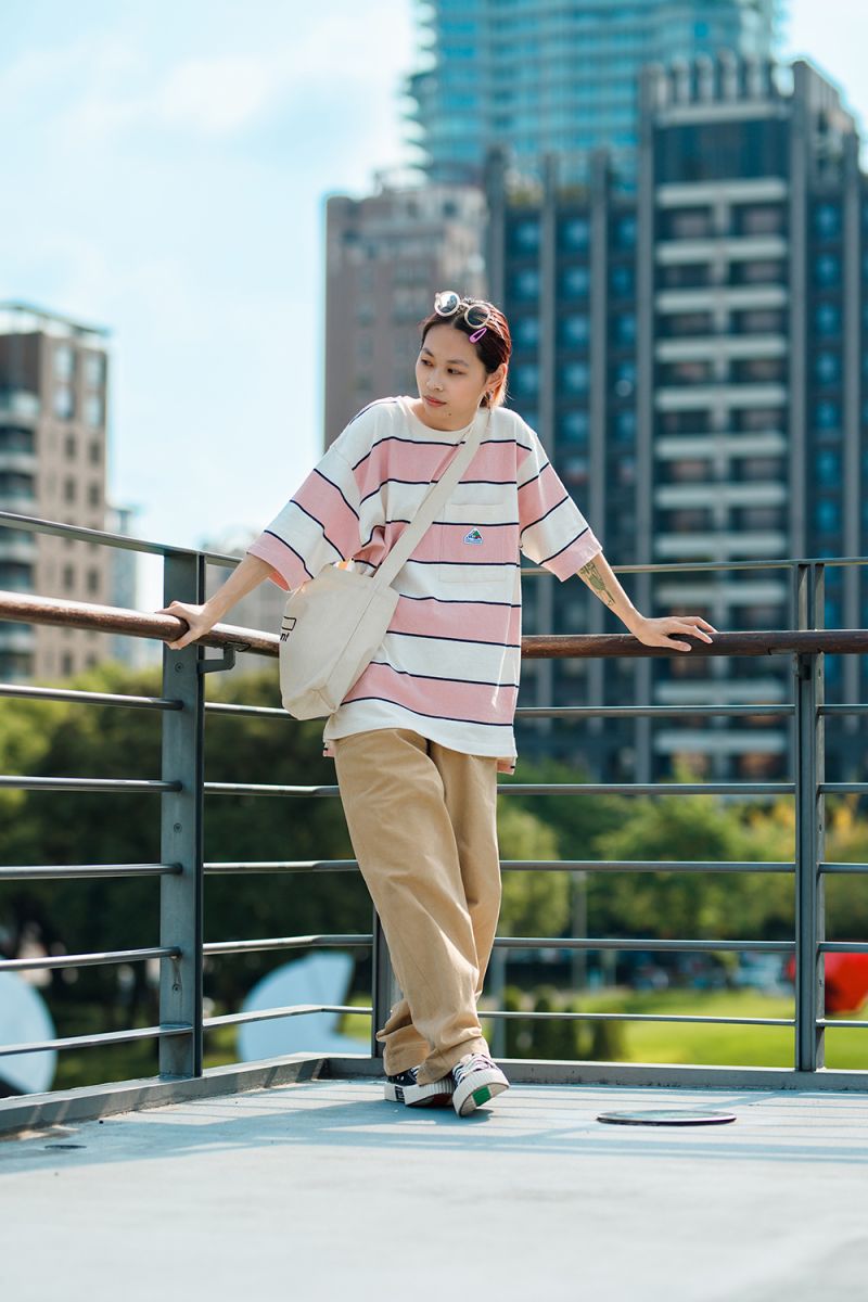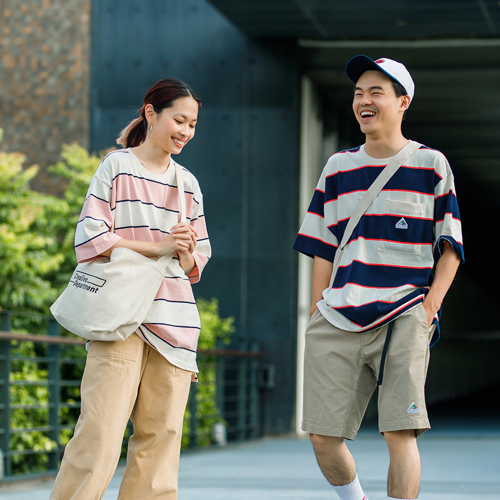 結合穿搭潮流中經典的條紋元素與寬鬆落肩版型設計,