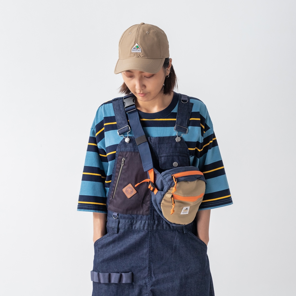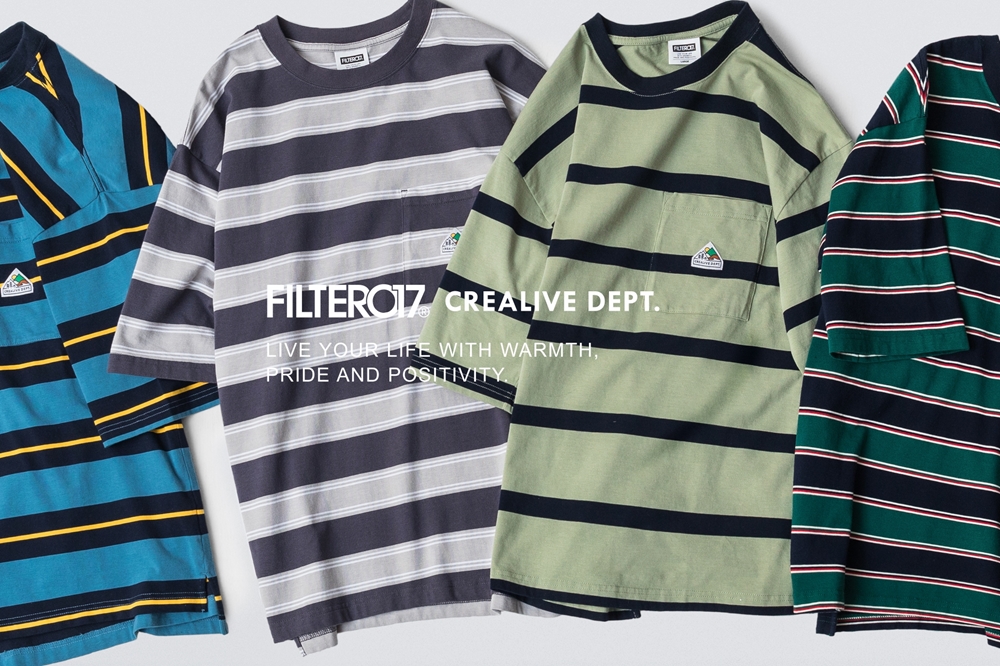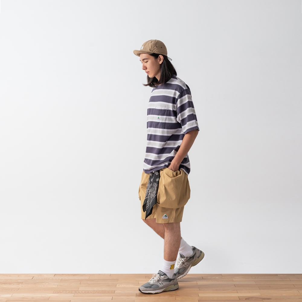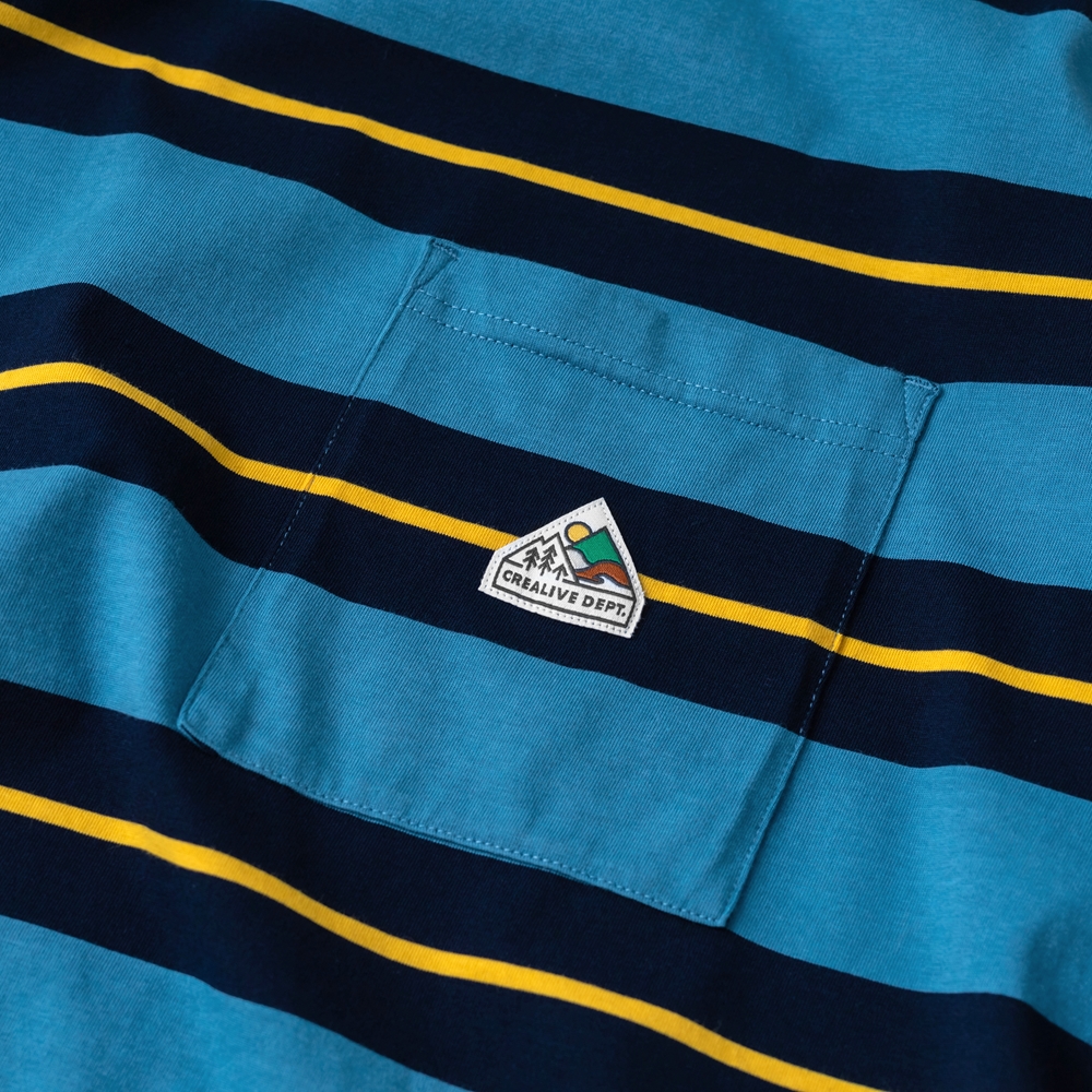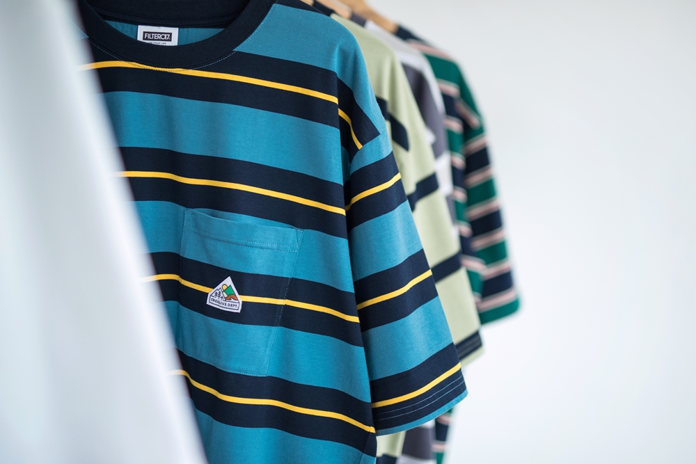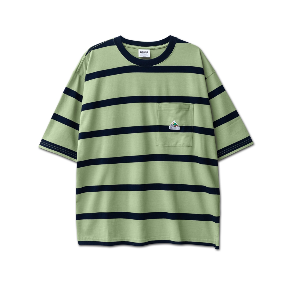 經典的條紋元素結合寬鬆落肩的T恤版型,胸前的口袋有品牌代表性的山峰標誌圖像點綴。