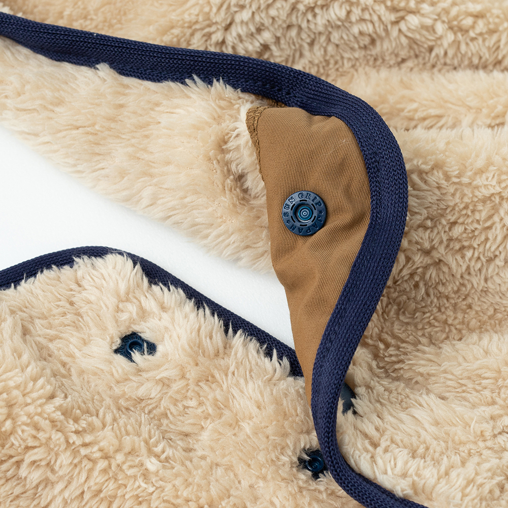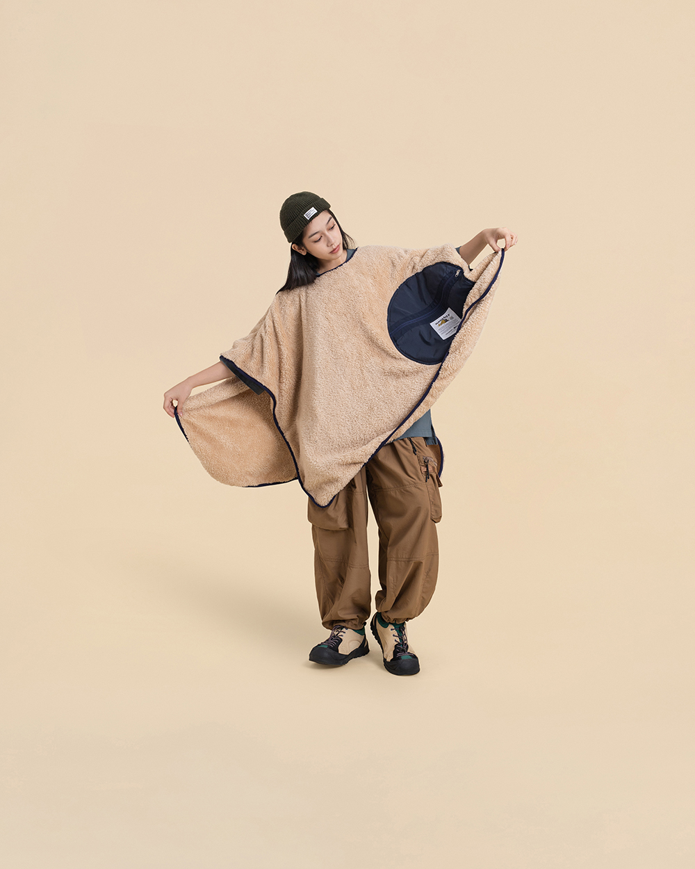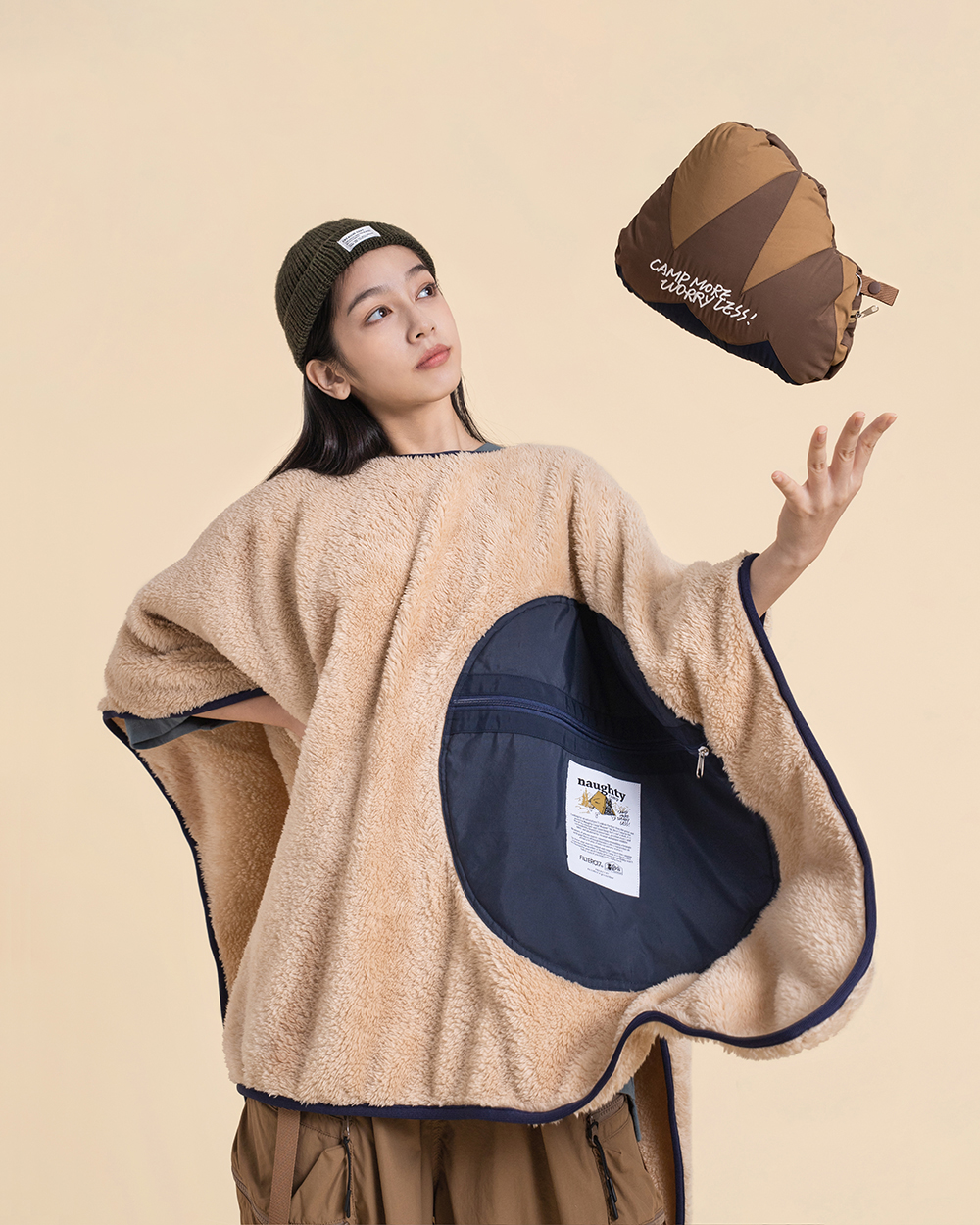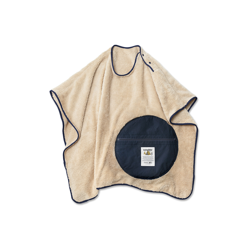 翻轉展開抱枕內裏,即搖身成為蓬鬆、且具保暖機能的絨毛毯,而毛毯中間的開口設計,亦可使毛毯作為套頭式披肩斗篷使用。