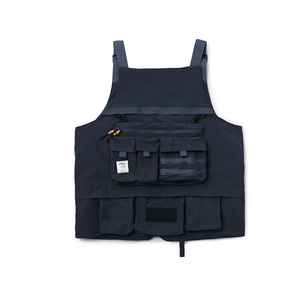 以grn outdoor品牌的定番人氣背心款式 - 「TEBURA VEST」作為藍本,以grn outdoor自行開發、復刻考究70年代戶外機能風格的「64混紡面料(Rokuyon Kurosu)」 製作,