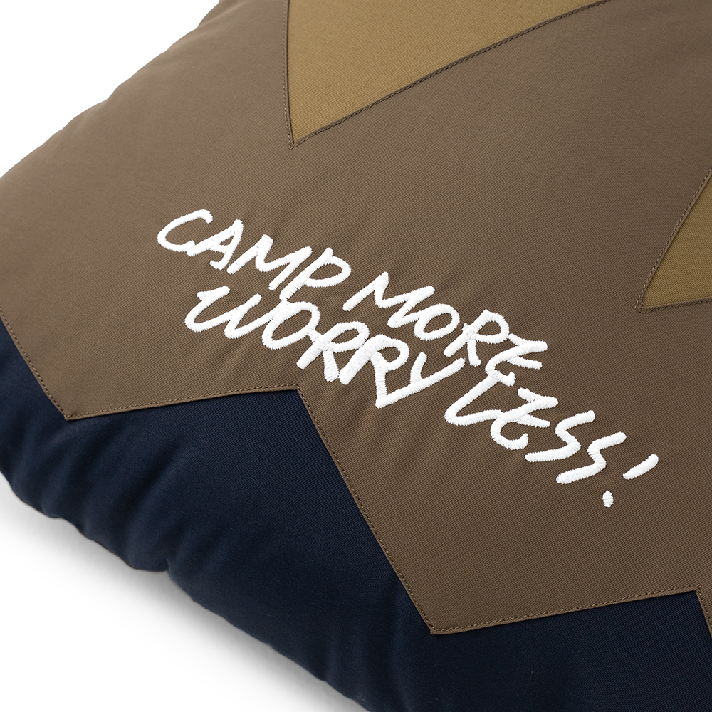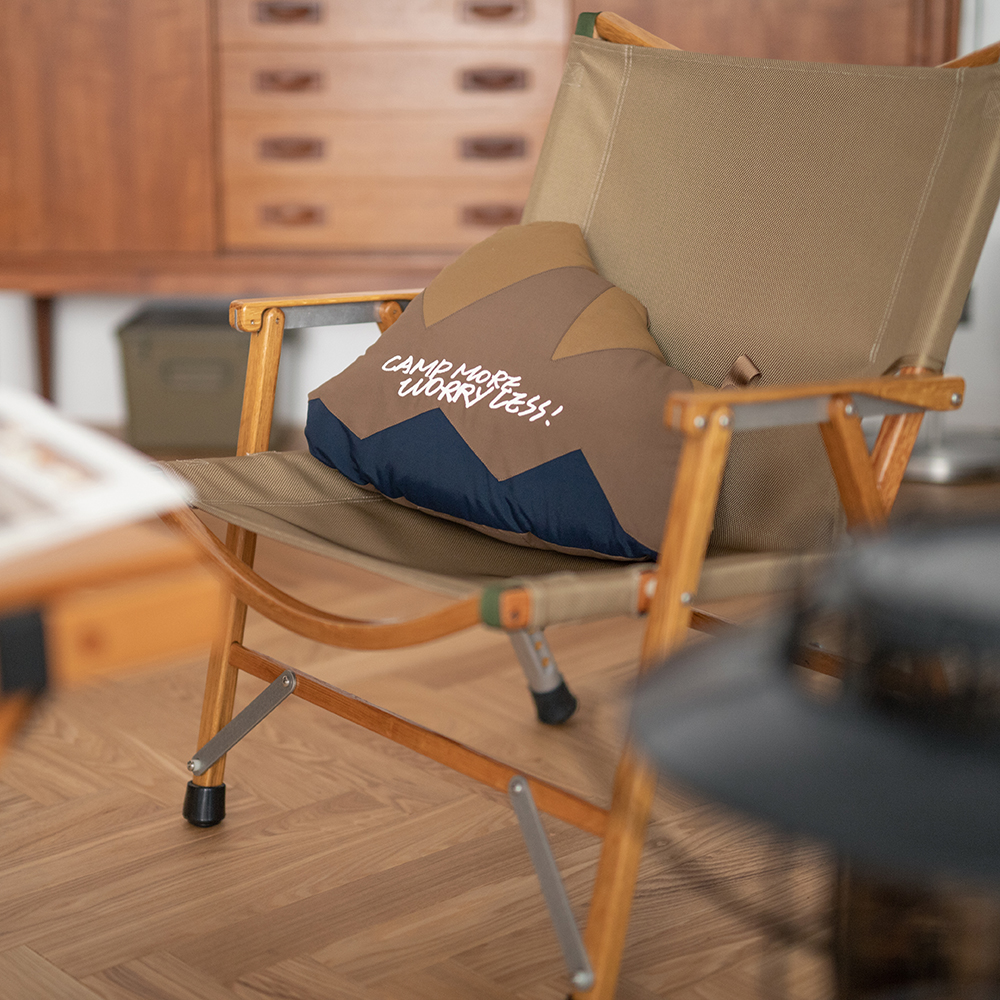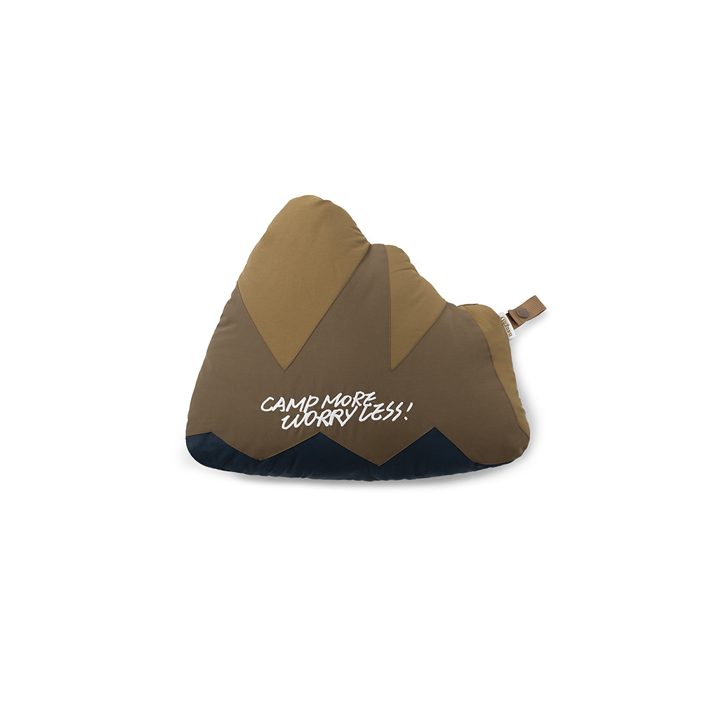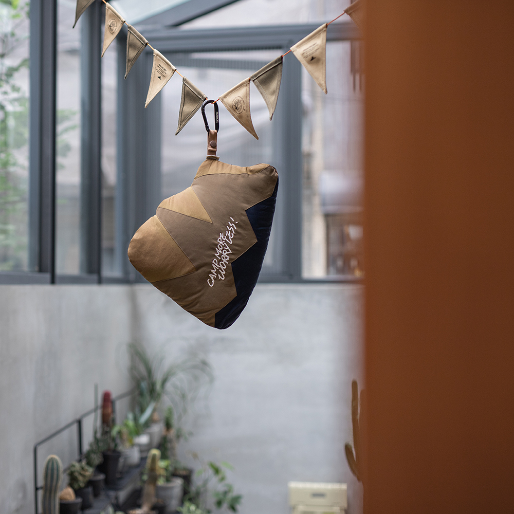以grn outdoor自行開發、復刻考究70年代戶外機能風格的「64混紡面料(Rokuyon Kurosu)」 製作的山峰造型抱枕,