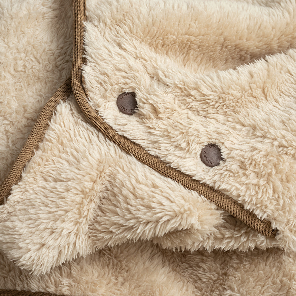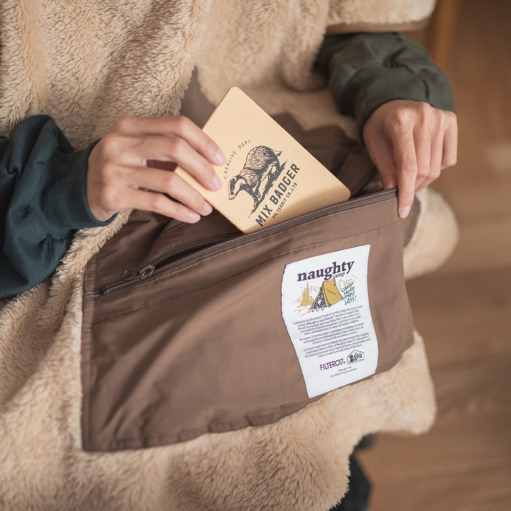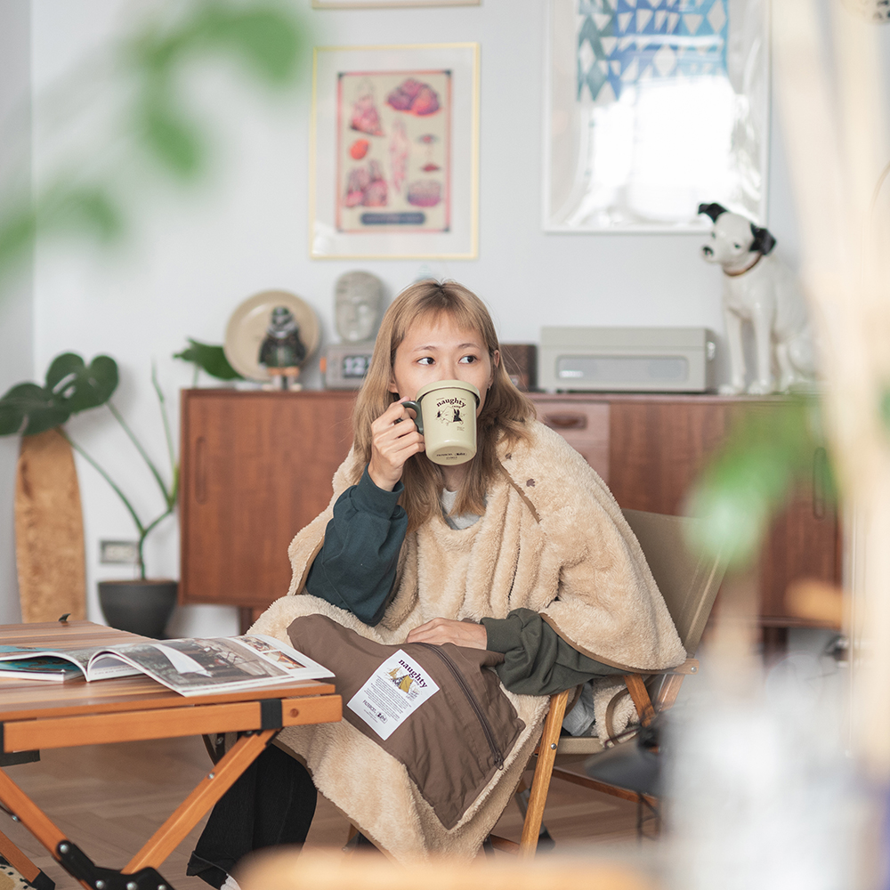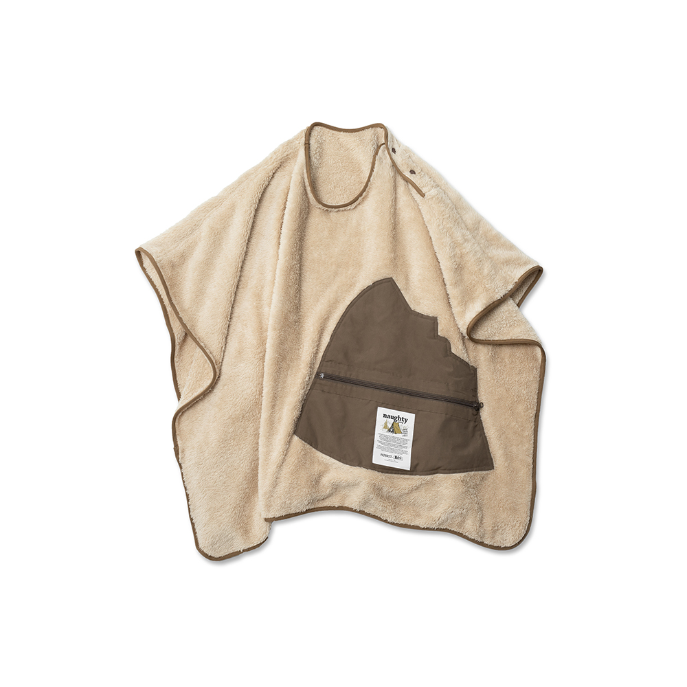 翻轉展開抱枕內裏,即搖身成為蓬鬆、且具保暖機能的絨毛毯,而毛毯中間的開口設計,亦可使毛毯作為套頭式披肩斗篷使用。