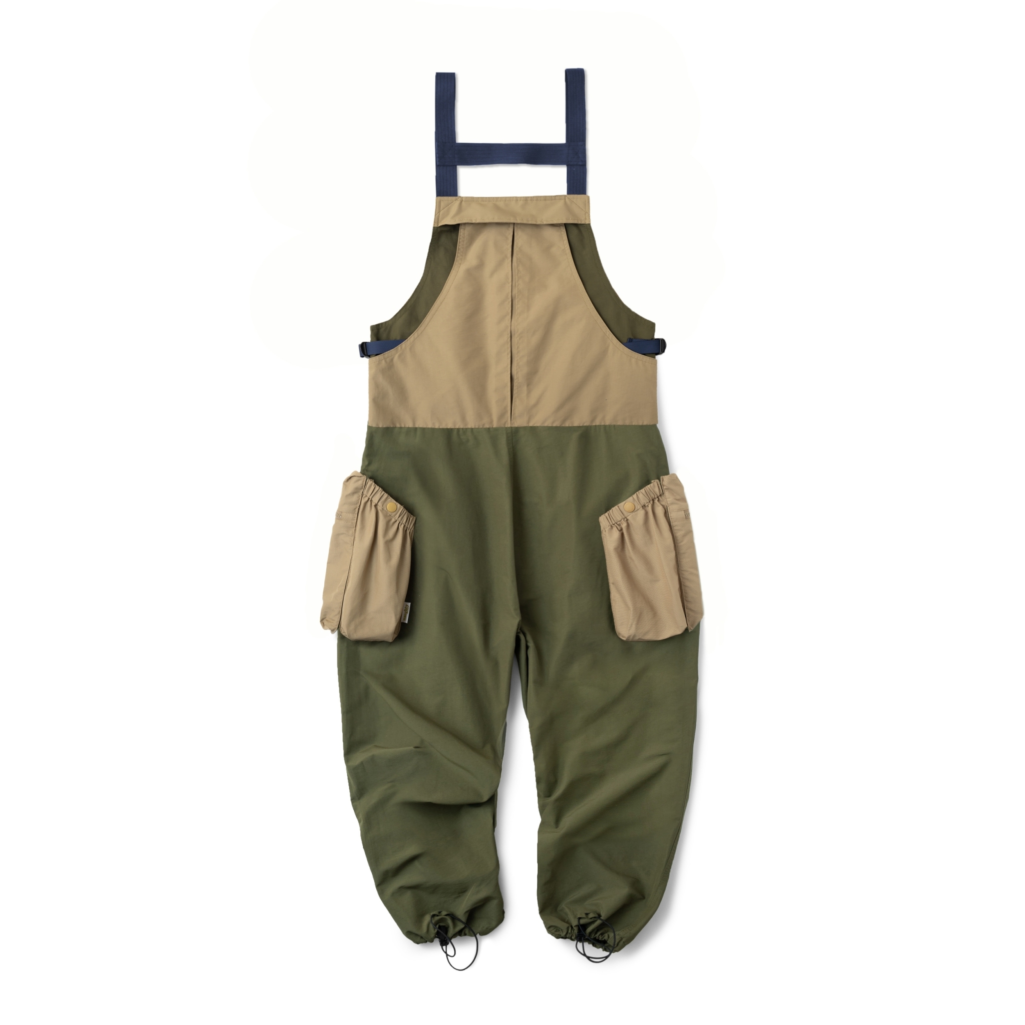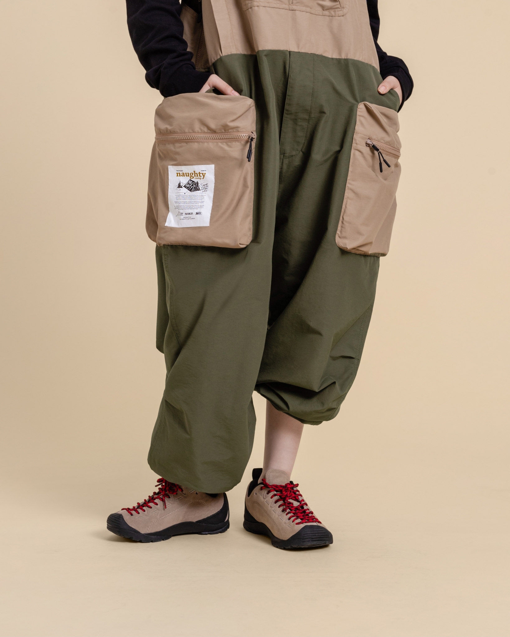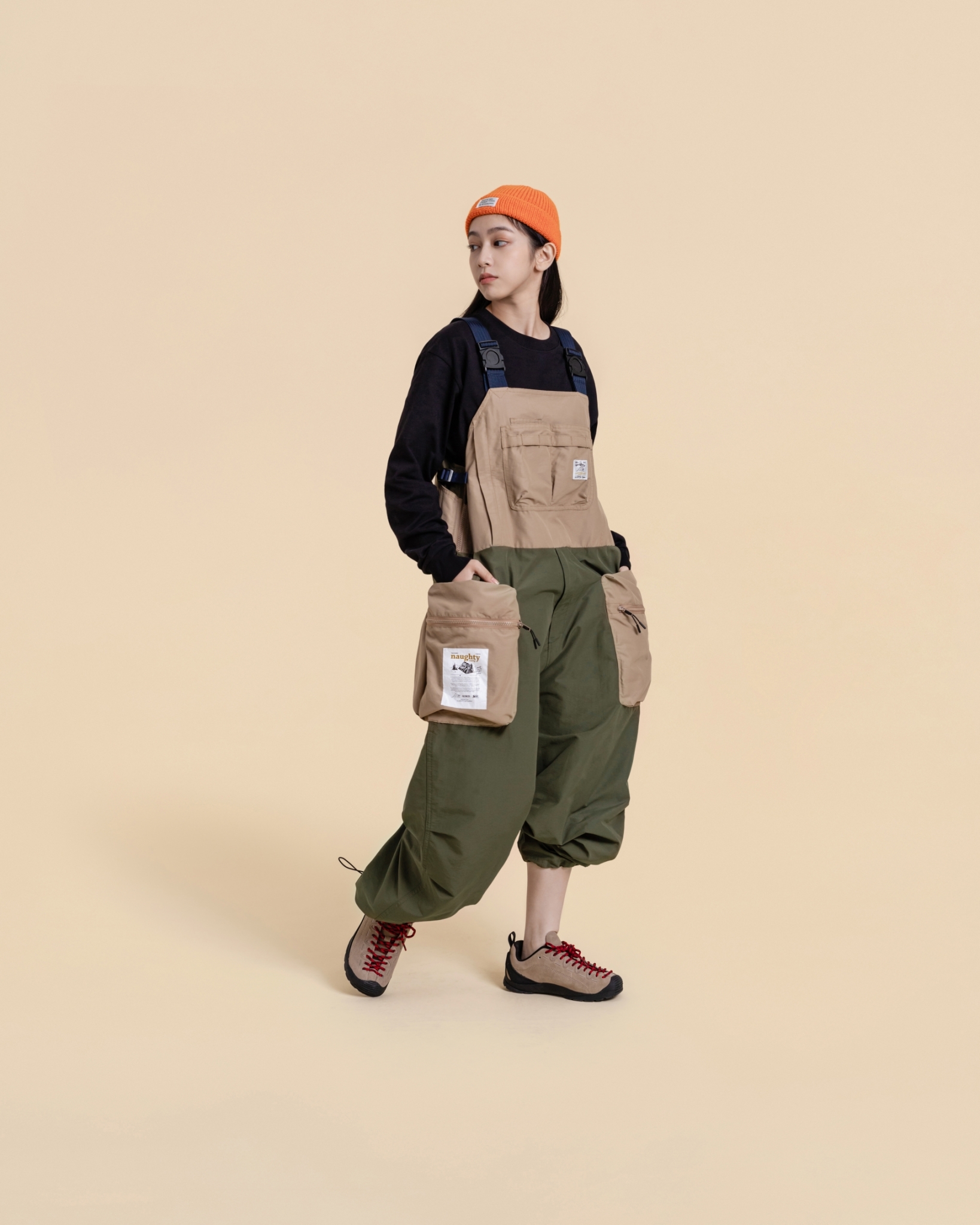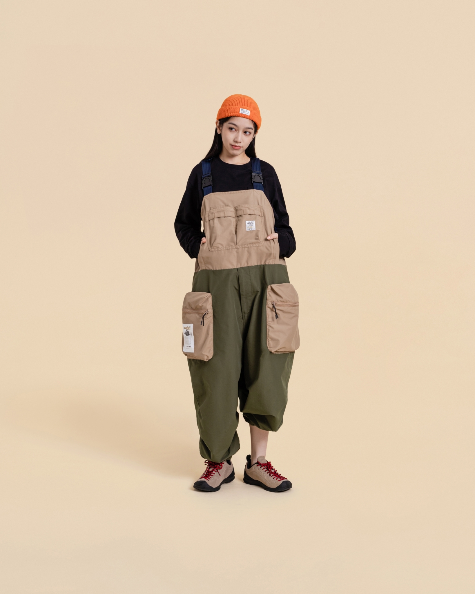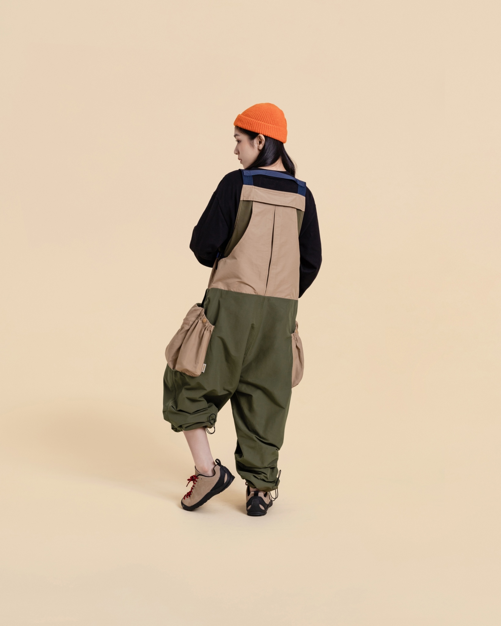 以70年代經典的吊帶連身工裝褲為基楚,加以揉合海軍甲板吊帶褲、獵裝背心的細節概念及版型,並將近年復古流行的繭型氣球褲剪裁輪廓巧妙結合,充分發揮品牌對於元素上獨到的混合玩味風格。