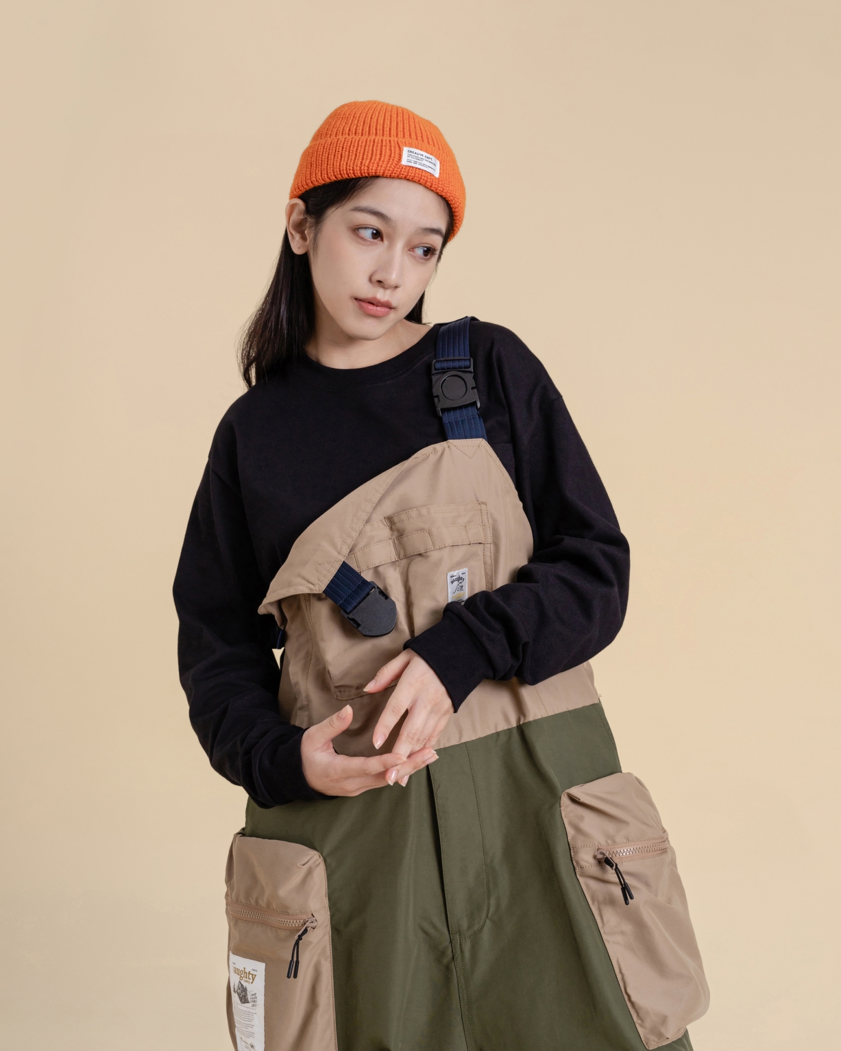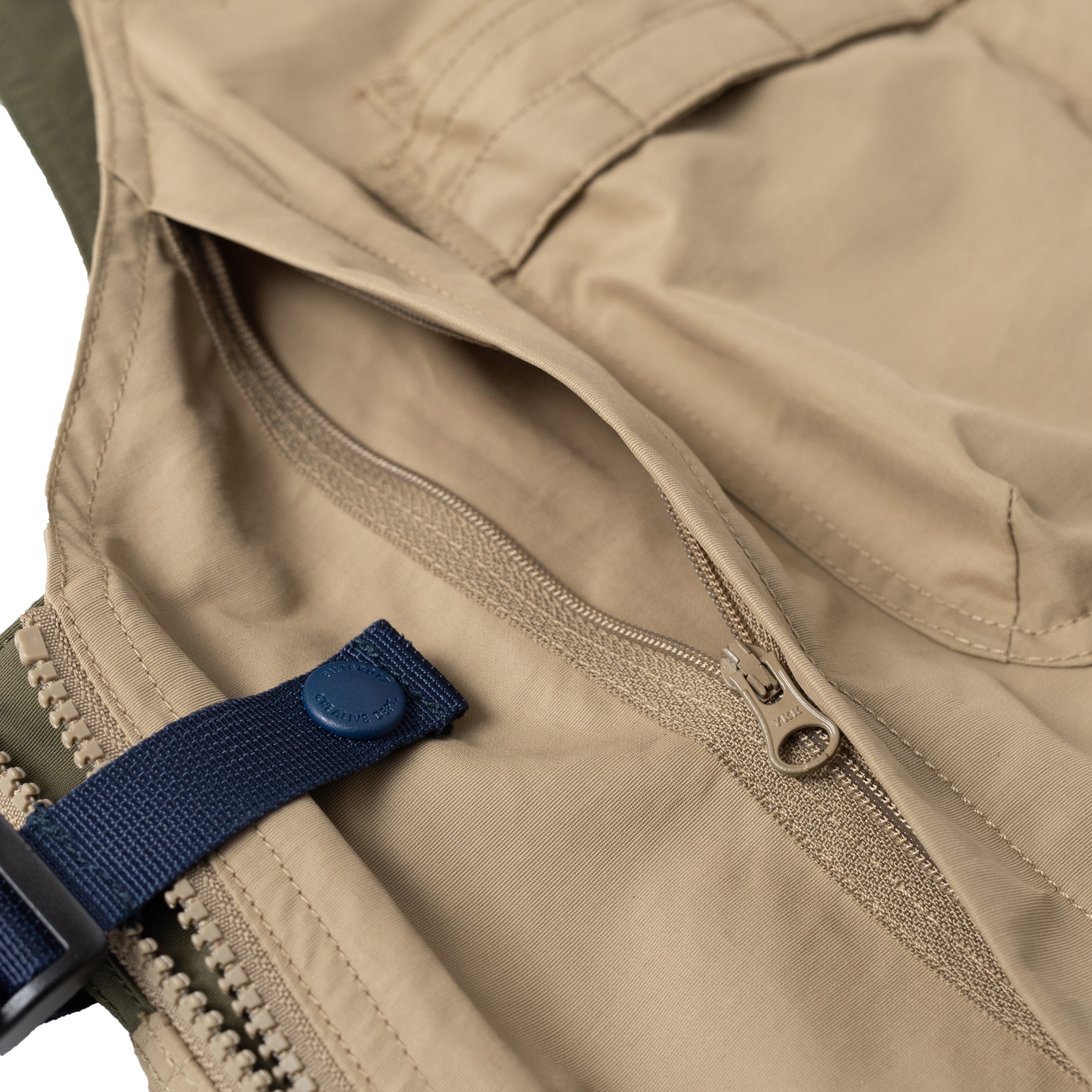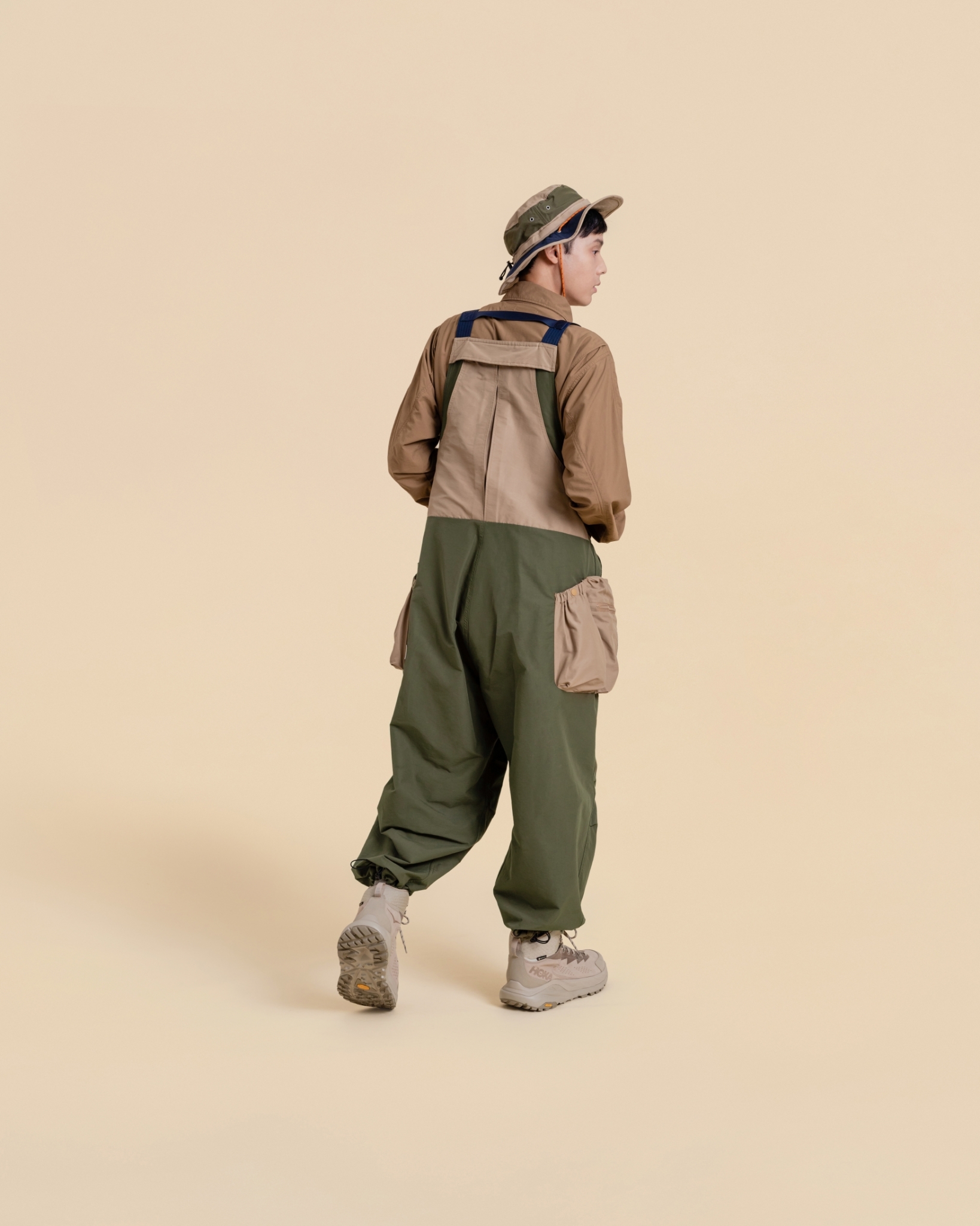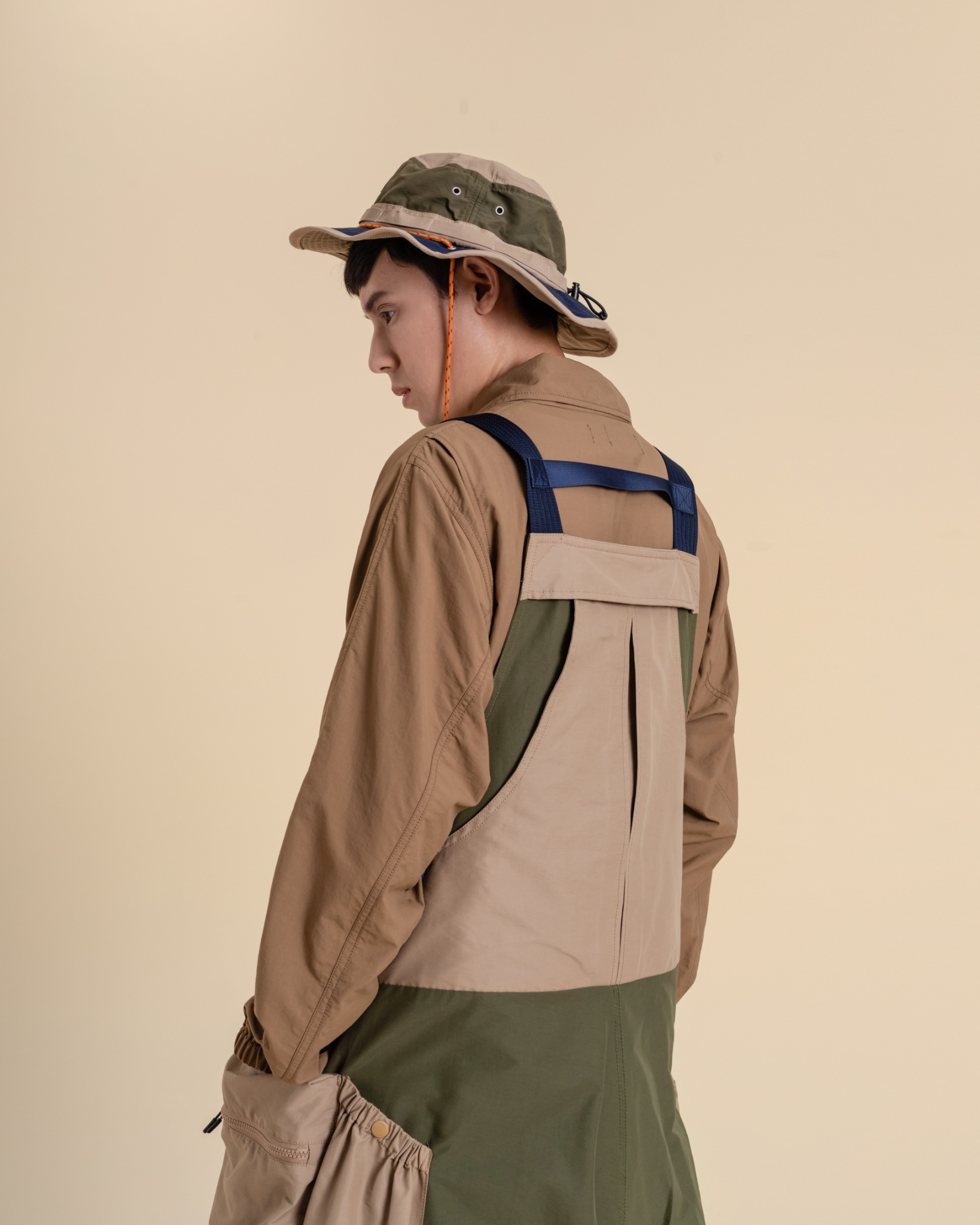 結合軍、工、獵裝的混合概念下呈現創意與飽滿的細節表現,於胸口、兩側配置規劃多重機能與實用性兼具的口袋及暗袋,背部則拼接融合改良自傳統獵裝背心中放置獵物、工具用途的扇型背袋設計,在視覺與功能上更層次。