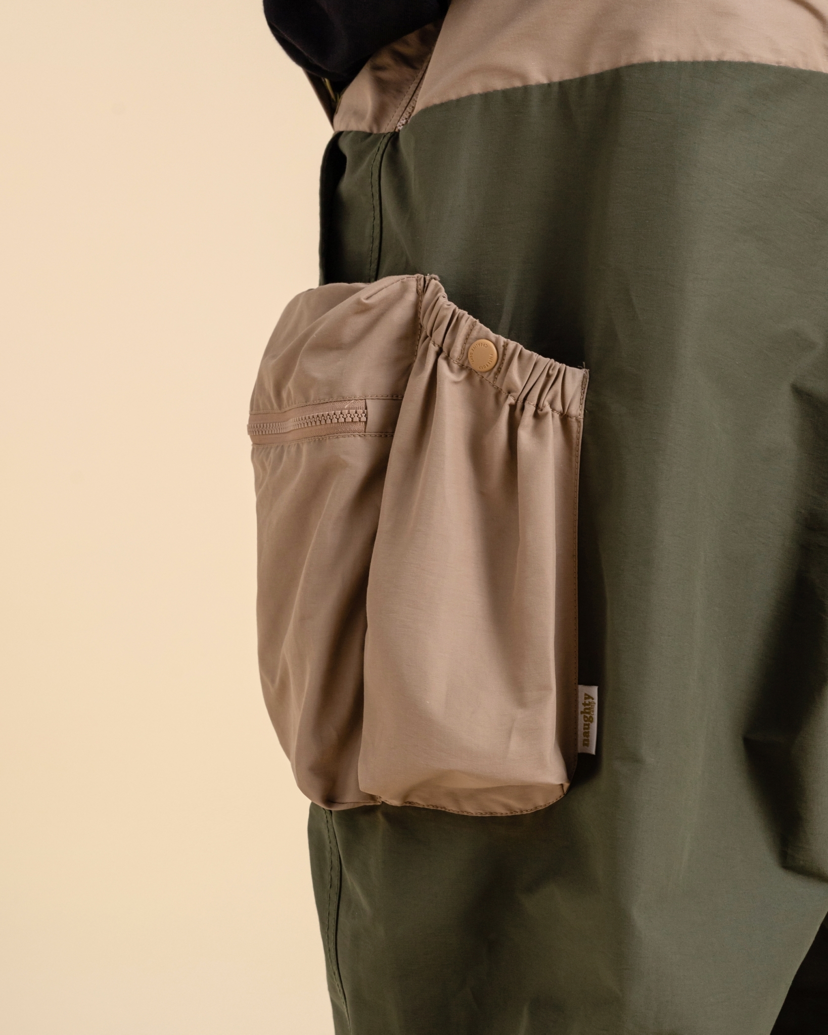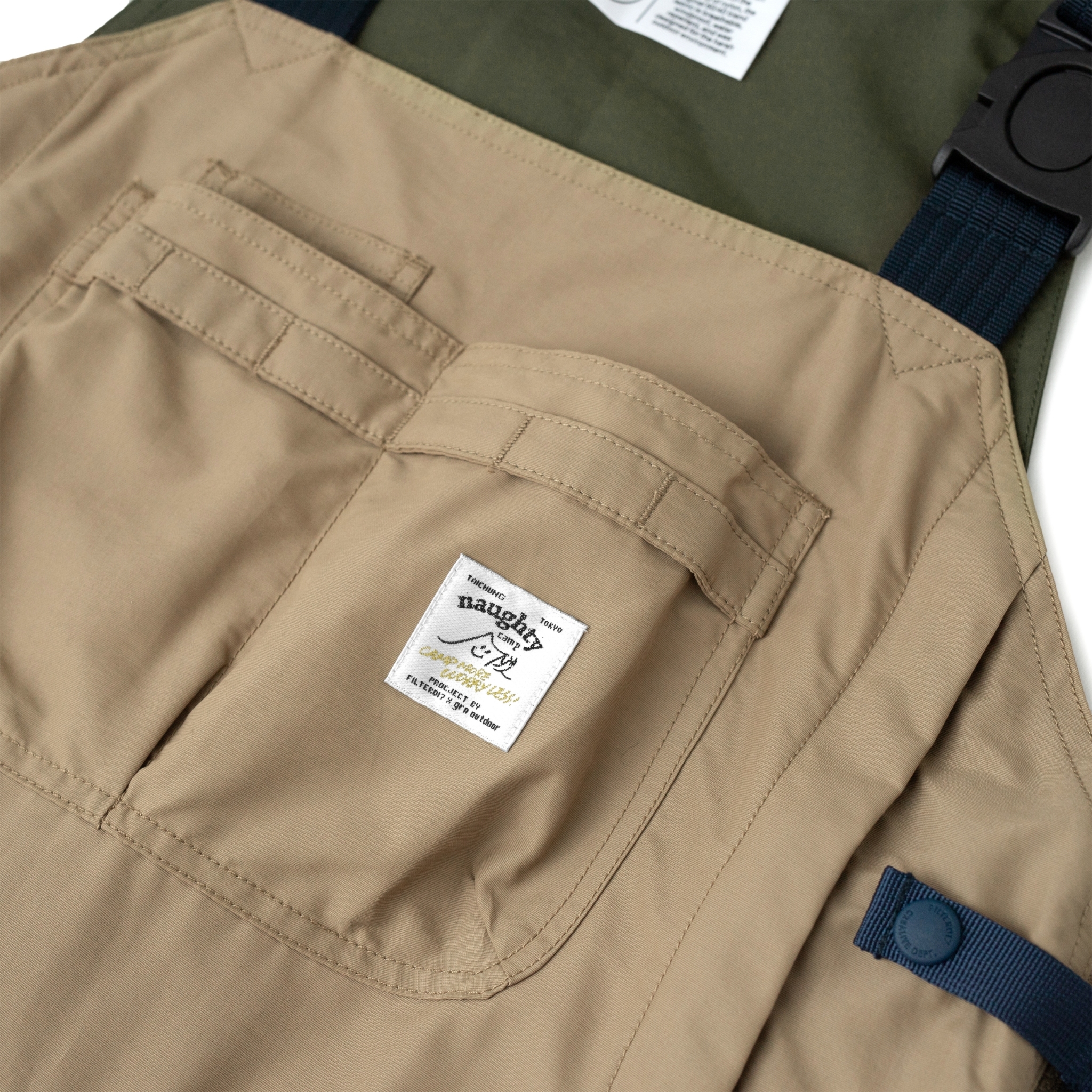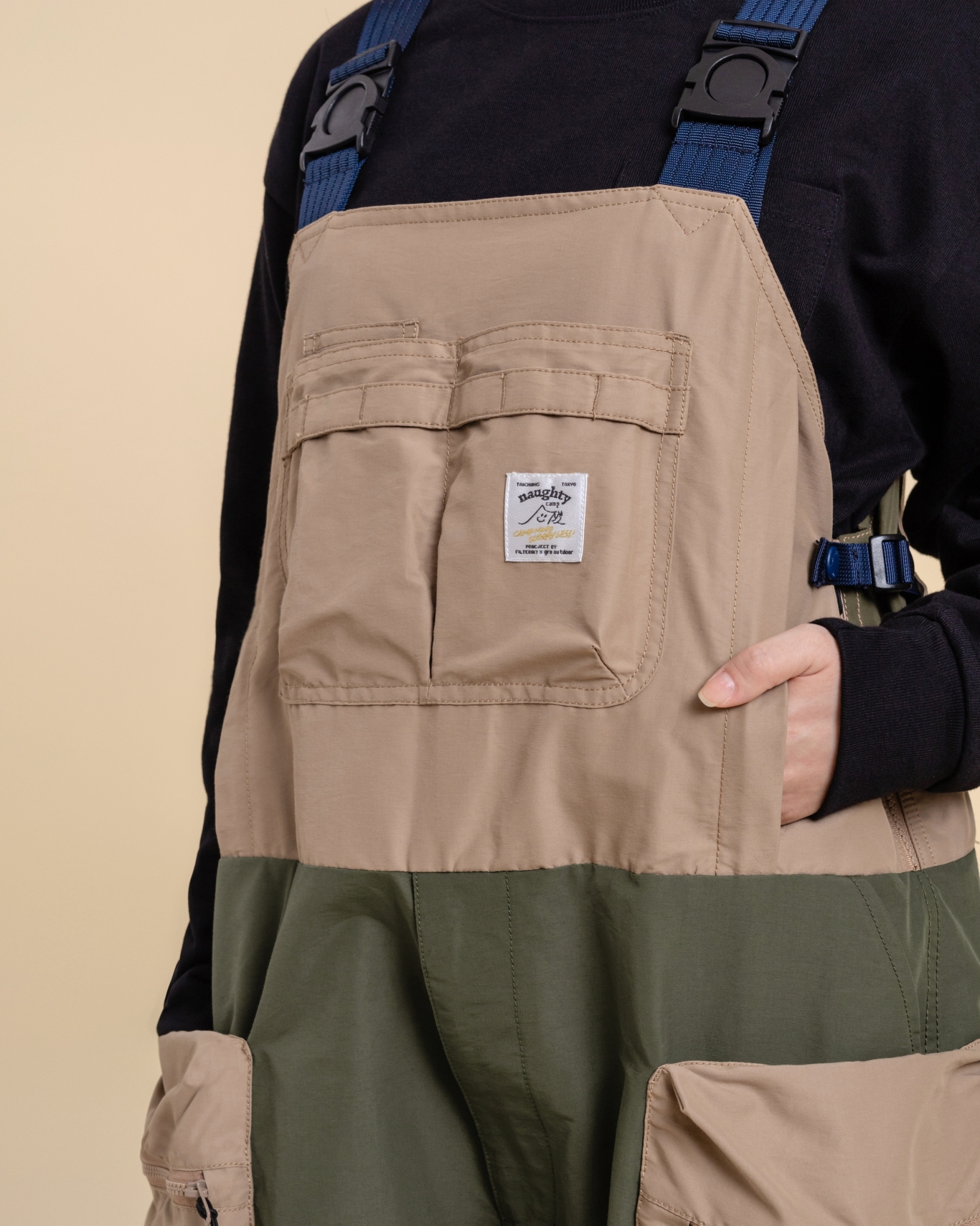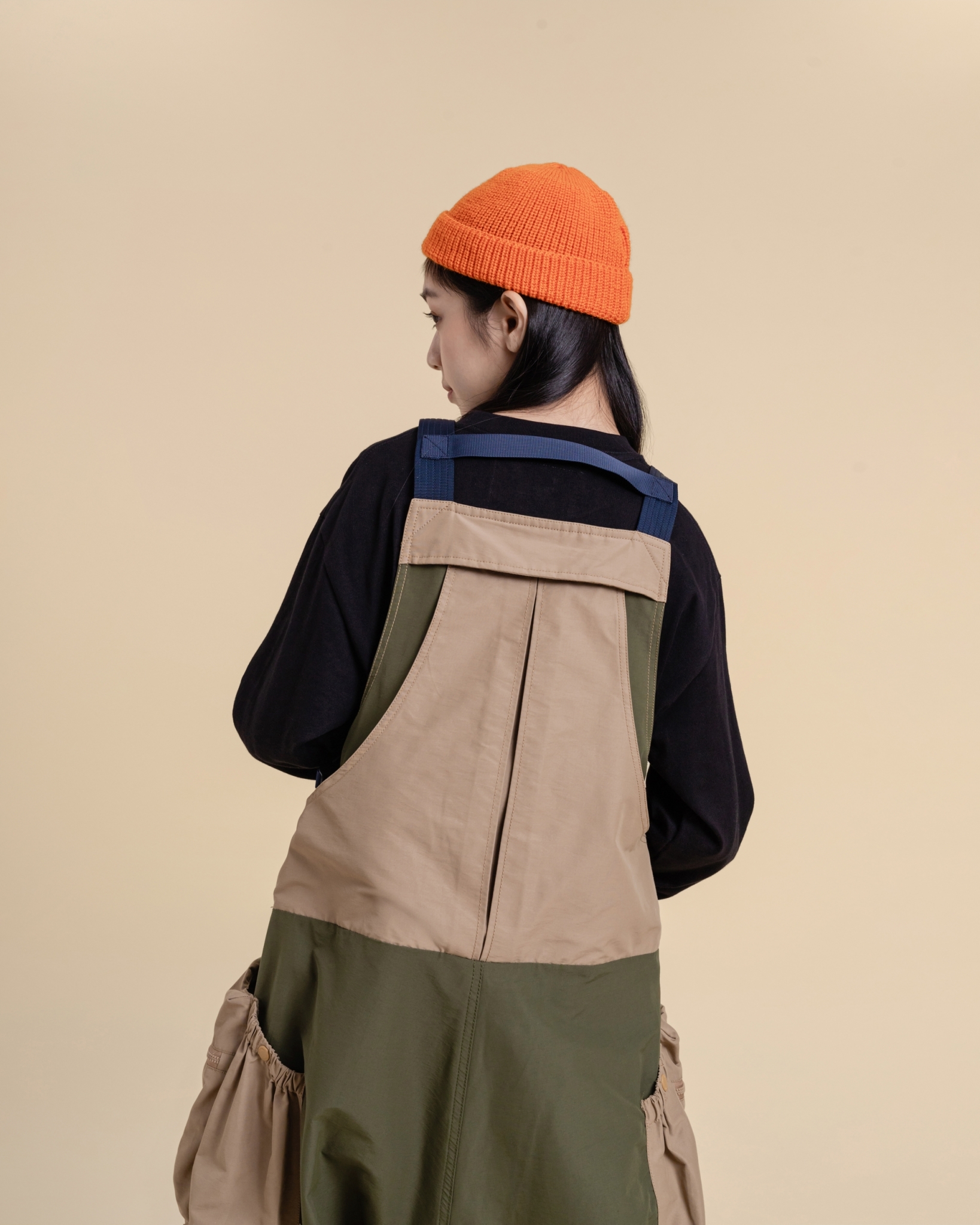 結合軍、工、獵裝的混合概念下呈現創意與飽滿的細節表現,於胸口、兩側配置規劃多重機能與實用性兼具的口袋及暗袋,背部則拼接融合改良自傳統獵裝背心中放置獵物、工具用途的扇型背袋設計,在視覺與功能上更層次。
